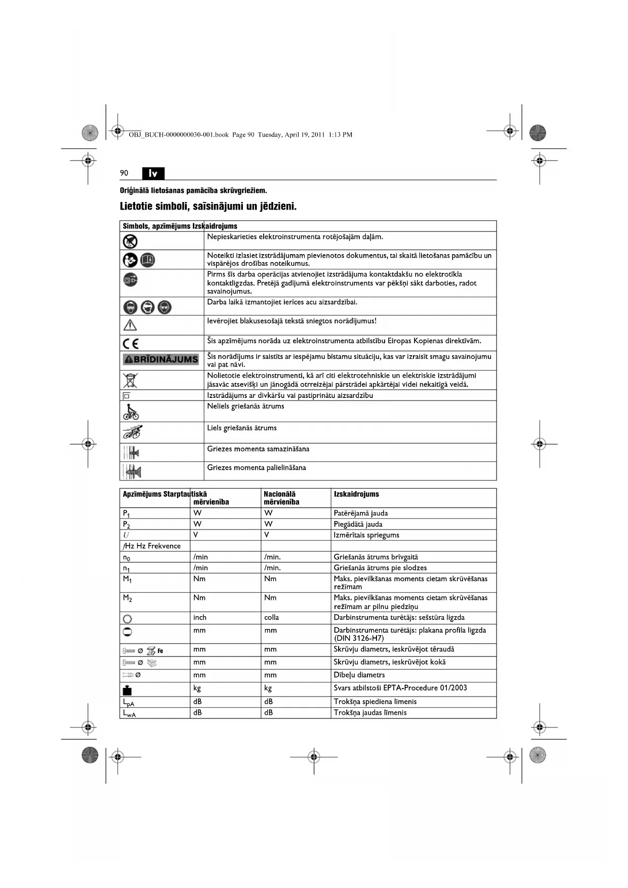 Oriģinālā lietošanas pamācība skrūvgriežiem. Lietotie simboli, saīsinājumi un jēdzieni. Simbols, apzīmējums Izskaidrojums Nepieskarieties elektroinstrumenta rotējošajām daļām. Noteikti izlasiet izstrādājumam pievienotos dokumentus, tai skaitā lietošanas pamācību un vispārējos drošības noteikumus. Pirms šīs darba operācijas atvienojiet izstrādājuma kontaktdakšu no elektrotīkla kontaktligzdas. Pretējā gadījumā elektroinstruments var pēkšņi sākt darboties, radot savainojumus. Darba laikā izmantojiet ierīces acu aizsardzībai. Ievērojiet blakusesošajā tekstā sniegtos norādījumus! Šis apzīmējums norāda uz elektroinstrumenta atbilstību Eiropas Kopienas direktīvām. Šis norādījums ir saistīts ar iespējamu bīstamu situāciju, kas var izraisīt smagu savainojumu vai pat nā vi. Nolietotie elektroinstrumenti, kā arī citi elektrotehniskie un elektriskie izstrādājumi jāsavāc atsevišķi un jānogādā otrreizējai pārstrādei apkārtējai videi nekaitīgā veidā. Izstrādājums ar divkāršu vai pastiprinātu aizsardzību Neliels griešanās ātrums Liels griešanās ātrums Griezes momenta samazināšana Griezes momenta palielināšana Apzīmējums Starptautiskā mērvienība Nacionālā mērvienība Izskaidrojums