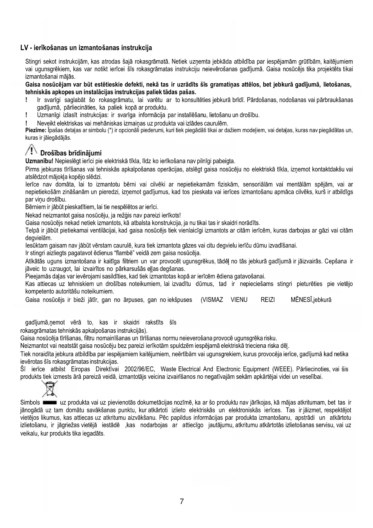 vai ugunsgrēkiem, kas var notikt ierīcei šīs rokasgrāmatas instrukciju neievērošanas gadījumā. Gaisa nosūcējs tika projektēts tikai
