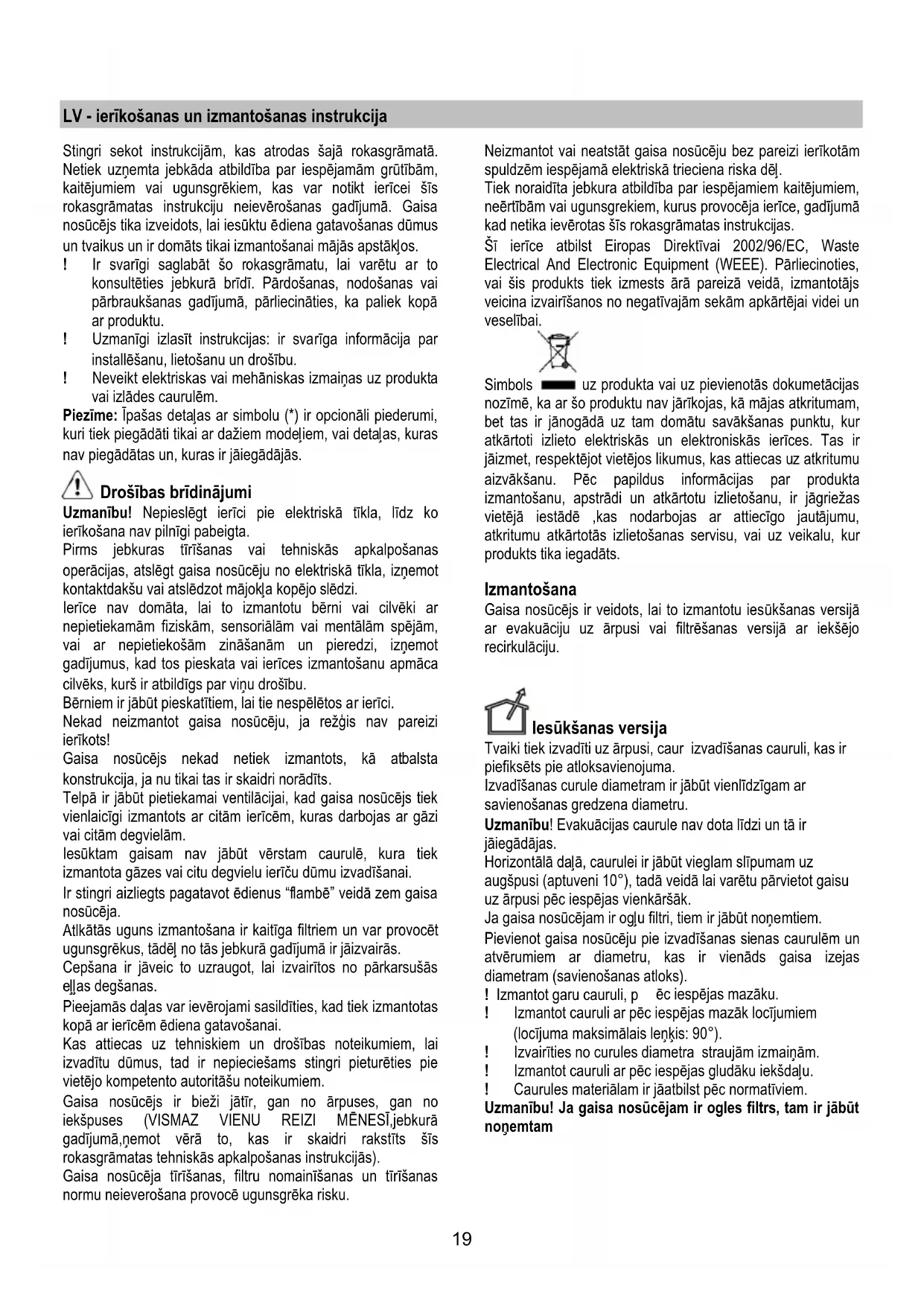 ar evakuāciju uz ārpusi vai filtrēšanas versijā ar iekšējo