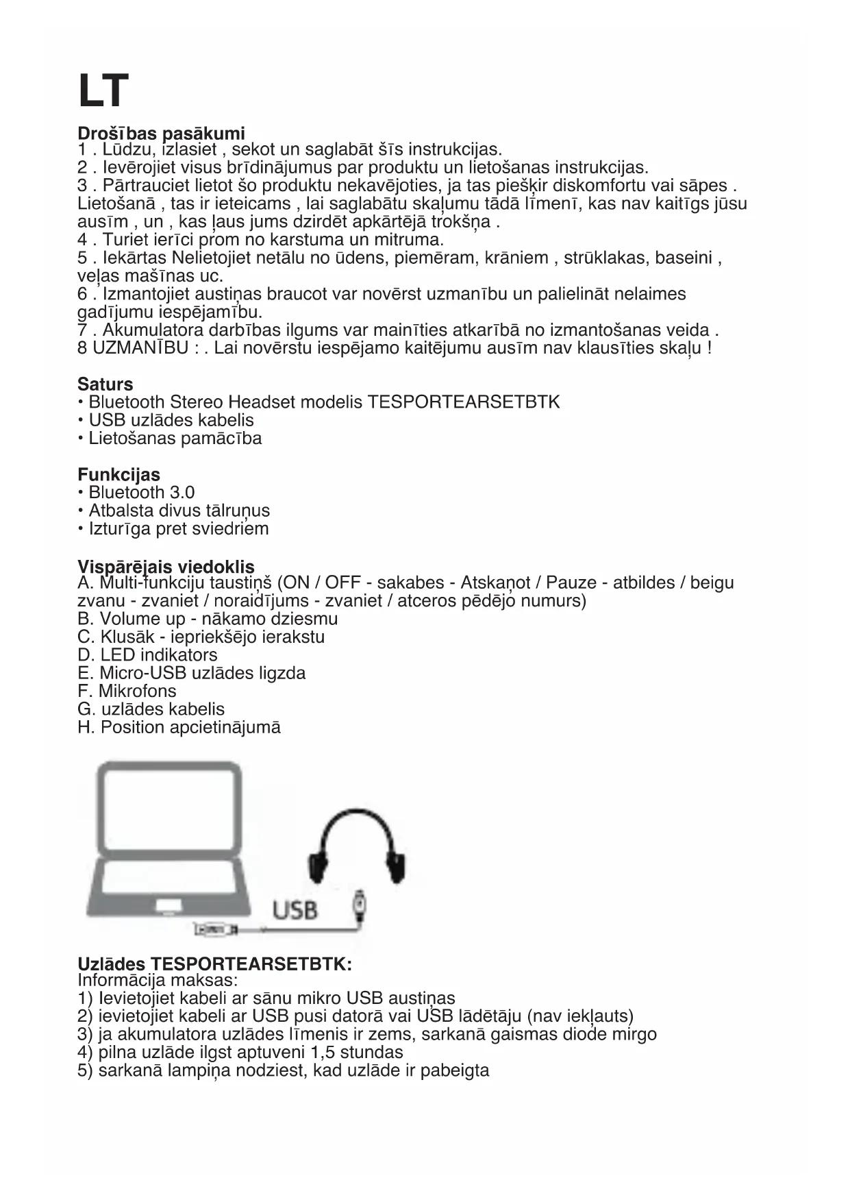 - Izturīga pret sviedriem Vispārējais viedoklis A. Multi-funkciju taustiņš (ON / OFF - sakabes - Atskaņot / Pauze - atbildes / beigu zvanu - zvaniet / noraidījums - zvaniet / atceros pēdējo numurs) B. Volume up - nākamo dziesmu C. Klusāk - iepriekšējo ierakstu D. LED indikators E. Micro-USB uzlādes ligzda F. Mikrofons G. uzlādes kabelis H. Position apcietinājumā Charging the TESPORTEARSETBTK Uzlādes TESPORTEARSETBTK: Informācija maksas: