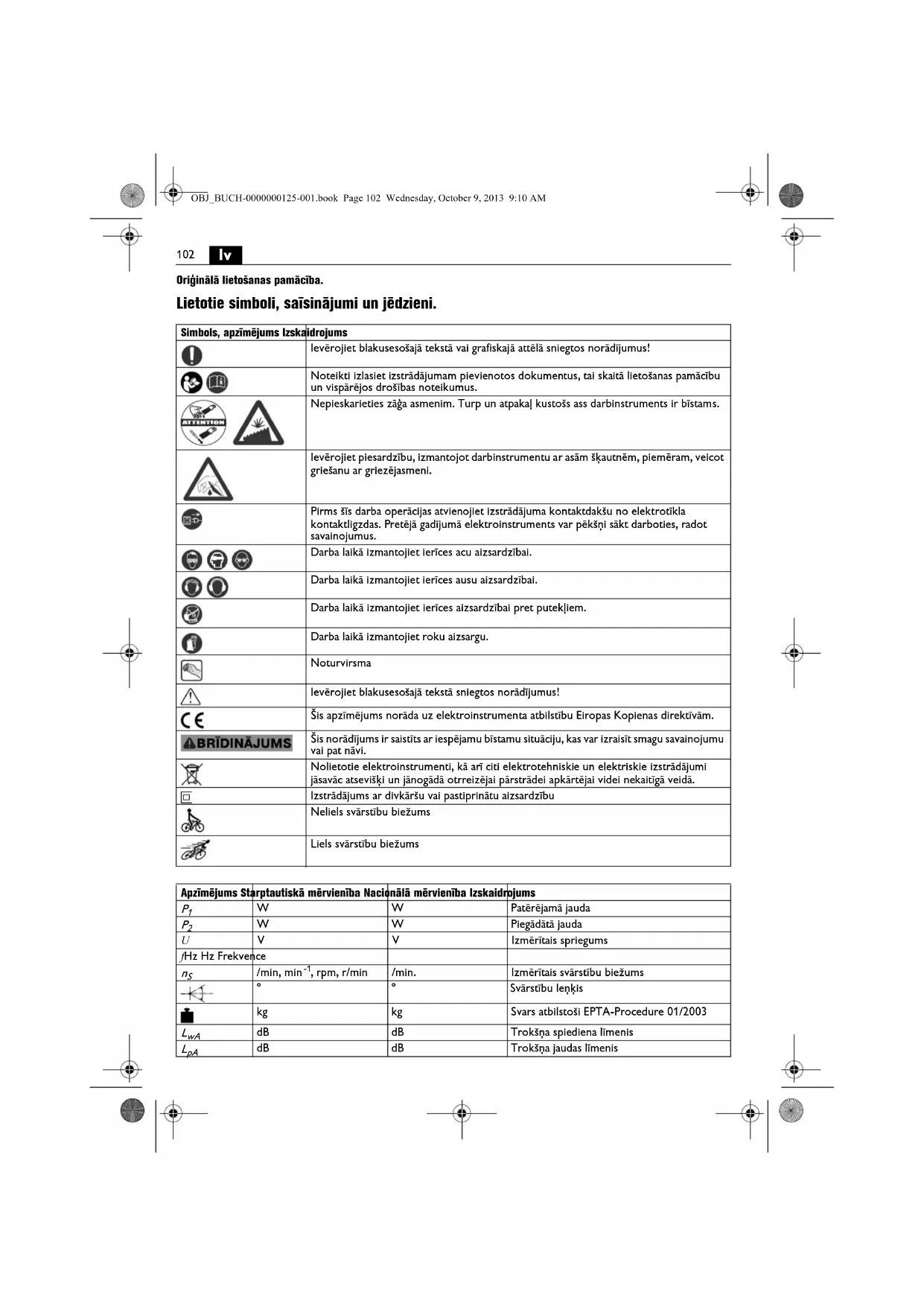| m, s, kg, A, mm, V, W, Hz, N, °C, dB, min, m/s2 | m, s, kg, A, mm, V, W, Hz, N, °C, dB, min., m/s2 | Pamata un atvasinātās mērvienības atbilst starptautiskajai mērvienību sistēmai SI. | |