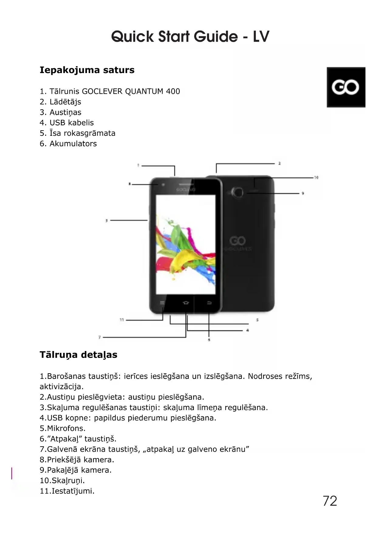 Quick Start Guide - LV 72Kā demontēt pakaļējo vāciņu un izņemt akumulatoru Pakaļējā vāciņa demontāža: stringri turot ar vienu roku aiz ierīces malas, ar otro roku paceliet pakaļējo vāciņu pie ksatora. Akumulatora izņemšana: stringri turot ar vienu roku aiz ierīces malām, ar otro roku izņemiet akumulatoru, paceļot no apakšas. Kā ievietot SIM un microSD™ kartes a. SIM kartes ievietošana Labā ligzda ir GSM kartes ligzda, taču kreisā ligzda ir paredzēta 3G WCD- MA kartei, kas ir saderīga ar 2G standartu. Lai ievietotu karti, viegli ie- bīdiet to attiecīgajā ligzdā. Pārliecinieties, ka SIM kartes pieslēgvieta ar zeltu kontaktu ir pavērsta uz lēju. Lai izņemtu karti, viegli izbīdiet to no ligzdas. b. microSD™ kartes ievietošana Lai ievietotu karti, viegli iebīdiet to attiecīgajā ligzdā. Pārliecinieties, ka microSD™ kartes pieslēgvieta ar zeltu kontaktu ir pavērsta uz lēju. Lai izņemtu karti, viegli izbīdiet to no ligzdas. Lādēšana Pievienojiet USB kabeli ierīces USB kopnei un pievienojiet lādētāju elek- trotīkla kontaktligzdai. Pilna akumulatora uzlāde tiek veikta ap. 3,5 st. Lietojot ierīci lādēšanas laikā, uzlādes laiks var būt ilgāks. Quick Start Guide - LV 73Quick Start Guide - LV Piezīme: Ja tālrunis netiek lietots ilgāku laiku, akumulators pakāpeni- ski izlādējas. Akumulatoru nepieciešams uzlādēt pirms pirmās lietošanas vai, pat ja tālrunis netiek lietots, atkārtot uzlādi katrus 3 mēnešus. Ierīces ieslēgšana / izslēgšana / nodroses režīms Nospiediet ir pieturiet barošanas taustiņu dažas sekundes. Parādīsies starta ekrāns, pēc tam galvenais ekrāns. Nospiežot vienu reizi, ierīce pārslēdzas nodroses režīmā. Lai pabeigtu šo režīmu, vēlreiz nospiediet barošanas taustiņu. Lai izslēgtu ierīci, nospiediet un pieturiet barošanas taustiņu, pēc tam no izvēlnes izvēlieties Power o opciju. ATBILSTĪBAS SERTIFIKĀTS - ES VALSTĪS Ar šo GOCLEVER Sp. z o.o. apliecina, ka ierīce GOCLEVER QUANTUM 400 atbilst zemāk norādīto direktīvu būtiskajām prasībām un citiem atbil- stošiem noteikumiem: