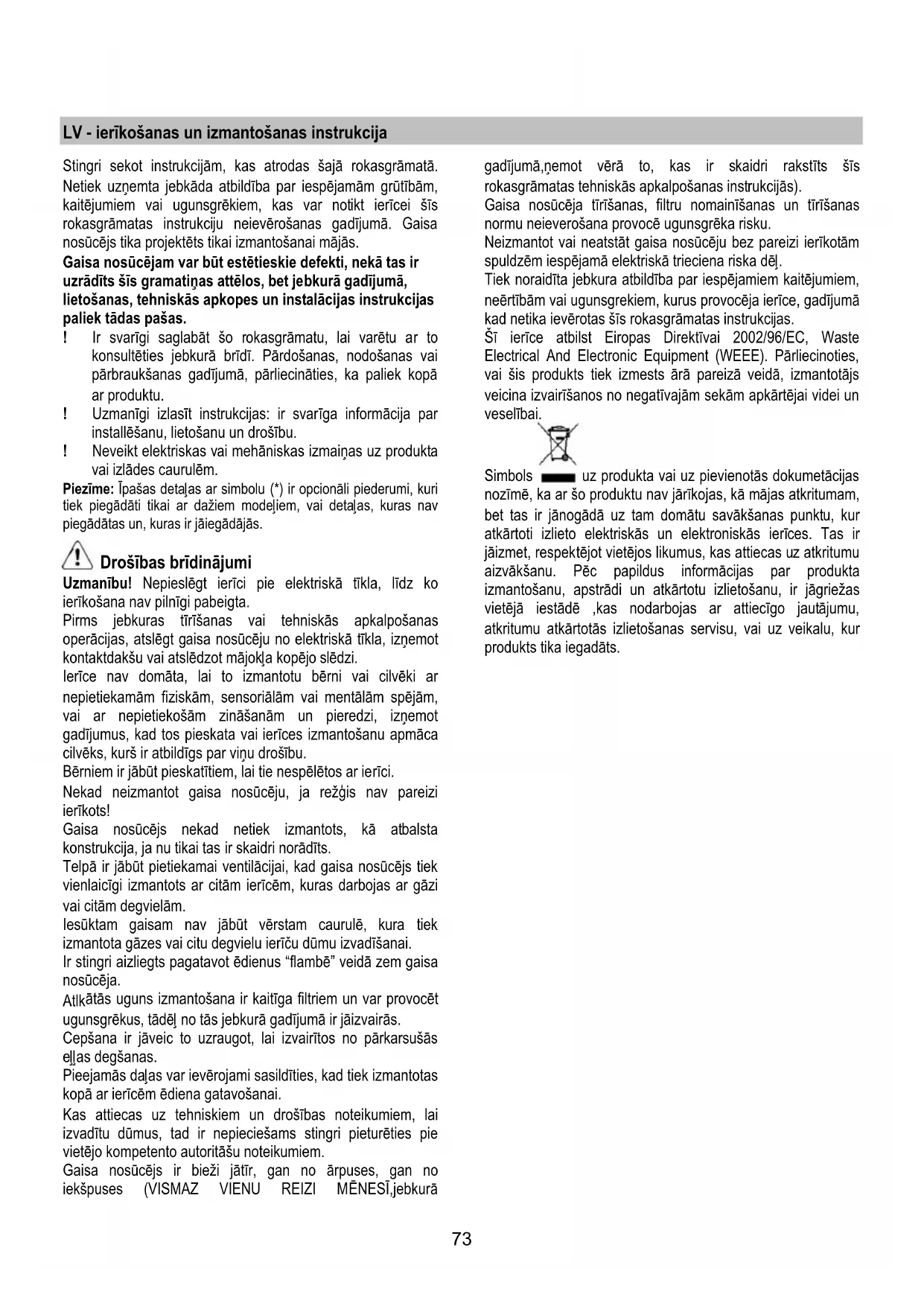Tikla spiegumam ir jaatbilst spiegumam, kurš ir atzimets uz ipasas etiketes, kura atrodas gaisa nosuceja iekspuse. Ja nosucejam ir kontaktdaksa, pievienot to rozetei, kura atbilst pastavosiem likumiem un atrodas pieejama zona arī pec installesanas.