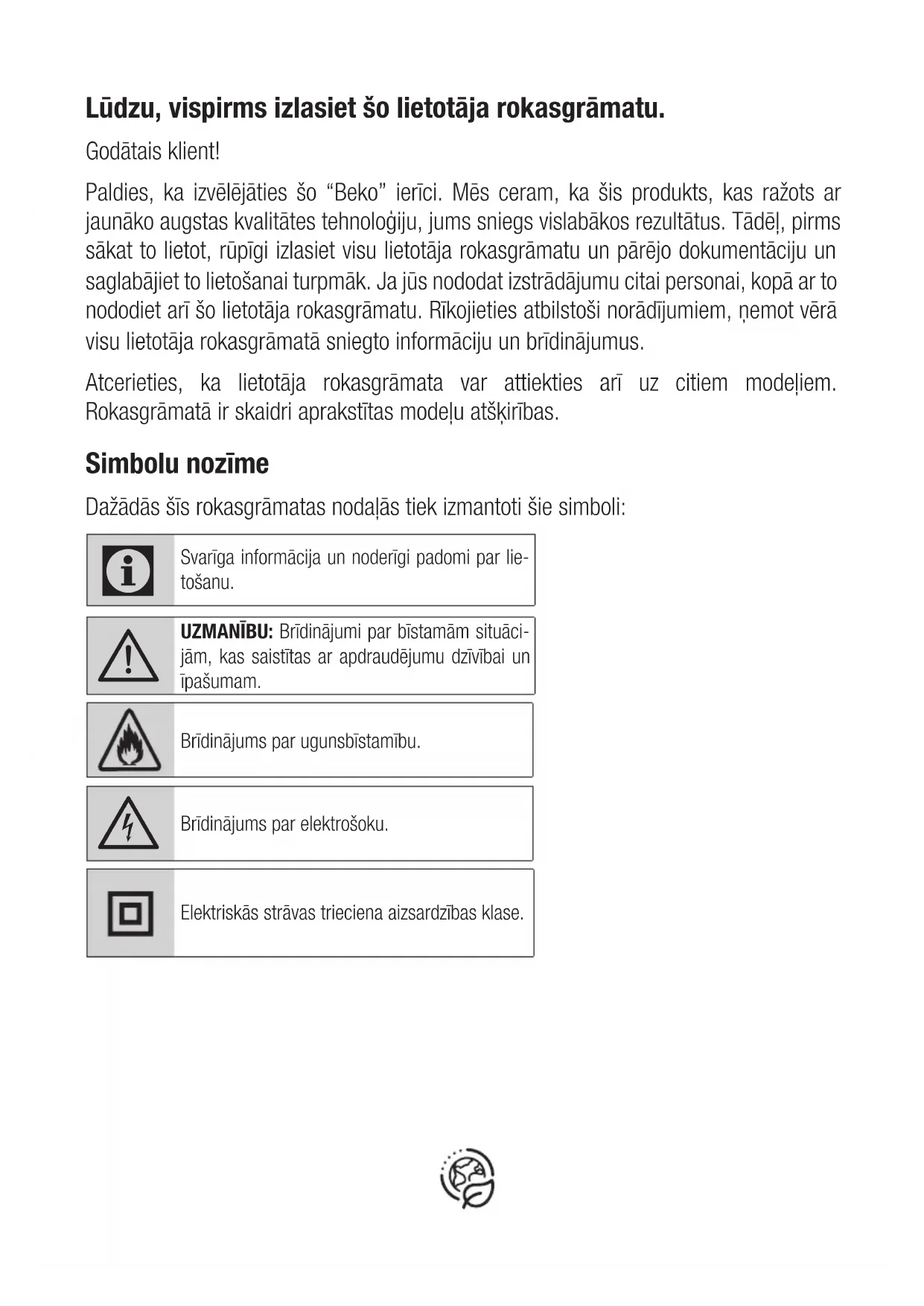 При продукти с въглеродни филтри филтърът обикновено трябва да се сменя на всеки 3 месеца.Lūdzu, vispirms izlasiet šo lietotāja rokasgrāmatu. Godātais klient! Paldies, ka izvēlējāties šo “Beko” ierīci. Mēs ceram, ka šis produkts, kas ražots ar jaunāko augstas kvalitātes tehnoloģiju, jums sniegs vislabākos rezultātus. Tādēļ, pirms sākat to lietot, rūpīgi izlasiet visu lietotāja rokasgrāmatu un pārējo dokumentāciju un saglabājiet to lietošanai turpmāk. Ja jūs nododat izstrādājumu citai personai, kopā ar to nododiet arī šo lietotāja rokasgrāmatu. Rīkojieties atbilstoši norādījumiem, ņemot vērā visu lietotāja rokasgrāmatā sniegto informāciju un brīdinājumus. Atcerieties, ka lietotāja rokasgrāmata var attiekties arī uz citiem modeļiem. Rokasgrāmatā ir skaidri aprakstītas modeļu atšķirības. Simbolu nozīme Dažādās šīs rokasgrāmatas nodaļās tiek izmantoti šie simboli: