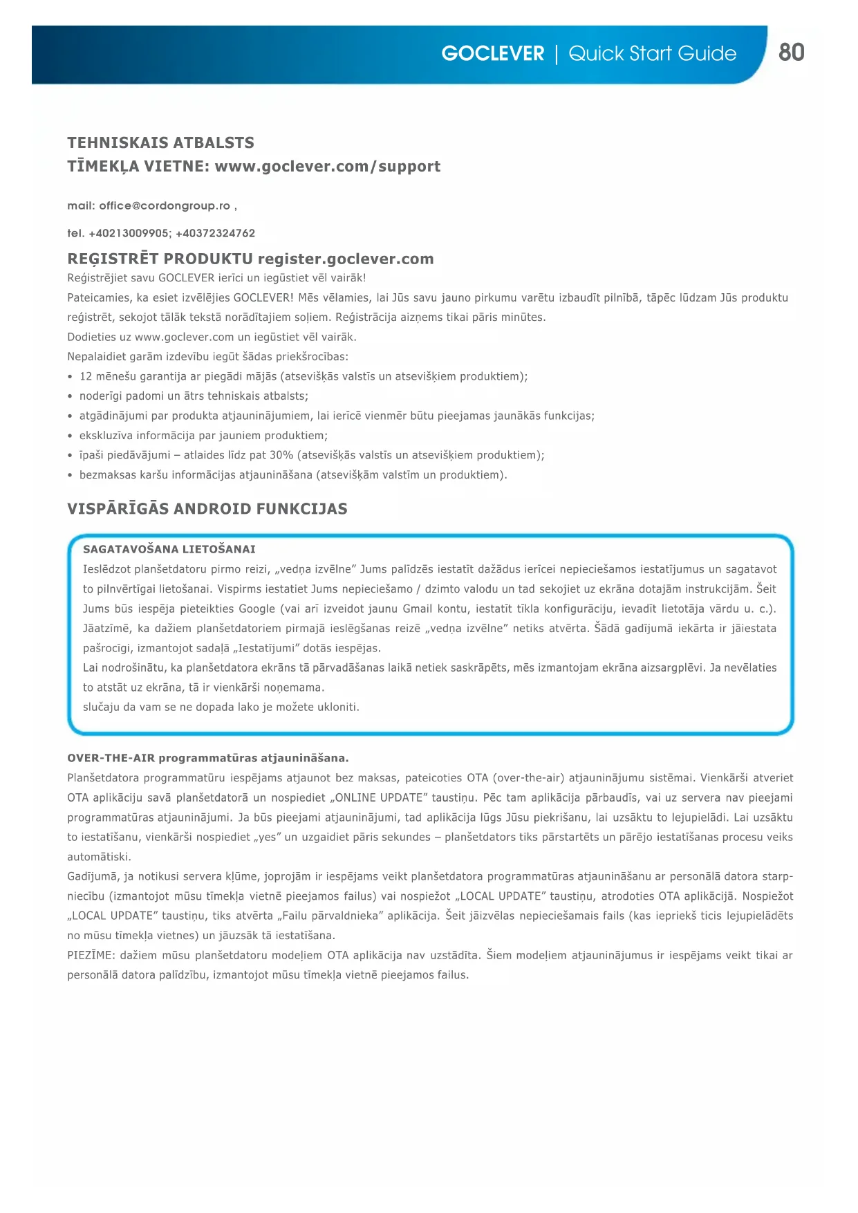Ieslēdzot planšetdatoru pirmo reizi, „vedņa izvēlne” Jums palīdzēs iestatīt dažādus ierīcei nepieciešamos iestatījumus un sagatavot to pilnvērtīgai lietošanai. Vispirms iestatiet Jums nepieciešamo / dzimto valodu un tad sekojiet uz ekrāna dotajām instrukcijām. Šeit Jums būs iespēja pieteikties Google (vai arī izveidot jaunu Gmail kontu, iestatīt tīkla konfigurāciju, ievadīt lietotāja vārdu u. c.). Jāatzīmē, ka dažiem planšetdatoriem pirmajā ieslēgšanas reizē „vedņa izvēlne” netiks atvērta. Šādā gadījumā iekārta ir jāiestata pašrocīgi, izmantojot sadaļā „Iestatījumi” dotās iespējas. Lai nodrošinātu, ka planšetdatora ekrāns tā pārvadāšanas laikā netiek saskrāpēts, mēs izmantojam ekrāna aizsargplēvi. Ja nevēlaties to atstāt uz ekrāna, tā ir vienkārši noņemama. slučaju da vam se ne dopada lako je možete ukloniti. REĢISTRĒT PRODUKTU register.goclever.com Reģistrējiet savu GOCLEVER ierīci un iegūstiet vēl vairāk! Pateicamies, ka esiet izvēlējies GOCLEVER! Mēs vēlamies, lai Jūs savu jauno pirkumu varētu izbaudīt pilnībā, tāpēc lūdzam Jūs produktu reģistrēt, sekojot tālāk tekstā norādītajiem soļiem. Reģistrācija aizņems tikai pāris minūtes. Dodieties uz www.goclever.com un iegūstiet vēl vairāk. Nepalaidiet garām izdevību iegūt šādas priekšrocības: