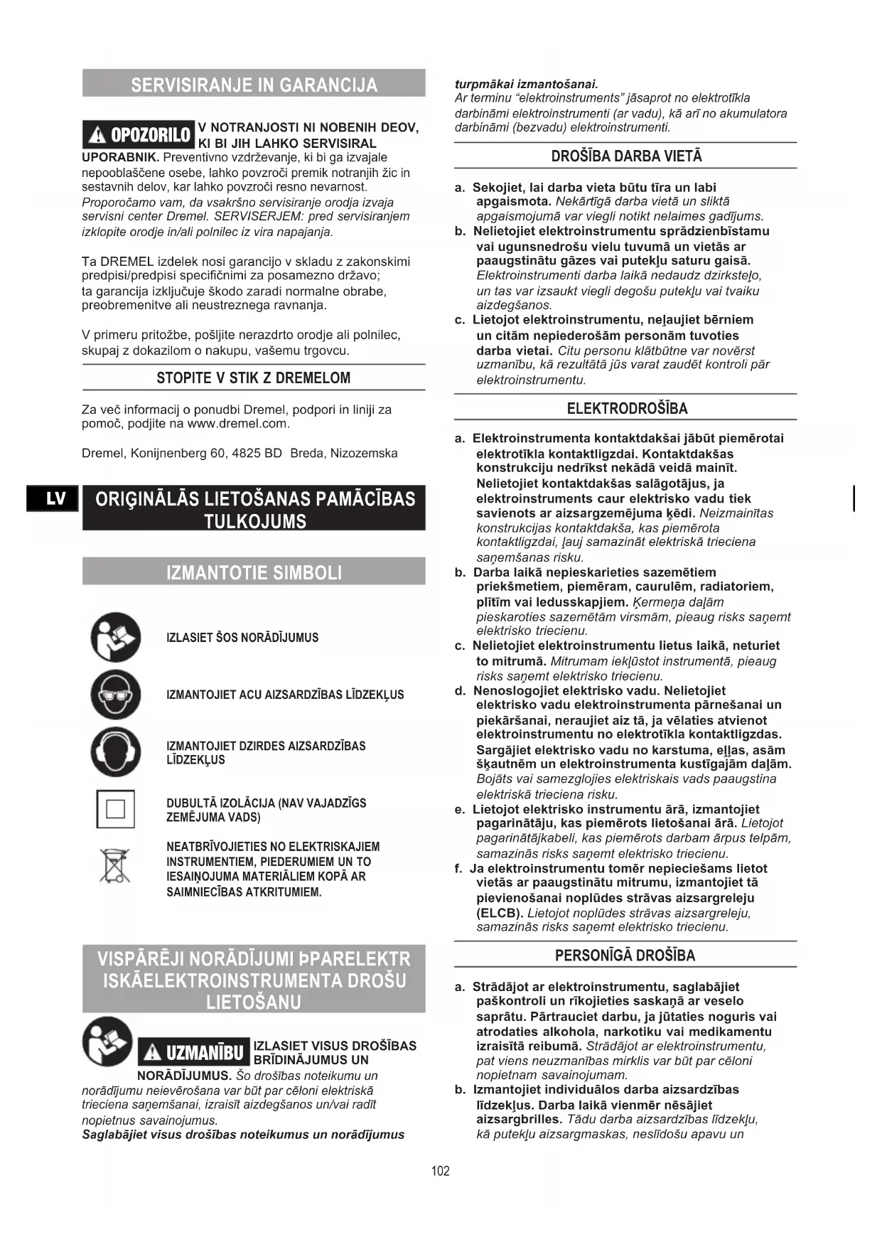 105apkopes vai tīrīšanas atvienojiet elektroinstrumentu un/vai uzlādes ierīci no elektrobarošanas avota.Šā DREMEL izstrādājuma garantija atbilst starptautiskajā un nacionālajā likumdošanā noteiktajām prasībām; garantija neattiecas uz bojājumiem, ko izraisījis normāls nodilums un nolietojums, izstrādājuma pārslodze vai nepareiza izmantošana.Pretenziju gadījumā nosūtiet neizjauktu instrumentu vai uzlādes ierīci kopā ar iegādes datumu apliecinošu dokumentu uz tuvāko specializēto tirdzniecības vietu. SAZINĀŠANĀS AR DREMEL Plašāku informāciju par Dremel piedāvājumu, atbalsta dienestu un karsto palīdzības līniju skatiet vietnē www.dremel.com. Dremel, Konijnenberg 60, 4825 BD Breda, Nīderlande