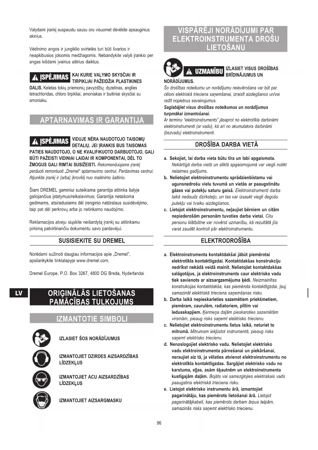 ORIĢINĀLĀS LIETOŠANAS PAMĀCĪBAS TULKOJUMS IZMANTOTIE SIMBOLI IZLASIET ŠOS NORĀDĪJUMUS IZMANTOJIET DZIRDES AIZSARDZĪBAS LĪDZEKĻUS IZMANTOJIET ACU AIZSARDZĪBAS LĪDZEKĻUS IZMANTOJIET AIZSARGMASKU VISPĀRĒJI NORĀDĪJUMI PAR ELEKTROINSTRUMENTA DROŠU LIETOŠANU UZMANĪBU IZLASIET VISUS DROŠĪBAS BRĪDINĀJUMUS UN NORĀDĪJUMUS.