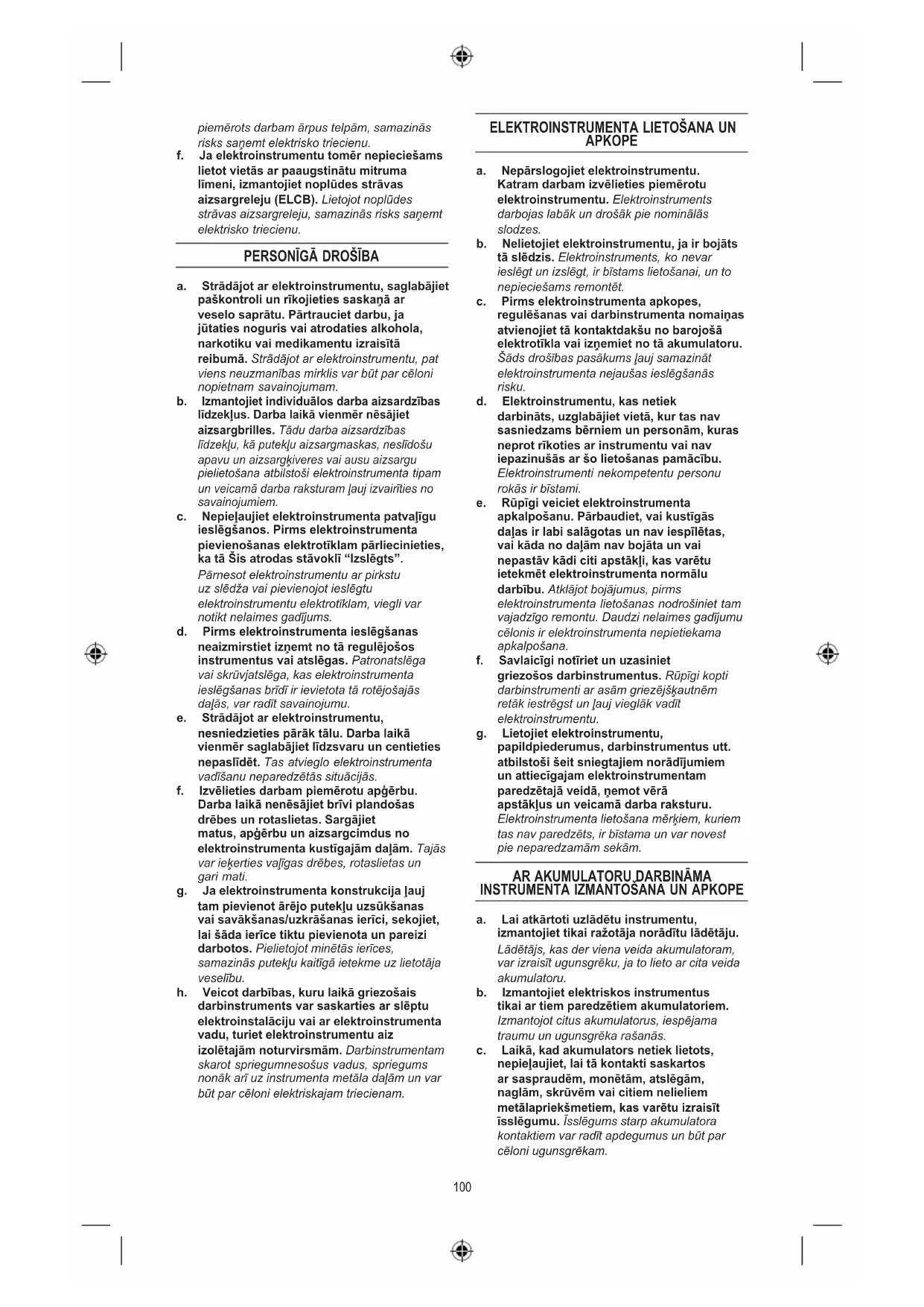 ORIĢINĀLĀS LIETOŠANAS PAMĀCĪBAS TULKOJUMS IZMANTOTIE SIMBOLI IZLASIET ŠOS NORĀDĪJUMUS IZMANTOJIET DZIRDES AIZSARDZĪBAS LĪDZEKĻUS IZMANTOJIET ACU AIZSARDZĪBAS LĪDZEKĻUS IZMANTOJIET AIZSARGMASKU LV VISPĀRĒJI NORĀDĪJUMI PAR ELEKTROINSTRUMENTA DROŠU LIETOŠANU UZMANĪBU IZLASIET VISUS DROŠĪBAS BRĪDINĀJUMUS UN NORĀDĪJUMUS.