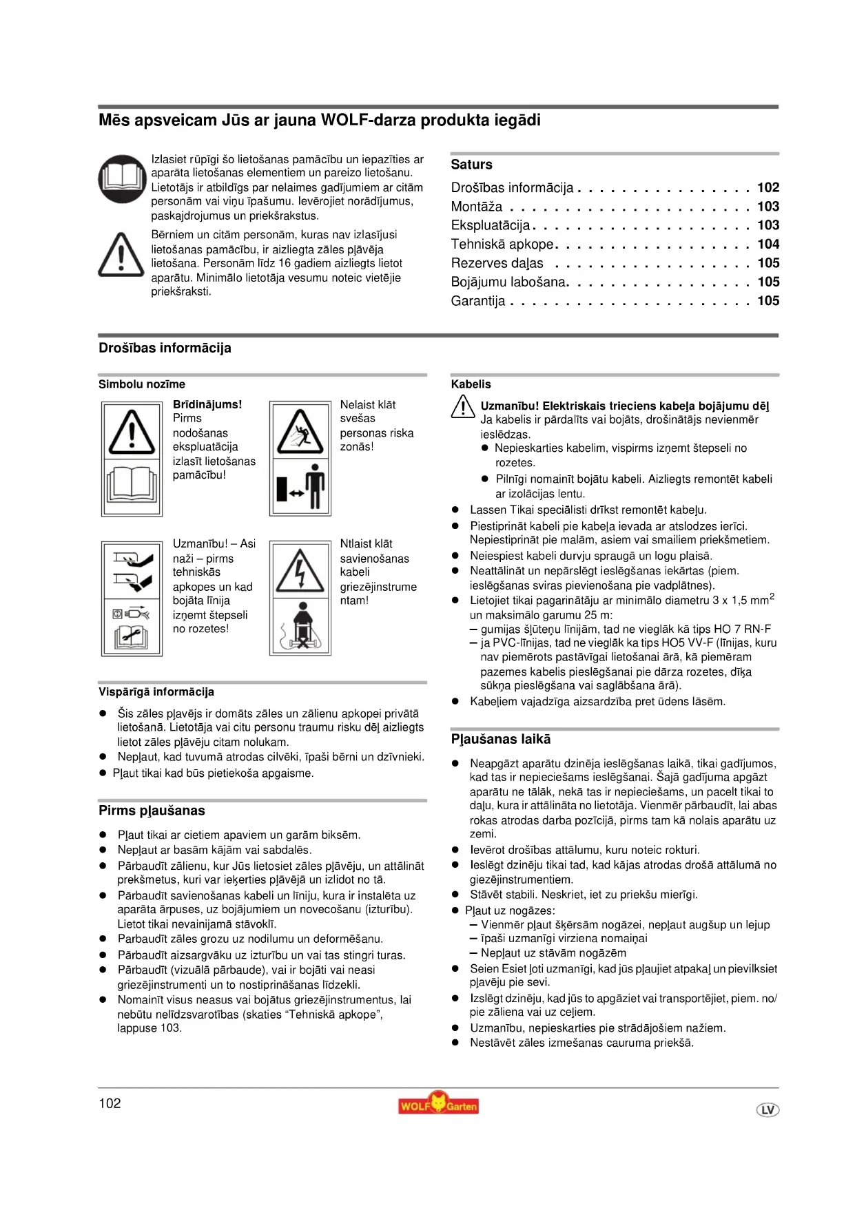 - Reguleerimata lõikekõrgus vaata lehekülg 99 (Lõikekõrguse regu- leerimine) Kahtluse korral pöörduge alati WOLF-Garten teeninduse poole. Tähelepanu: Lülitage niiduk välja ja eemaldage võrgupistik pistikupesast igakordselt enne kontrollimist või töid noa juures.102 Mēs apsveicam Jūs ar jauna WOLF-darza produkta iegādi Saturs Drošības informācija . . . . . . . . . . . . . . . . 102 Montāža . . . . . . . . . . . . . . . . . . . . . . 103 Ekspluatācija . . . . . . . . . . . . . . . . . . . . 103 Tehniskā apkope. . . . . . . . . . . . . . . . . . 104 Rezerves daĜas . . . . . . . . . . . . . . . . . . 105 Bojājumu labošana. . . . . . . . . . . . . . . . . 105 Garantija . . . . . . . . . . . . . . . . . . . . . . 105 Drošības informācija Simbolu nozīme Vispārīgā informācija Šis zāles pĜavējs ir domāts zāles un zālienu apkopei privātā lietošanā. Lietotāja vai citu personu traumu risku dēĜ aizliegts lietot zāles pĜāvēju citam nolukam. NepĜaut, kad tuvumā atrodas cilvēki, īpaši bērni un dzīvnieki. PĜaut tikai kad būs pietiekoša apgaisme. Pirms pĜaušanas PĜaut tikai ar cietiem apaviem un garām biksēm. NepĜaut ar basām kājām vai sabdalēs. Pārbaudīt zālienu, kur Jūs lietosiet zāles pĜāvēju, un attālināt prekšmetus, kuri var ieėerties pĜāvējā un izlidot no tā. Pārbaudīt savienošanas kabeli un līniju, kura ir instalēta uz aparāta ārpuses, uz bojājumiem un novecošanu (izturību). Lietot tikai nevainijamā stāvoklī. Parbaudīt zāles grozu uz nodilumu un deformēšanu. Pārbaudīt aizsargvāku uz izturību un vai tas stingri turas. Pārbaudīt (vizuālā pārbaude), vai ir bojāti vai neasi griezējinstrumenti un to nostiprināšanas līdzekli. Nomainīt visus neasus vai bojātus griezējinstrumentus, lai nebūtu nelīdzsvarotības (skaties “Tehniskā apkope”, lappuse 103. Kabelis