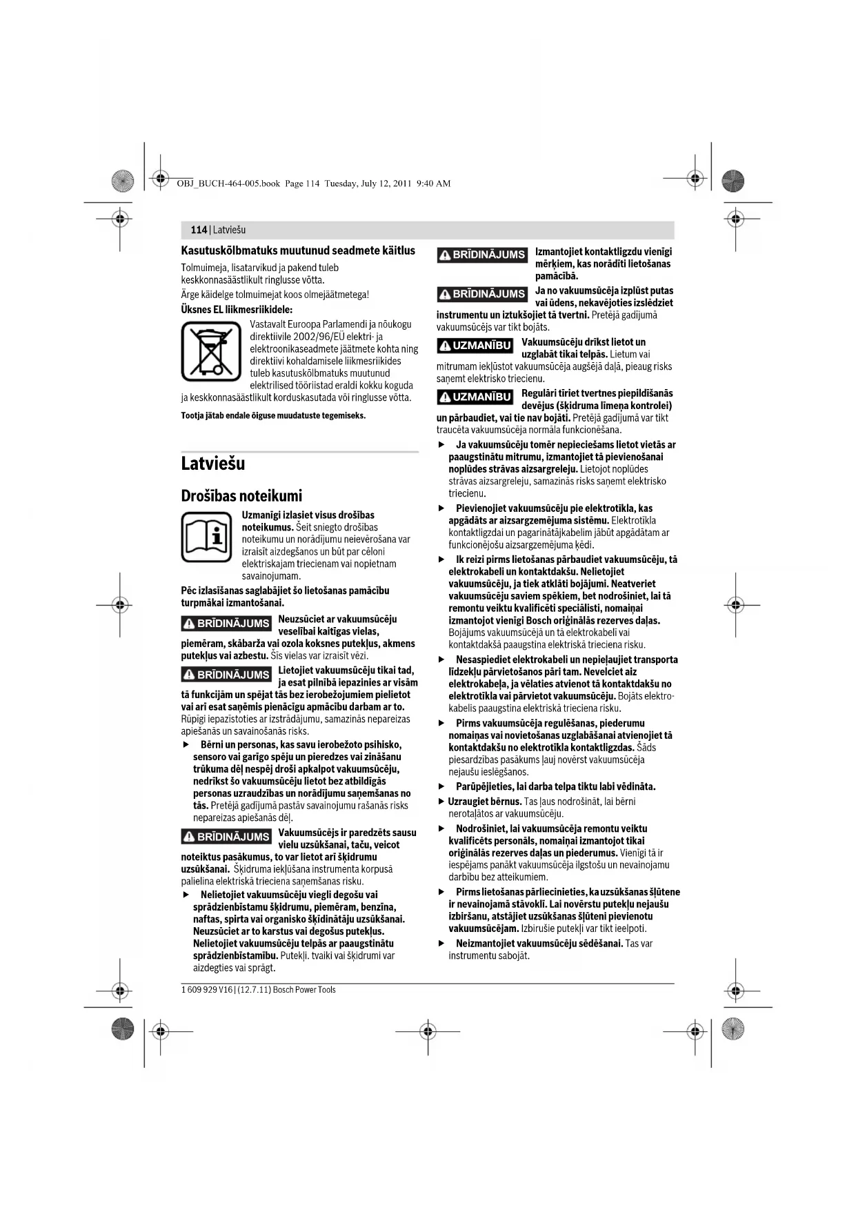 BRĪDINĀJUMS BRĪDINĀJUMS BRĪDINĀJUMS BRĪDINĀJUMS BRĪDINĀJUMS UZMANĪBU UZMANĪBU OBJ_BUCH-464-005.book Page 114 Tuesday, July 12, 2011 9:40 AMLatviešu | 115 Bosch Power Tools 1 609 929 V16 | (12.7.11) f Ievērojiet piesardzību, rīkojoties ar instrumenta