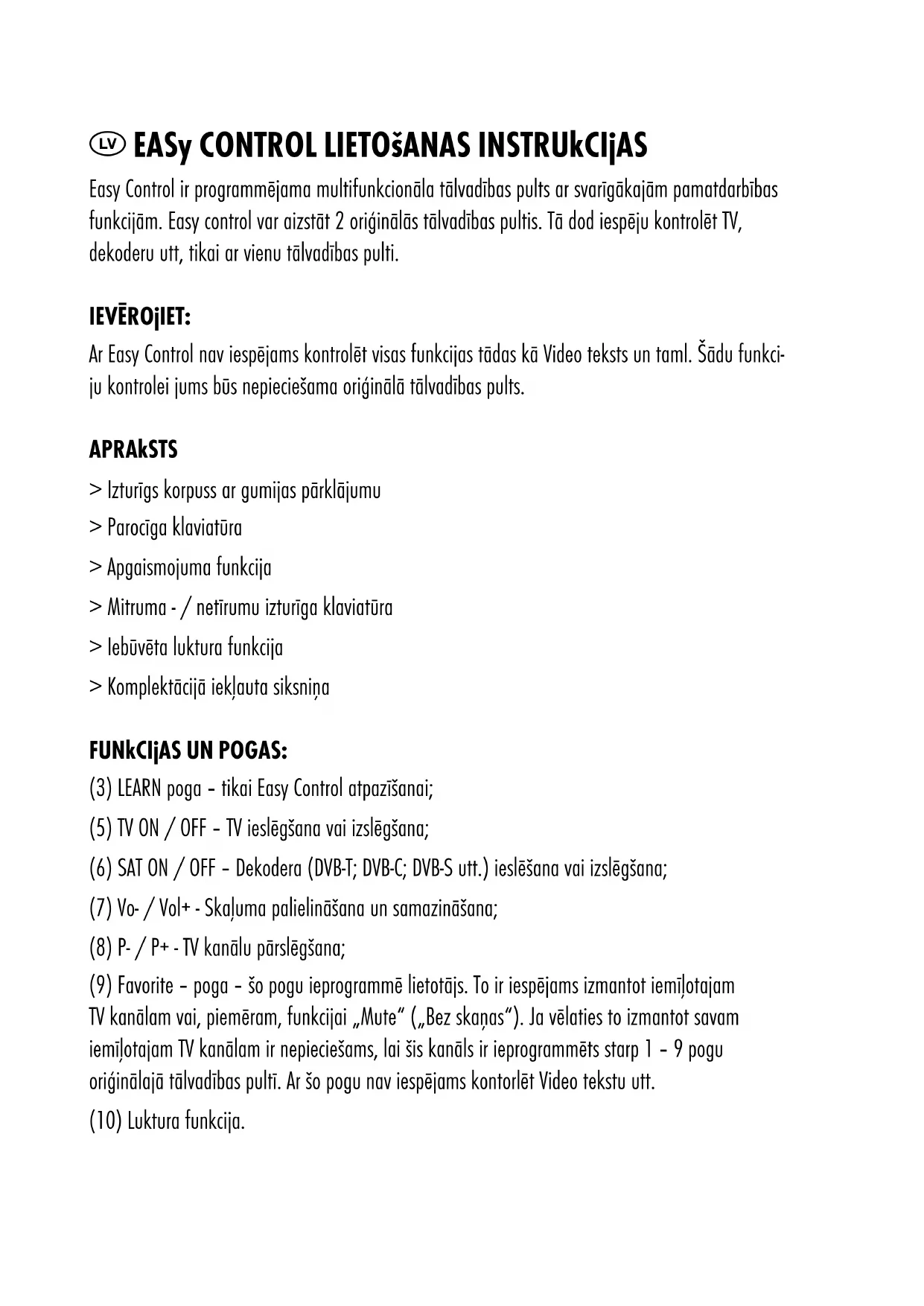 visām pogām. Gadījumā, ja funkcijas dažām pogām nedarbojas ir iespēja atkārtot atpazīšanas darbības šīm pogām. Šim nolūkam lūdzu atkārtojiet darbības aprakstītas punktos no a. līdz h. līdz visas pogas darbojas. SVARĪGI: > Gadījumā, ja pēc 30 sekundēm kopš atpazīšanas sākuma nav nospiesta neviena poga, atpazīšanas process automātiski apstāsies un to vajadzēs sākt no jauna. > Ir iespējams, ka dažas pogas nepieciešams atpazīt 2 vai 3 reizes, līdz funkcija darbojas pienācīgi – Tas nav ierīces defekts vai bojājums. > Pēc veiksmīgas pogu individuālo funkciju atpazīšanas, tālvadības pults ir gatava lietošanai. > Gadījumā, ja Easy Control funkcionēšana un apgaismojums ir vāji ir nepiciešams nomainīt baterijas. Lai to izdarītu atveriet bateriju nodalījuma vāciņu ierīces aizmugurē un nomainiet baterijas (2 x Micro AAA). Nav nepiciešams atkal veikt Easy Control atpazīšanu pēc bateriju maiņas. DARBĪBAS KĻŪDU NOTEIKŠANA UN NOVĒRŠANA TV vai Dekoders nereaģē uz Easy Control > Nepieciešams nomainīt Easy Control baterijas > Atpazīšana nebija veiksmīga attiecīgās funkcijas pogai. Tādā gadījumā lūdzu atkārtojiet pogas atpazīšanu līdz funkcija darbojas pienācīgi. > Attālums starp Easy Control un TV vai Dekoderi ir pārāk liels (max. 5-7 m) > Easy Control signāls nav vērsts pret TV vai Dekoderi. Lūdzu novietojiet Easy Control TV vai Dekodera virzienā.Funkcijas gaismas diode (4) neuzsāk mirgot (skatīties punktu e.) programmēšanas procesa laikā > Baterijas oriģinālajā tālvadības pultī ir pārāk vājas > Funkcijas poga oriģinālajā tālvadības pultī nedarbojas > Attālums un virziens starp oriģinālās pults un Easy Control infrasarkaniem sensoriem ir nepareizs. GARANTIJA ANSMANN piešķir ierīcei 3 gadu garantiju, saskaņā ar zemāk norādītajiem noteikumiem. Gadījumā, ja jums ir jautājumi par ierīces darbību vai funkciju, jūs esat laipni lūgti sakontaktēt ar mūsu apkalpošanas nodaļu mājas lapā www.ansmann.de. Garantijas pieprasījums netiks pieņemts sekojošos gadījumos: > Ekspluatācijas kļūda > Neatļauta pielietošana > Mehāniski bojājumi > Mitruma izraisīts bojājums nepareizas lietošanas dēļ > Nebūs uzrādīts preču pirkuma pierādījums > Zemas jaudas vai bojātas baterijas