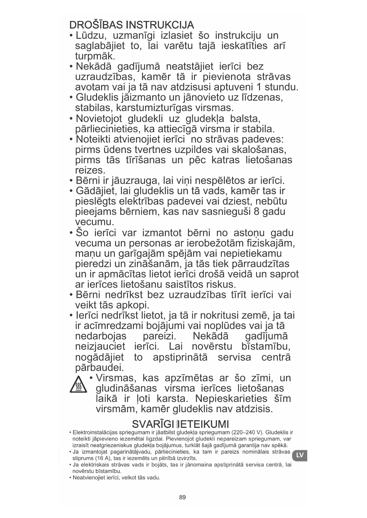 - Virsmas, kas apzīmētas ar šo zīmi, un gludināšanas virsma ierīces lietošanas laikā ir ļoti karsta. Nepieskarieties šīm virsmām, kamēr gludeklis nav atdzisis.
