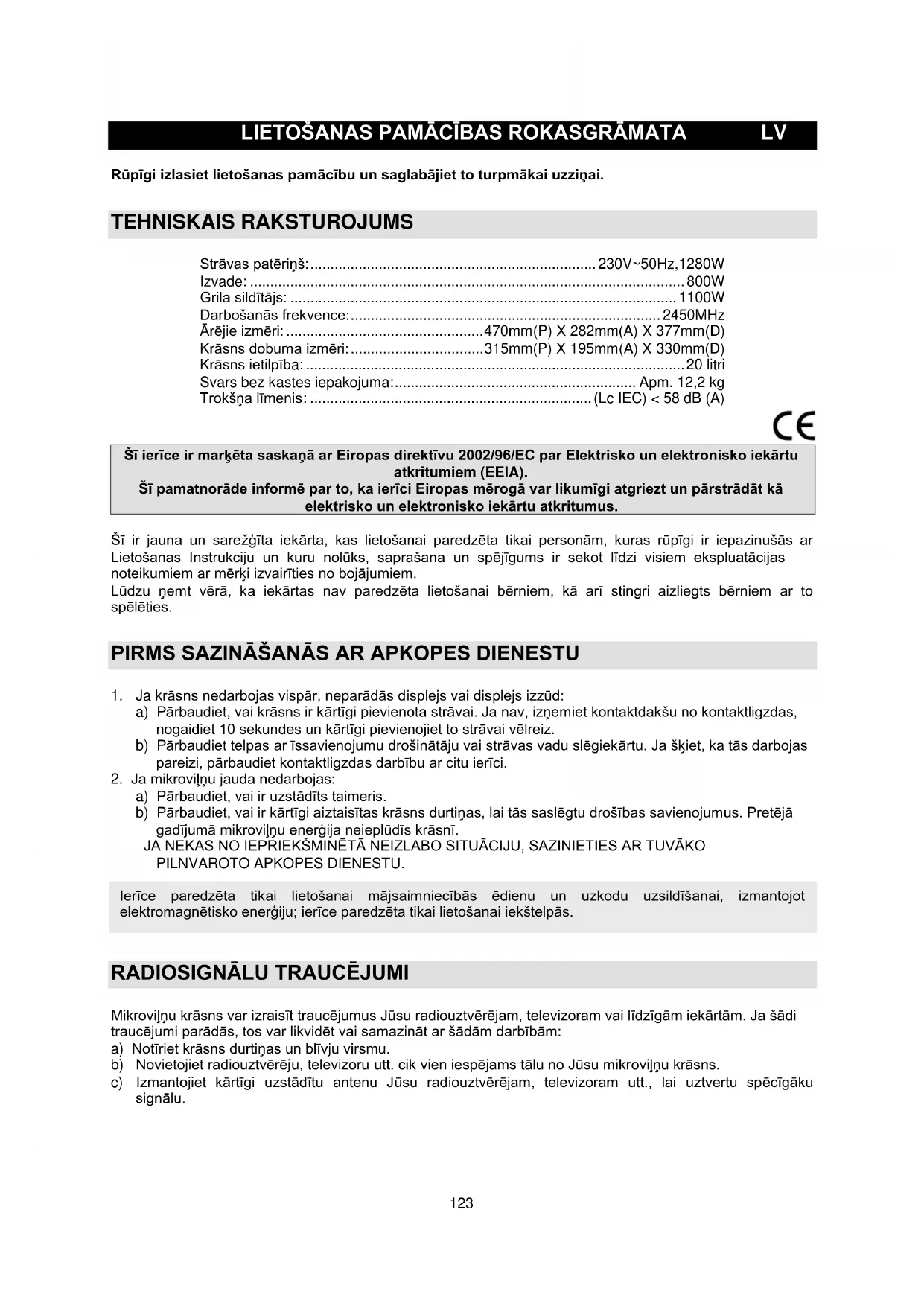 Mikroviļľu krāsns var izraisīt traucējumus Jūsu radiouztvērējam, televizoram vai līdzīgām iekārtām. Ja šādi traucējumi parādās, tos var likvidēt vai samazināt ar šādām darbībām: a) Notīriet krāsns durtiľas un blīvju virsmu. b) Novietojiet radiouztvērēju, televizoru utt. cik vien iespējams tālu no Jūsu mikroviļľu krāsns. c) Izmantojiet kārtīgi uzstādītu antenu Jūsu radiouztvērējam, televizoram utt., lai uztvertu spēcīgāku signālu. Ierīce paredzēta tikai lietošanai mājsaimniecībās ēdienu un uzkodu uzsildīšanai, izmantojot elektromagnētisko enerģiju; ierīce paredzēta tikai lietošanai iekštelpās.124