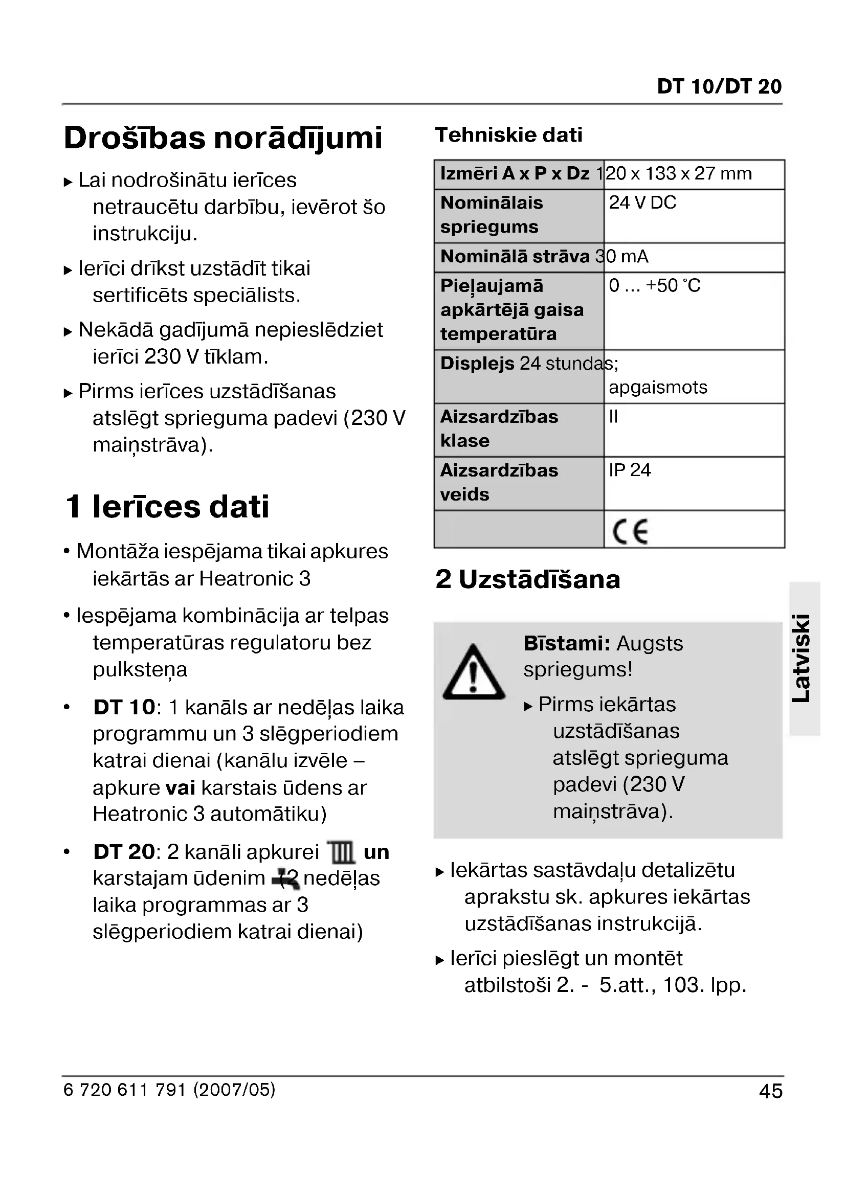 Прерывание программы отпуска: B нажать любую кнопку.45 DT 10/DT 20 6 720 611 791 (2007/05) Latviski Drošības norādījumi B Lai nodrošinātu ierīces netraucētu darbību, ievērot šo instrukciju. B Ierīci drīkst uzstādīt tikai sertificēts speciālists. B Nekādā gadījumā nepieslēdziet ierīci 230 V tīklam. B Pirms ierīces uzstādīšanas atslēgt sprieguma padevi (230 V maistrāva). 1 Ierīces dati