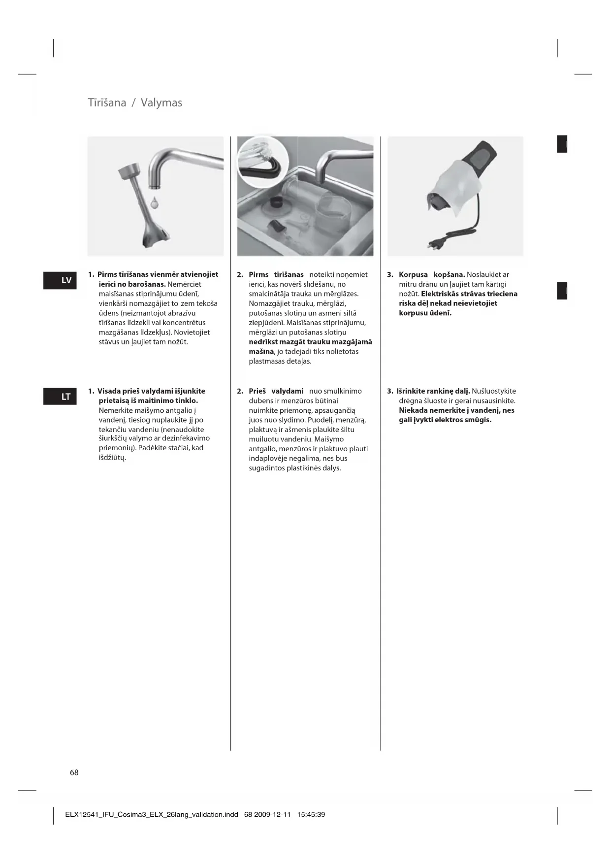Darbības traucējumu novēršana / Problēma Iespējamais iemesls Risinājums Mazais smalcinātājs* nedarbojas. Smalcinātāja vāks ir nepareizi nostiprināts. Pārliecinieties, ka vāks un smalcinātāja trauks ir pareizi uzstādīti.Maisīšanas stiprinājums/tradicionālā putošanas slotiņa* nedarbojas.Maisīšanas stiprinājums/tradicionālā putošanas slotiņa* ir nepareizi pievienota.Pārliecinieties, ka maisīšanas stiprinājums/tradicionālā putošanas slotiņa* ir nostiprināti.*atkarīgs no modeļa 5SJLǏJǽÝBMJOJNBT Problema Galima priežastis Sprendimas Neveikia mažasis smulkintuvas*. Tinkamai neužksuotas smulkintuvo dangtis. Įsitikinkite, kad tinkamai uždėtas dangtis ir smulkintuvo dubuo.Neveikia maišymo antgalis / įprastas plaktuvas*.Netinkamai įstatytas maišymo antgalis / įprastas plaktuvas*.Įsitikinkite, kad tinkamai užksuotas maišymo antgalis / įprastas plaktuvas*.* priklauso nuo modelio ELX12541_IFU_Cosima3_ELX_26lang_validation.indd 69 2009-12-11 15:45:3970