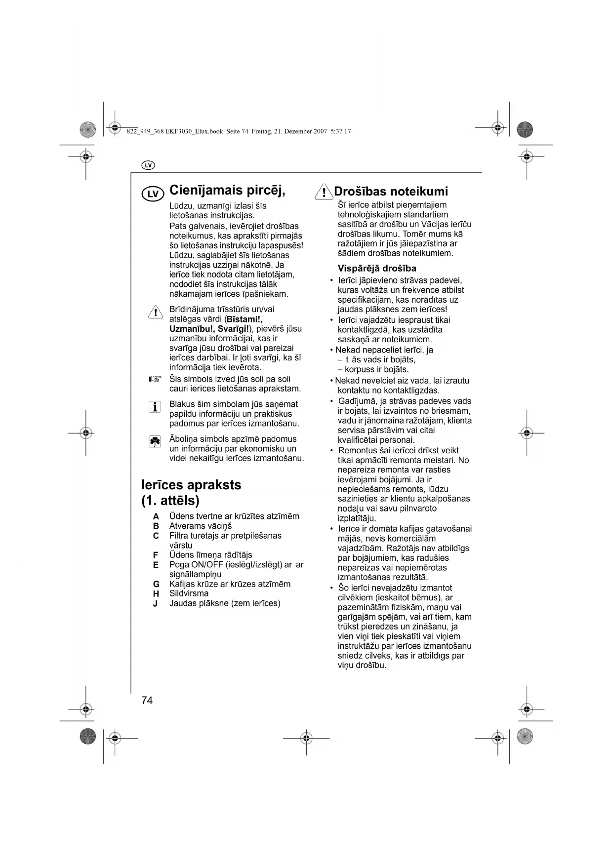 - Šo ierīci nevajadzētu izmantot cilvēkiem (ieskaitot bērnus), ar pazeminātām fiziskām, maņu vai garīgajām spējām, vai arī tiem, kam trūkst pieredzes un zināšanu, ja vien viņi tiek pieskatīti vai viņiem instruktāžu par ierīces izmantošanu sniedz cilvēks, kas ir atbildīgs par viņu drošību. 822_949_368 EKF3030_Elux.book Seite 74 Freitag, 21. Dezember 2007 5:37 17