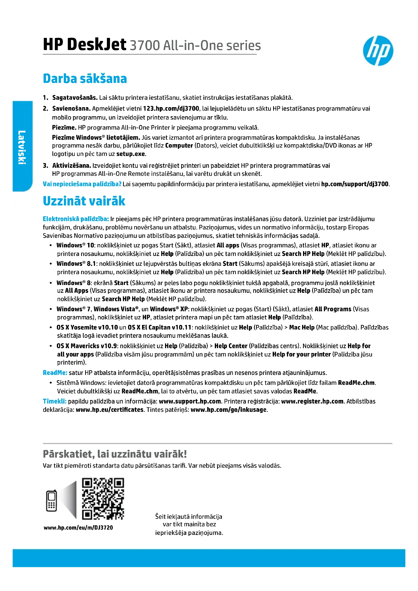 HP programmas All-in-One Remote instalēšanu, lai varētu drukāt un skenēt. Vai nepieciešama palīdzība? Lai saņemtu papildinformāciju par printera iestatīšanu, apmeklējiet vietni hp.com/support/dj3700. Uzzināt vairāk Elektroniskā palīdzība: Ir pieejams pēc HP printera programmatūras instalēšanas jūsu datorā. Uzziniet par izstrādājumu funkcijām, drukāšanu, problēmu novēršanu un atbalstu. Paziņojumus, vides un normatīvo informāciju, tostarp Eiropas Savienības Normatīvo paziņojumu un atbilstības paziņojumus, skatiet tehniskās informācijas sadaļā.