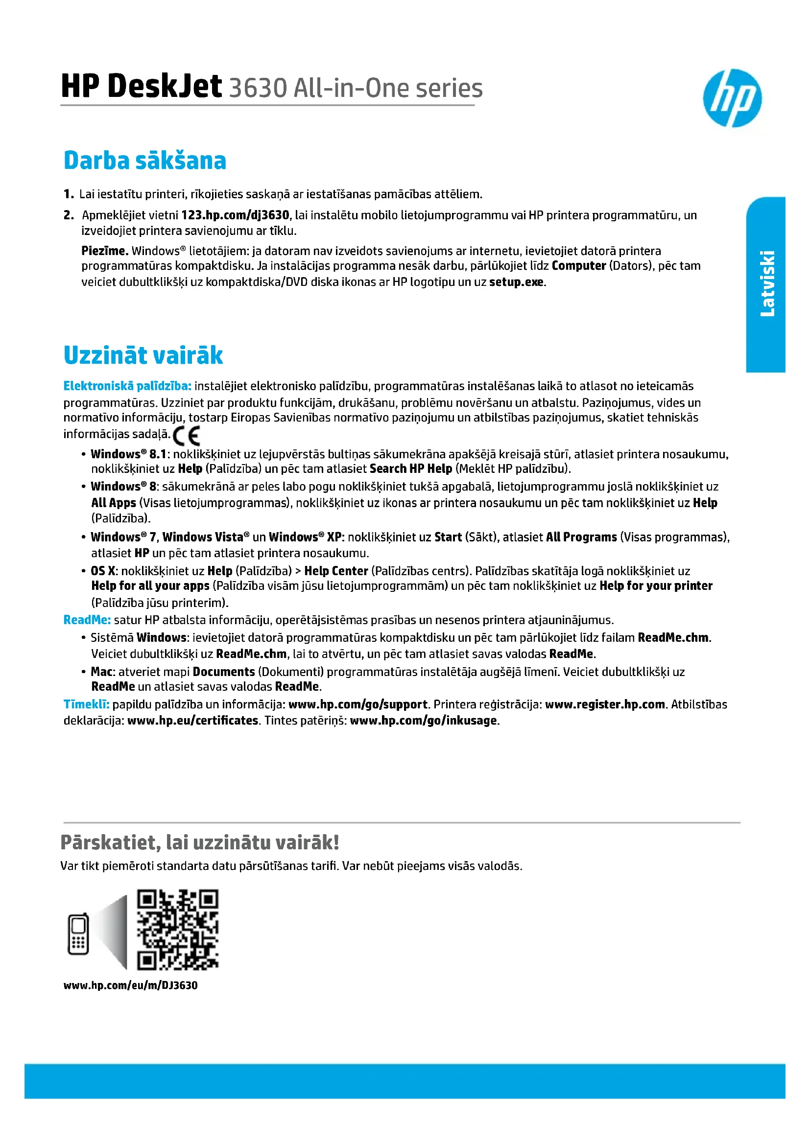 - Mac: atveriet mapi Documents (Dokumenti) programmatūras instalētāja augšējā līmenī. Veiciet dubultklikšķi uz ReadMe un atlasiet savas valodas ReadMe. Tīmeklī: papildu palīdzība un informācija: www.hp.com/go/support. Printera reģistrācija: www.register.hp.com. Atbilstības deklarācija: www.hp.eu/certicates. Tintes patēriņš: www.hp.com/go/inkusage. Darba sākšana