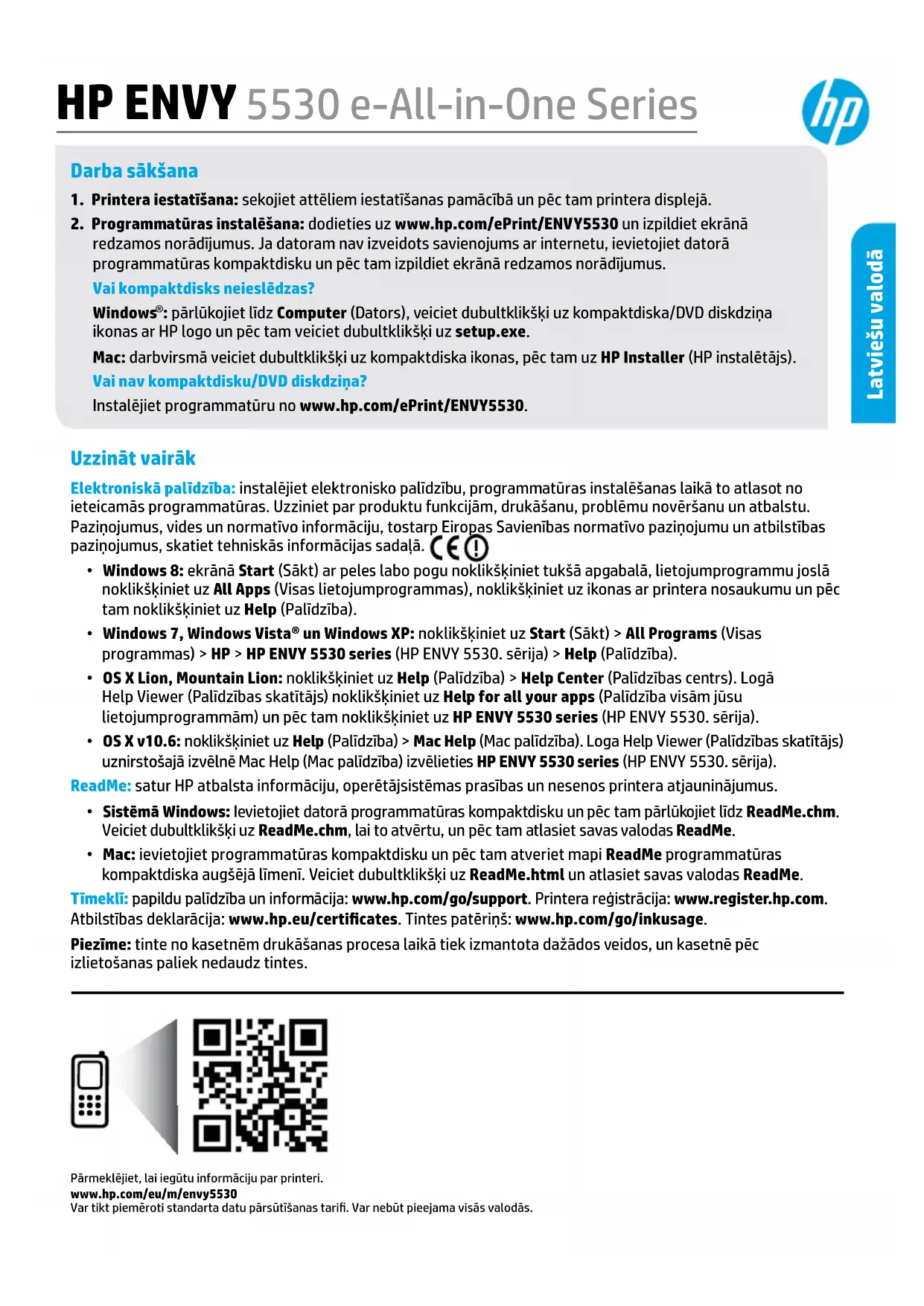 : pārlūkojiet līdz Computer (Dators), veiciet dubultklikšķi uz kompaktdiska/DVD diskdziņa ikonas ar HP logo un pēc tam veiciet dubultklikšķi uz setup.exe. Mac: darbvirsmā veiciet dubultklikšķi uz kompaktdiska ikonas, pēc tam uz HP Installer (HP instalētājs). Vai nav kompaktdisku/DVD diskdziņa?Instalējiet programmatūru no www.hp.com/ePrint/ENVY5530. Uzzināt vairāk Elektroniskā palīdzība: instalējiet elektronisko palīdzību, programmatūras instalēšanas laikā to atlasot no ieteicamās programmatūras. Uzziniet par produktu funkcijām, drukāšanu, problēmu novēršanu un atbalstu. Paziņojumus, vides un normatīvo informāciju, tostarp Eiropas Savienības normatīvo paziņojumu un atbilstības paziņojumus, skatiet tehniskās informācijas sadaļā.