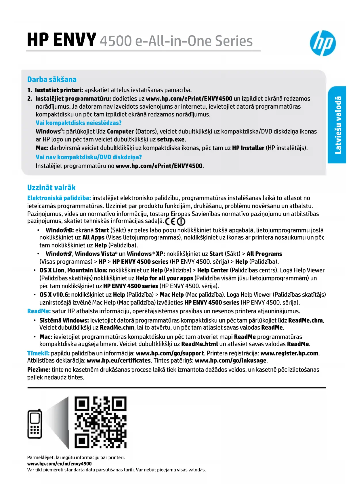 : pārlūkojiet līdz Computer (Dators), veiciet dubultklikšķi uz kompaktdiska/DVD diskdziņa ikonas ar HP logo un pēc tam veiciet dubultklikšķi uz setup.exe. Mac: darbvirsmā veiciet dubultklikšķi uz kompaktdiska ikonas, pēc tam uz HP Installer (HP instalētājs). Vai nav kompaktdisku/DVD diskdziņa? Instalējiet programmatūru no www.hp.com/ePrint/ENVY4500. Uzzināt vairāk Elektroniskā palīdzība: instalējiet elektronisko palīdzību, programmatūras instalēšanas laikā to atlasot no ieteicamās programmatūras. Uzziniet par produktu funkcijām, drukāšanu, problēmu novēršanu un atbalstu. Paziņojumus, vides un normatīvo informāciju, tostarp Eiropas Savienības normatīvo paziņojumu un atbilstības paziņojumus, skatiet tehniskās informācijas sadaļā.