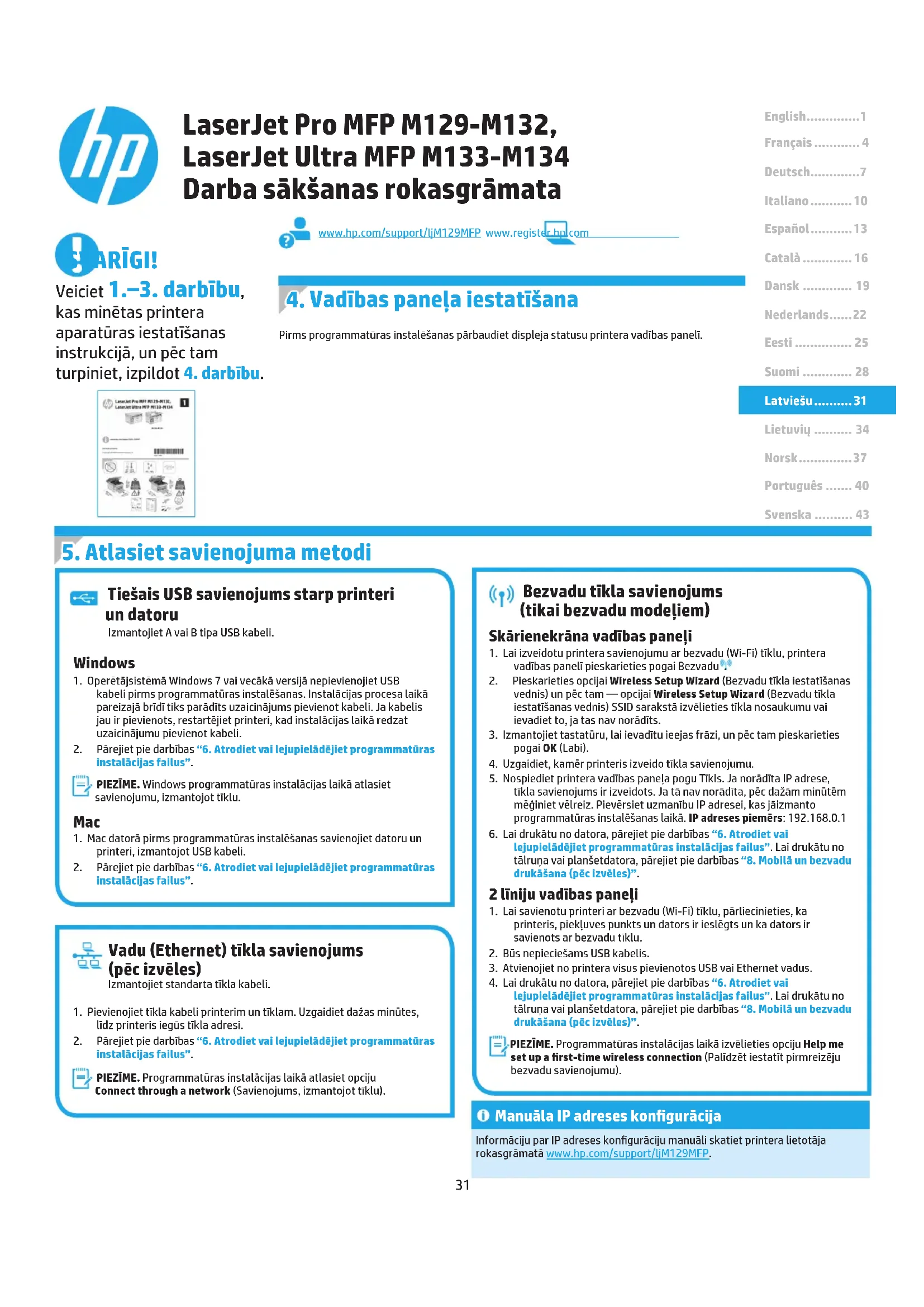 Vadības paneļa iestatīšana Pirms programmatūras instalēšanas pārbaudiet displeja statusu printera vadības panelī. Manuāla IP adreses kongurācijaInformāciju par IP adreses kongurāciju manuāli skatiet printera lietotāja rokasgrāmatā www.hp.com/support/ljM129MFP. LaserJet Pro MFP M129-M132, LaserJet Ultra MFP M133-M134 Darba sākšanas rokasgrāmata32 Windows risinājums