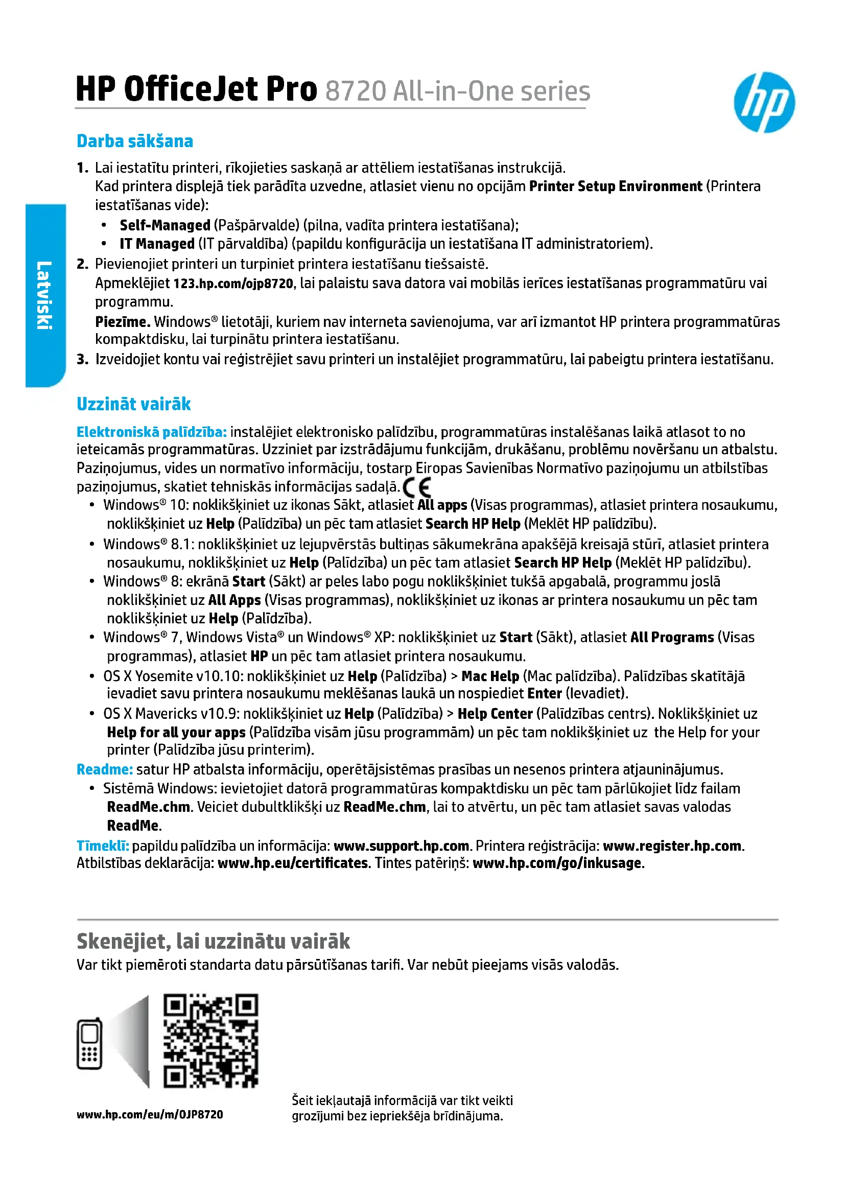- Sistēmā Windows: ievietojiet datorā programmatūras kompaktdisku un pēc tam pārlūkojiet līdz failam ReadMe.chm. Veiciet dubultklikšķi uz ReadMe.chm, lai to atvērtu, un pēc tam atlasiet savas valodas ReadMe. Tīmeklī: papildu palīdzība un informācija: www.support.hp.com. Printera reģistrācija: www.register.hp.com. Atbilstības deklarācija: www.hp.eu/certicates. Tintes patēriņš: www.hp.com/go/inkusage. Šeit iekļautajā informācijā var tikt veikti grozījumi bez iepriekšēja brīdinājuma. Skenējiet, lai uzzinātu vairāk Var tikt piemēroti standarta datu pārsūtīšanas tari. Var nebūt pieejams visās valodās.www.hp.com/eu/m/OJP8720 Latviski75 Bezvadu Izpildot printera vadības panelī sniegtos norādījumus un instalējot HPprintera programmatūru, var veiksmīgi izveidot printera savienojumu ar bezvadu tīklu. Piezīme. Ja vēlaties mainīt printera izmantotā savienojuma veidu (piemēram, no USB uz bezvadu savienojumu vai otrādi), jāizmanto HPprintera programmatūrā iekļautie rīki. Padoms. Izmantojot bezvadu savienojumu, ar Wi-Fi Direct palīdzību var drukāt no datora, viedtālruņa, planšetdatora vai citas ierīces, kas var izveidot bezvadu savienojumu, nepievienojot to esošam bezvadu tīklam. Papildinformāciju skatiet sadaļās “Savienojuma veida maiņa” un “Wi-Fi Direct izmantošana” elektroniskajā palīdzībā (skatiet sadaļu “Uzzināt vairāk” 74. lappusē). Bezvadu savienojuma problēmu risināšana