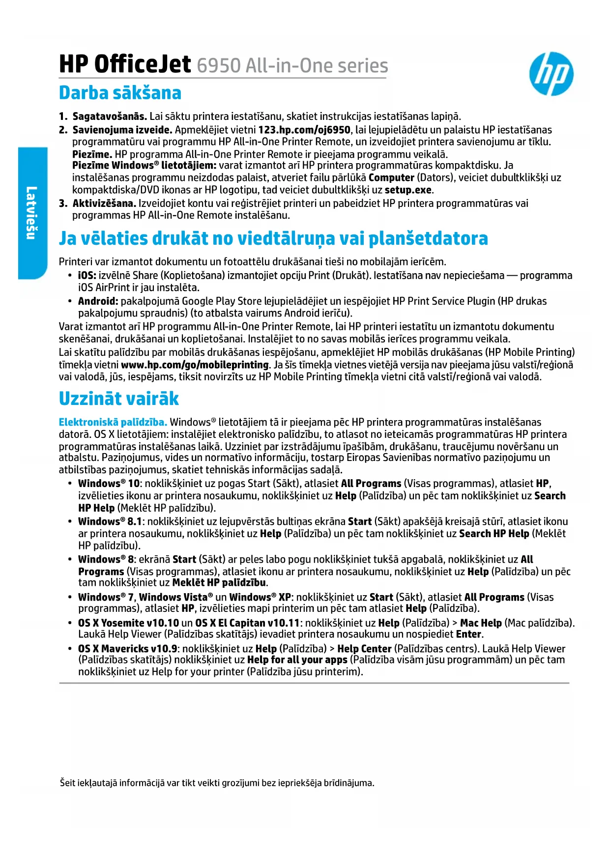 programmas HPAll-in-One Remote instalēšanu. Uzzināt vairāk Elektroniskā palīdzība. Windows® lietotājiem tā ir pieejama pēc HPprintera programmatūras instalēšanas datorā. OSXlietotājiem: instalējiet elektronisko palīdzību, to atlasot no ieteicamās programmatūras HP printera programmatūras instalēšanas laikā. Uzziniet par izstrādājumu īpašībām, drukāšanu, traucējumu novēršanu un atbalstu. Paziņojumus, vides un normatīvo informāciju, tostarp Eiropas Savienības normatīvo paziņojumu un atbilstības paziņojumus, skatiet tehniskās informācijas sadaļā.