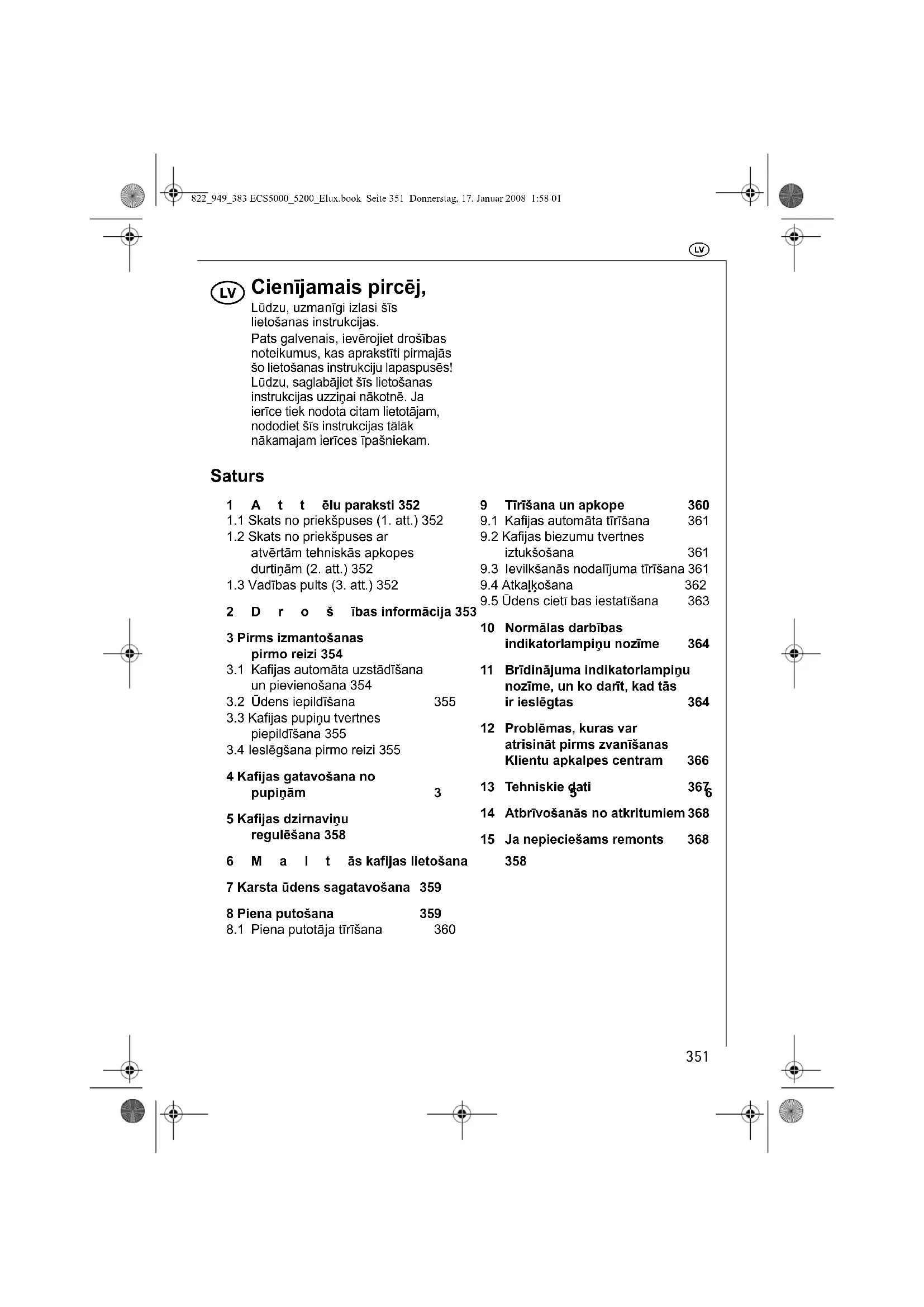10 Normālas darbības indikatorlampiņu nozīme 364 11 Brīdinājuma indikatorlampiņu nozīme, un ko darīt, kad tās ir ieslēgtas 36412 Problēmas, kuras var atrisināt pirms zvanīšanas Klientu apkalpes centram 36613 Tehniskie dati 367 14 Atbrīvošanās no atkritumiem 368 15 Ja nepieciešams remonts 368822_949_383 ECS5000_5200_Elux.book Seite 351 Donnerstag, 17. Januar 2008 1:58 01