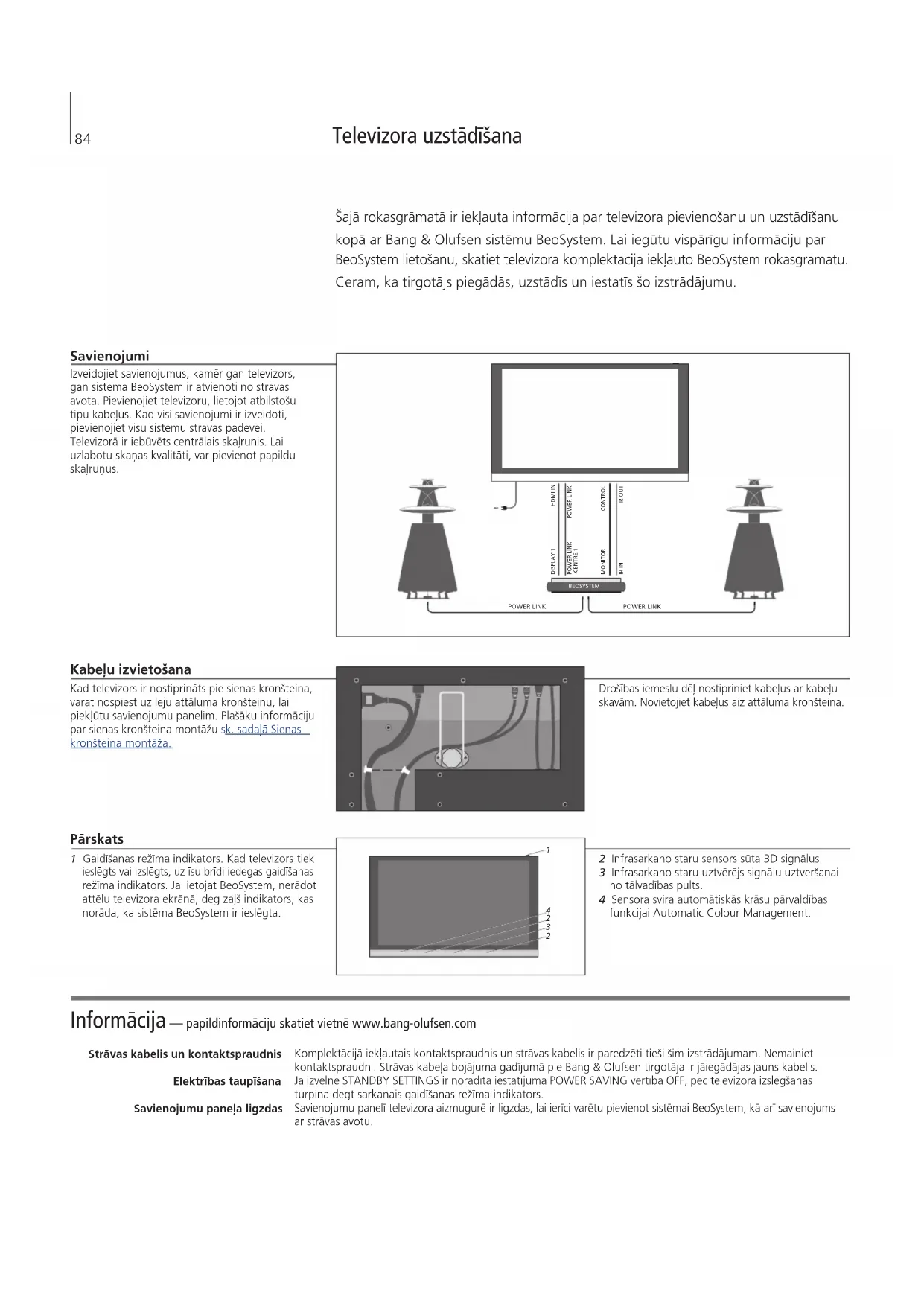 4Informācija— papildinformāciju skatiet vietnē www.bang-olufsen.com Strāvas kabelis un kontaktspraudnis Elektrības taupīšana Savienojumu paneļa ligzdas Komplektācijā iekļautais kontaktspraudnis un strāvas kabelis ir paredzēti tieši šim izstrādājumam. Nemainiet kontaktspraudni. Strāvas kabeļa bojājuma gadījumā pie Bang&Olufsen tirgotāja ir jāiegādājas jauns kabelis. Ja izvēlnē STANDBY SETTINGS ir norādīta iestatījuma POWER SAVING vērtība OFF, pēc televizora izslēgšanas turpina degt sarkanais gaidīšanas režīma indikators. Savienojumu panelī televizora aizmugurē ir ligzdas, lai ierīci varētu pievienot sistēmai BeoSystem, kā arī savienojums ar strāvas avotu. Televizora uzstādīšana Šajā rokasgrāmatā ir iekļauta informācija par televizora pievienošanu un uzstādīšanu kopā ar Bang&Olufsen sistēmu BeoSystem. Lai iegūtu vispārīgu informāciju par BeoSystem lietošanu, skatiet televizora komplektācijā iekļauto BeoSystem rokasgrāmatu. Ceram, ka tirgotājs piegādās, uzstādīs un iestatīs šo izstrādājumu. Kabeļu izvietošana Kad televizors ir nostiprināts pie sienas kronšteina, varat nospiest uz leju attāluma kronšteinu, lai piekļūtu savienojumu panelim. Plašāku informāciju par sienas kronšteina montāžu sk. sadaļā Sienas kronšteina montāža. Savienojumi Izveidojiet savienojumus, kamēr gan televizors, gan sistēma BeoSystem ir atvienoti no strāvas avota. Pievienojiet televizoru, lietojot atbilstošu tipu kabeļus. Kad visi savienojumi ir izveidoti, pievienojiet visu sistēmu strāvas padevei. Televizorā ir iebūvēts centrālais skaļrunis. Lai uzlabotu skaņas kvalitāti, var pievienot papildu skaļruņus. Pārskats 1 Gaidīšanas režīma indikators. Kad televizors tiek ieslēgts vai izslēgts, uz īsu brīdi iedegas gaidīšanas režīma indikators. Ja lietojat BeoSystem, nerādot attēlu televizora ekrānā, deg zaļš indikators, kas norāda, ka sistēma BeoSystem ir ieslēgta. 2 Infrasarkano staru sensors sūta 3D signālus. 3 Infrasarkano staru uztvērējs signālu uztveršanai no tālvadības pults. 4 Sensora svira automātiskās krāsu pārvaldības funkcijai Automatic Colour Management. Drošības iemeslu dēļ nostipriniet kabeļus ar kabeļu skavām. Novietojiet kabeļus aiz attāluma kronšteina.
