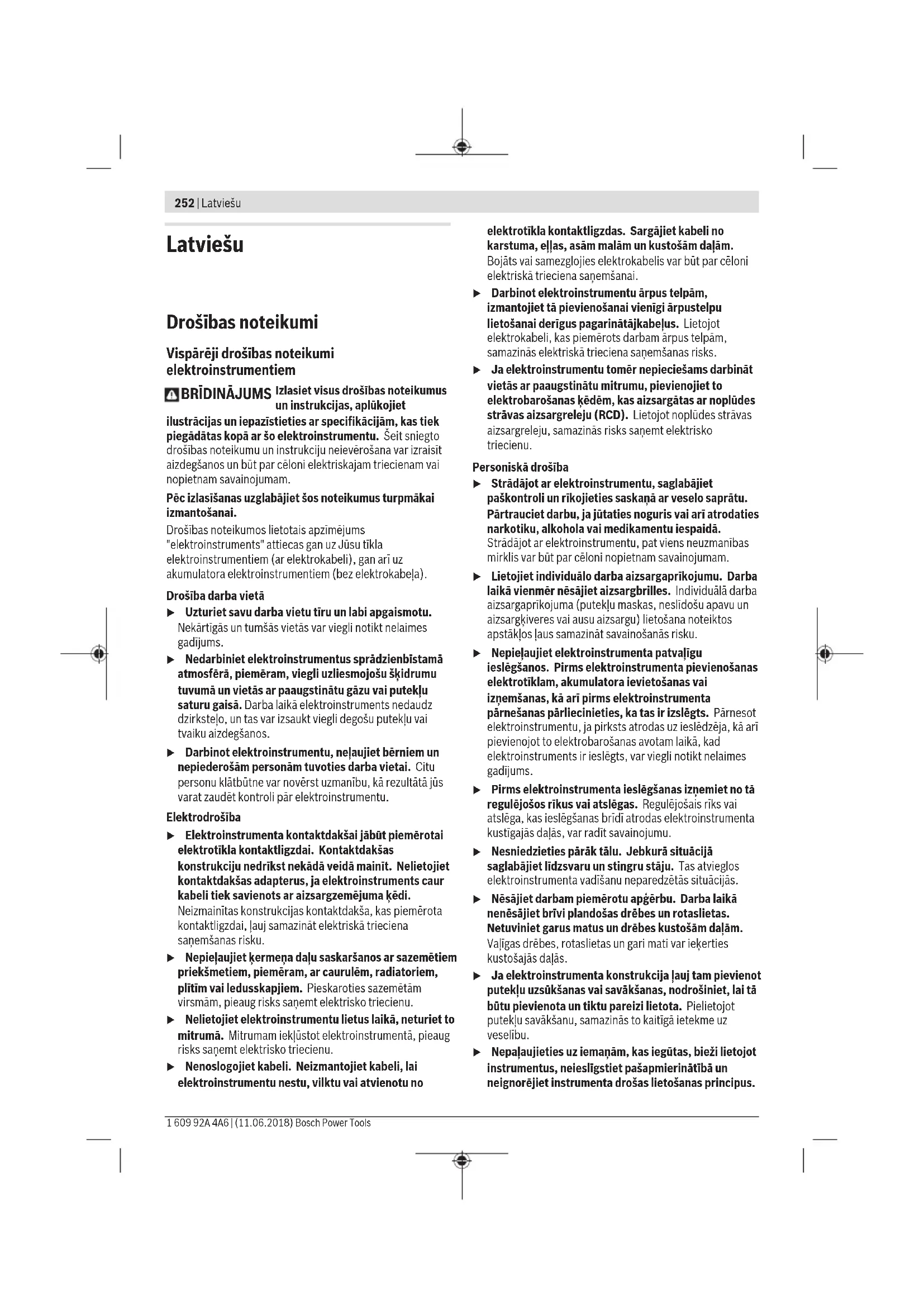 Izlasiet visus drošības noteikumus un instrukcijas, aplūkojiet ilustrācijas un iepazīstieties ar specifikācijām, kas tiek piegādātas kopā ar šo elektroinstrumentu. Šeit sniegto drošības noteikumu un instrukciju neievērošana var izraisīt aizdegšanos un būt par cēloni elektriskajam triecienam vai nopietnam savainojumam. Pēc izlasīšanas uzglabājiet šos noteikumus turpmākai izmantošanai. Drošības noteikumos lietotais apzīmējums "elektroinstruments" attiecas gan uz Jūsu tīkla elektroinstrumentiem (ar elektrokabeli), gan arī uz akumulatora elektroinstrumentiem (bez elektrokabeļa). Drošība darba vietā u Uzturiet savu darba vietu tīru un labi apgaismotu. Nekārtīgās un tumšās vietās var viegli notikt nelaimes gadījums. u Nedarbiniet elektroinstrumentus sprādzienbīstamā atmosfērā, piemēram, viegli uzliesmojošu šķidrumu tuvumā un vietās ar paaugstinātu gāzu vai putekļu saturu gaisā. Darba laikā elektroinstruments nedaudz dzirksteļo, un tas var izsaukt viegli degošu putekļu vai tvaiku aizdegšanos. u Darbinot elektroinstrumentu, neļaujiet bērniem un nepiederošām personām tuvoties darba vietai. Citu personu klātbūtne var novērst uzmanību, kā rezultātā jūs varat zaudēt kontroli pār elektroinstrumentu. Elektrodrošība u Elektroinstrumenta kontaktdakšai jābūt piemērotai elektrotīkla kontaktligzdai. Kontaktdakšas konstrukciju nedrīkst nekādā veidā mainīt. Nelietojiet kontaktdakšas adapterus, ja elektroinstruments caur kabeli tiek savienots ar aizsargzemējuma ķēdi. Neizmainītas konstrukcijas kontaktdakša, kas piemērota kontaktligzdai, ļauj samazināt elektriskā trieciena saņemšanas risku. u Nepieļaujiet ķermeņa daļu saskaršanos ar sazemētiem priekšmetiem, piemēram, ar caurulēm, radiatoriem, plītīm vai ledusskapjiem. Pieskaroties sazemētām virsmām, pieaug risks saņemt elektrisko triecienu. u Nelietojiet elektroinstrumentu lietus laikā, neturiet to mitrumā. Mitrumam iekļūstot elektroinstrumentā, pieaug risks saņemt elektrisko triecienu. u Nenoslogojiet kabeli. Neizmantojiet kabeli, lai elektroinstrumentu nestu, vilktu vai atvienotu no elektrotīkla kontaktligzdas. Sargājiet kabeli no karstuma, eļļas, asām malām un kustošām daļām. Bojāts vai samezglojies elektrokabelis var būt par cēloni elektriskā trieciena saņemšanai. u Darbinot elektroinstrumentu ārpus telpām, izmantojiet tā pievienošanai vienīgi ārpustelpu lietošanai derīgus pagarinātājkabeļus. Lietojot elektrokabeli, kas piemērots darbam ārpus telpām, samazinās elektriskā trieciena saņemšanas risks. u Ja elektroinstrumentu tomēr nepieciešams darbināt vietās ar paaugstinātu mitrumu, pievienojiet to elektrobarošanas ķēdēm, kas aizsargātas ar noplūdes strāvas aizsargreleju (RCD). Lietojot noplūdes strāvas aizsargreleju, samazinās risks saņemt elektrisko triecienu. Personiskā drošība u Strādājot ar elektroinstrumentu, saglabājiet paškontroli un rīkojieties saskaņā ar veselo saprātu. Pārtrauciet darbu, ja jūtaties noguris vai arī atrodaties narkotiku, alkohola vai medikamentu iespaidā. Strādājot ar elektroinstrumentu, pat viens neuzmanības mirklis var būt par cēloni nopietnam savainojumam. u Lietojiet individuālo darba aizsargaprīkojumu. Darba laikā vienmēr nēsājiet aizsargbrilles. Individuālā darba aizsargaprīkojuma (putekļu maskas, neslīdošu apavu un aizsargķiveres vai ausu aizsargu) lietošana noteiktos apstākļos ļaus samazināt savainošanās risku. u Nepieļaujiet elektroinstrumenta patvaļīgu ieslēgšanos. Pirms elektroinstrumenta pievienošanas elektrotīklam, akumulatora ievietošanas vai izņemšanas, kā arī pirms elektroinstrumenta pārnešanas pārliecinieties, ka tas ir izslēgts. Pārnesot elektroinstrumentu, ja pirksts atrodas uz ieslēdzēja, kā arī pievienojot to elektrobarošanas avotam laikā, kad elektroinstruments ir ieslēgts, var viegli notikt nelaimes gadījums. u Pirms elektroinstrumenta ieslēgšanas izņemiet no tā regulējošos rīkus vai atslēgas. Regulējošais rīks vai atslēga, kas ieslēgšanas brīdī atrodas elektroinstrumenta kustīgajās daļās, var radīt savainojumu. u Nesniedzieties pārāk tālu. Jebkurā situācijā saglabājiet līdzsvaru un stingru stāju. Tas atvieglos elektroinstrumenta vadīšanu neparedzētās situācijās. u Nēsājiet darbam piemērotu apģērbu. Darba laikā nenēsājiet brīvi plandošas drēbes un rotaslietas. Netuviniet garus matus un drēbes kustošām daļām. Vaļīgas drēbes, rotaslietas un gari mati var ieķerties kustošajās daļās. u Ja elektroinstrumenta konstrukcija ļauj tam pievienot putekļu uzsūkšanas vai savākšanas, nodrošiniet, lai tā būtu pievienota un tiktu pareizi lietota. Pielietojot putekļu savākšanu, samazinās to kaitīgā ietekme uz veselību. u Nepaļaujieties uz iemaņām, kas iegūtas, bieži lietojot instrumentus, neieslīgstiet pašapmierinātībā un neignorējiet instrumenta drošas lietošanas principus.Neuzmanīgas rīcības dēļ dažās sekundes daļās var gūt nopietnu savainojumu. Saudzīga apiešanās un darbs ar elektroinstrumentiem u Nepārslogojiet elektroinstrumentu. Ikvienam darbam izvēlieties piemērotu elektroinstrumentu. Elektroinstruments darbojas labāk un drošāk pie nominālās slodzes. u Nelietojiet elektroinstrumentu, ja to ar ieslēdzēja palīdzību nevar ieslēgt un izslēgt. Elektroinstruments, ko nevar ieslēgt un izslēgt, ir bīstams lietošanai un to nepieciešams remontēt. u Pirms elektroinstrumenta regulēšanas, piederumu nomaiņas vai novietošanas uzglabāšanai atvienojiet tā elektrokabeļa kontaktdakšu no barojošā elektrotīkla vai izņemiet no tā akumulatoru, ja tas ir izņemams. Šādi iespējams novērst elektroinstrumenta nejaušu ieslēgšanos. u Ja elektroinstruments netiek lietots, uzglabājiet to piemērotā vietā, kur elektroinstruments nav sasniedzams bērniem un personām, kur