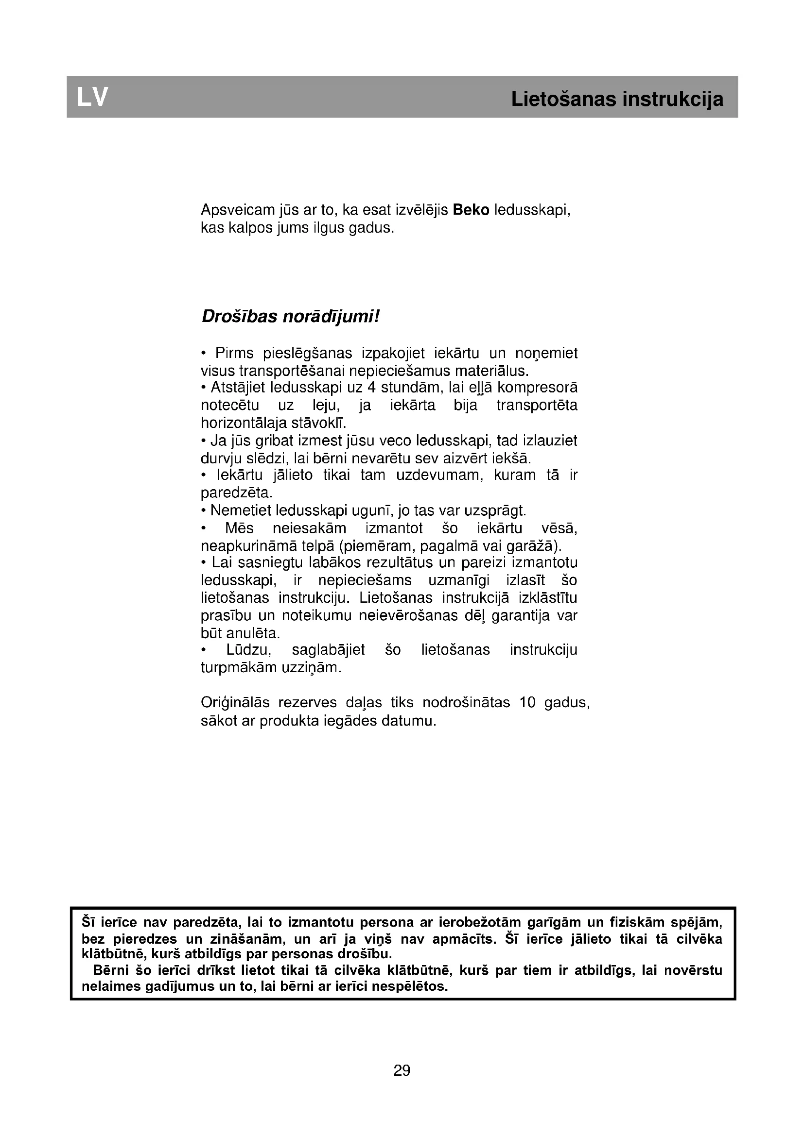 Simbols uz produkta vai tā iepakojuma norāda, ka jūs nedrīkstiet no tā atbrīvoties kā no mājsaimniecības atkritumiem. Tā vietā šis produkts jānogādā attiecīgajā savākšanas punktā, kurā tiek pieņemtas elektriskās un elektroniskās iekārtas otrreizējai izejvielu pārstrādei. Pareizi atbrīvojoties no šī produkta, jūs palīdzēsit novērst tā potenciālo negatīvo ietekmi uz vidi un cilvēku veselību, kas var rasties tad, ja neatbrīvosities no šī produkta pareizā veidā. Lai saņemtu sīkāku informāciju par šī produkta otrreizējo pārstrādāšanu, lūdzu, sazinieties ar savu vietējo pilsētas biroju, savu mājsaimniecības atkritumu savākšanas dienestu vai veikalu, kurā jūs šo produktu iegādājāties.Sveikiname Jus pasirinkus Beko kokybišką prietaisą, sukurtą Jums tarnauti daugelį metų. Sauga Prieš jungdami šaldytuvą į tinklą patikrinkite, ar nuėmėte visas pakuotės medžiagas ir transportavimo apsaugas.