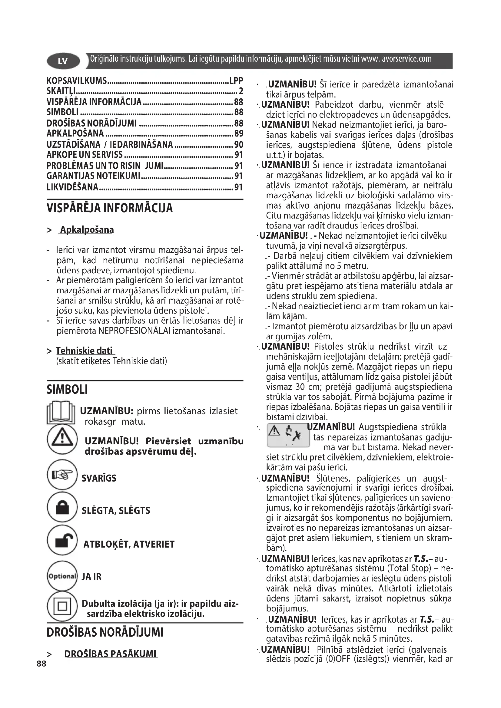 > Apkalpošana - Ierīci var izmantot virsmu mazgāšanai ārpus tel- pām, kad netīrumu notīrīšanai nepieciešama ūdens padeve, izmantojot spiedienu. - Ar piemērotām palī gierīcēm šo ierīci var izmantot mazgāšanai ar mazgāšanas līdzekli un putām, tīrī- šanai ar smilšu strūklu, kā arī mazgāšanai ar rotē- jošo suku, kas pievienota ūdens pistolei. - Šī ierīce savas darbības un ērtās lietošanas dēļ ir piemērota NEPROFESIONĀLAI izmantošanai. > Tehniskie dati (skatīt etiķetes Tehniskie dati) SIMBOLI UZMANĪBU: pirms lietošanas izlasiet rokasgr matu. UZMANĪBU! Pievērsiet uzmanību drošības apsvērumu dēļ. SVARĪGS