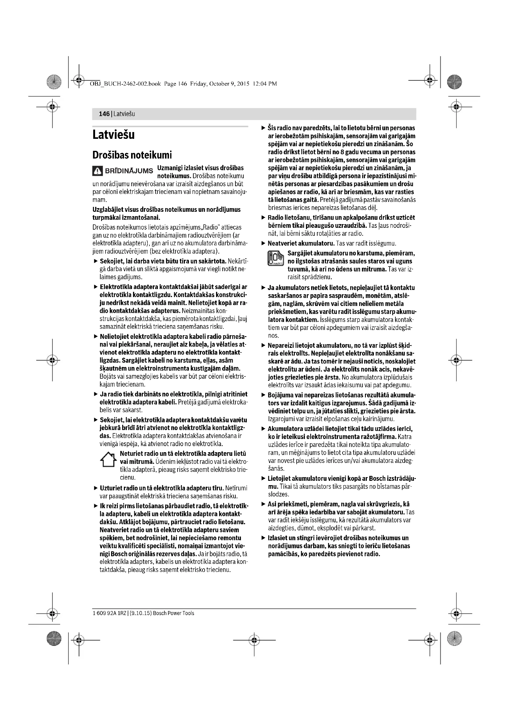 Patareide sissepanekul ei ole jälgitud polaarsust Asetage puhverpatareid sisse õigesti OBJ_BUCH-2462-002.book Page 145 Friday, October 9, 2015 12:04 PM146 | Latviešu 1 609 92A 1RZ | (9.10.15) Bosch Power Tools Latviešu Drošības noteikumi Uzmanīgi izlasiet visus drošības noteikumus. Drošības noteikumu un norādījumu neievērošana var izraisīt aizdegšanos un būt par cēloni elektriskajam triecienam vai nopietnam savainoju- mam. Uzglabājiet visus drošības noteikumus un norādījumus turpmākai izmantošanai. Drošības noteikumos lietotais apzīmējums„Radio“ attiecas gan uz no elektrotīkla darbināmajiem radiouztvērējiem (ar elektrotīkla adapteru), gan arī uz no akumulatora darbināma- jiem radiouztvērējiem (bez elektrotīkla adaptera). Sekojiet, lai darba vieta būtu tīra un sakārtota. Nekārtī- gā darba vietā un sliktā apgaismojumā var viegli notikt ne- laimes gadījums. Elektrotīkla adaptera kontaktdakšai jābūt saderīgai ar elektrotīkla kontaktligzdu. Kontaktdakšas konstrukci- ju nedrīkst nekādā veidā mainīt. Nelietojiet kopā ar ra- dio kontaktdakšas adapterus. Neizmainītas kon- strukcijas kontaktdakša, kas piemērota kontaktligzdai, ļauj samazināt elektriskā trieciena saņemšanas risku. Nelietojiet elektrotīkla adaptera kabeli radio pārneša- nai vai piekāršanai, neraujiet aiz kabeļa, ja vēlaties at- vienot elektrotīkla adapteru no elektrotīkla kontakt- ligzdas. Sargājiet kabeli no karstuma, eļļas, asām šķautnēm un elektroinstrumenta kustīgajām daļām. Bojāts vai samezglojies kabelis var būt par cēloni elektris- kajam triecienam. Ja radio tiek darbināts no elektrotīkla, pilnīgi atritiniet elektrotīkla adaptera kabeli. Pretējā gadījumā elektroka- belis var sakarst. Sekojiet, lai elektrotīkla adaptera kontaktdakšu var ētu jebkurā brīdī ātri atvienot no elektrotīkla kontaktligz- das. Elektrotīkla adaptera kontaktdakšas atvienošana ir vienīgā iespēja, kā atvienot radio no elektrotīkla. Neturiet radio un tā elektrotīkla adapteru lietū vai mitrumā. Ūdenim iekļūstot radio vai tā elektro- tīkla adapterā, pieaug risks saņemt elektrisko trie- cienu. Uzturiet radio un tā elektrotīkla adapteru tīru. Netīrumi var paaugstināt elektriskā trieciena saņemšanas risku. Ik reizi pirms lietošanas pārbaudiet radio, tā elektrotīk- la adapteru, kabeli un elektrotīkla adaptera kontakt- dakšu. Atklājot bojājumu, pārtrauciet radio lietošanu. Neatveriet radio un tā elektrotīkla adapteru saviem spēkiem, bet nodrošiniet, lai nepieciešamo remontu veiktu kvalificēti speciā listi, nomaiņai izmantojot vie- nīgi Bosch oriģinālās rezerves daļas. Ja ir bojāts radio, tā elektrotīkla adapters, kabelis un elektrotīkla adaptera kon- taktdakša, pieaug risks saņemt elektrisko triecienu. Šis radio nav paredzēts, lai to lietotu bērni un personas ar ierobežotām psihiskajām, sensorajām vai garīgajām spējām vai ar nepietiekošu pieredzi un zināšanām. Šo radio drīkst lietot bērni no 8 gadu vecuma un personas ar ierobežotām psihiskajām, sensorajām vai garīgajām spējām vai ar nepietiekošu pieredzi un zināšanām, ja par viņu drošību atbildīgā persona ir iepazīstinājusi mi- nētās personas ar piesardzības pasākumiem un drošu apiešanos ar radio, k ā arī ar briesmām, kas var rasties tā lietošanas gaitā. Pretējā gadījumā pastāv savainošanās briesmas ierīces nepareizas lietošanas dēļ. Radio lietošanu, tīrīšanu un apkalpošanu drīkst uzticēt bērniem tikai pieaugušo uzraudzībā. Tas ļaus nodroši- nāt, lai bērni sāktu rotaļāties ar radio. Neatveriet akumulatoru. Tas var radīt īsslēgumu. Sargājiet akumulatoru no karstuma, piemēram, no ilgstošas atrašanās saules staros vai uguns tuvumā, kā arī no ūdens un mitruma. Tas var iz- raisīt sprādzienu. Ja akumulators netiek lietots, nepieļaujiet tā kontaktu saskaršanos ar papīra saspraudēm, mon ētām, atslē- gām, naglām, skrūvēm vai citiem nelieliem metāla priekšmetiem, kas varētu radīt īsslēgumu starp akumu- latora kontaktiem. Īsslēgums starp akumulatora kontak- tiem var būt par cēloni apdegumiem vai izraisīt aizdegša- nos. Nepareizi lietojot akumulatoru, no tā var izplūst šķid- rais elektrolīts. Nepieļaujiet elektrolīta nonākšanu sa- skarē ar ādu. Ja tas tomēr ir nejauši noticis, noskalojiet elektrolītu ar ūdeni. Ja elektrolīts nonāk acīs, nekavē- joties griezieties pie ārsta. No akumulatora izplūdušais elektrolīts var izsaukt ādas iekaisumu vai pat apdegumu. Bojājuma vai nepareizas lietošanas rezultātā akumula- tors var izdalīt kaitīgus izgarojumus. Š ādā gadījumā iz- vēdiniet telpu un, ja jūtaties slikti, griezieties pie ārsta. Izgarojumi var izraisīt elpošanas ceļu kairinājumu. Akumulatora uzlādei lietojiet tikai tādu uzlādes ierīci, ko ir ieteikusi elektroinstrumenta ražotājfirma. Katra uzlādes ierīce ir paredzēta tikai noteikta tipa akumulato- ram, un mēģinājums to lietot cita tipa akumulatoru uzlādei var novest pie uzlādes ierīces un/vai akumulatora aizdeg- šanās. Lietojiet akumulatoru vienīgi kopā ar Bosch izstrādāju- mu. Tikai tā akumulators tiks pasargāts no bīstamas pār- slodzes. Asi priekšmeti, piemēram, nagla vai skrūvgriezis, kā arī ārēja spēka iedarbība var sabojāt akumulatoru. Tas var radīt iekšēju īsslēgumu, kā rezultātā akumulators var aizdegties, dūmot, eksplodēt vai pārkarst. Izlasiet un stingri ievērojiet drošības noteikumus un norādījumus darbam, kas sniegti to ierīču lietošanas pamācībās, ko paredzēts pievienot radio. BRIDINAJUMS OBJ_BUCH-2462-002.book Page 146 Friday, October 9, 2015 12:04 PMLatviešu | 147 Bosch Power Tools 1 609 92A 1RZ | (9.10.15) Izstrādājuma un tā darbības apraksts Uzmanīgi izlasiet visus drošības noteiku- mus. Šeit sniegto drošības noteikumu un norā- dījumu neievērošana var izraisīt aizdeg