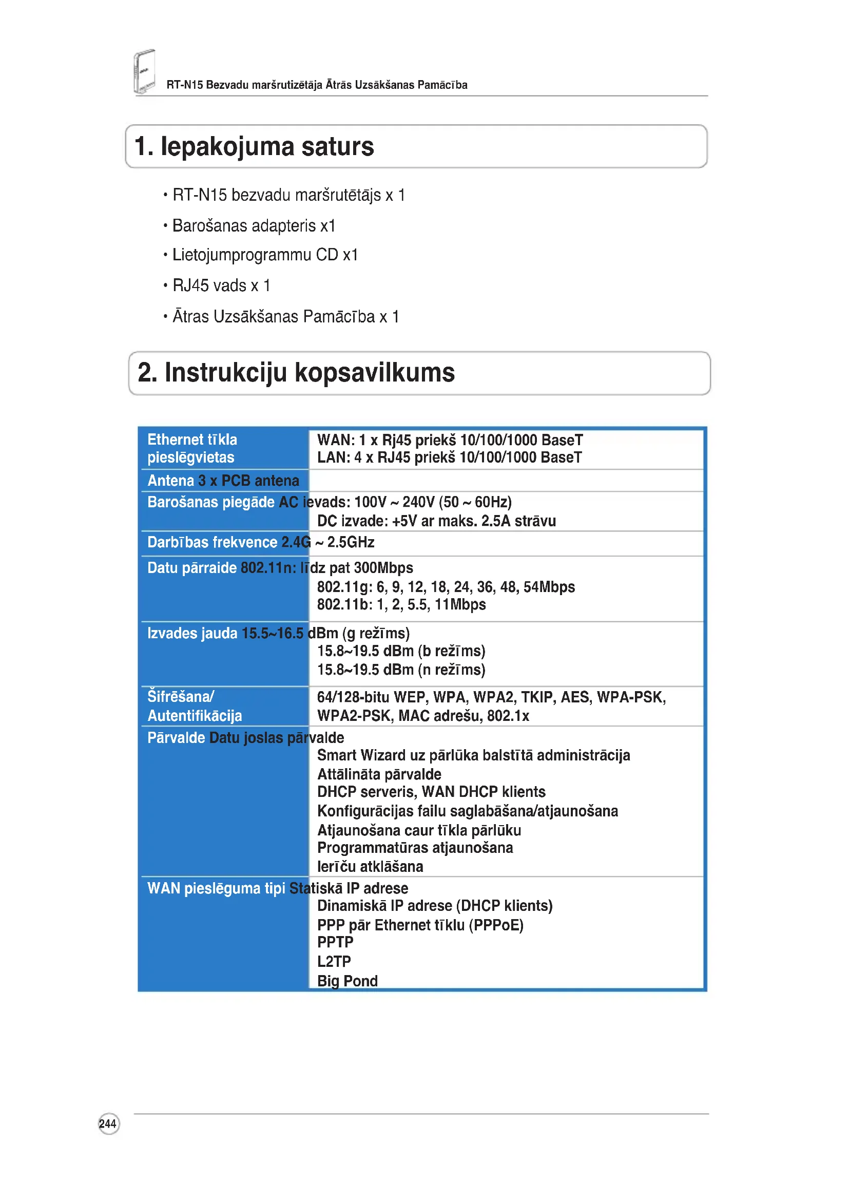 Ethernet tīkla pieslēgvietas WAN: 1 x Rj45 priekš 10/100/1000 BaseT LAN: 4 x RJ45 priekš 10/100/1000 BaseT Antena 3 x PCB antena Barošanas piegāde AC ievads: 100V ~ 240V (50 ~ 60Hz) DC izvade: +5V ar maks. 2.5A strāvu Darbības frekvence 2.4G ~ 2.5GHz Datu pārraide 802.11n: līdz pat 300Mbps 802.11g: 6, 9, 12, 18, 24, 36, 48, 54Mbps 802.11b: 1, 2, 5.5, 11Mbps Izvades jauda 15.5~16.5 dBm (g režīms) 15.8~19.5 dBm (b režīms) 15.8~19.5 dBm (n režīms) Šifrēšana/ Autentikācija 64/128-bitu WEP, WPA, WPA2, TKIP, AES, WPA-PSK, WPA2-PSK, MAC adrešu, 802.1x Pārvalde Datu joslas pārvalde Smart Wizard uz pārlūka balstītā administrācija Attālināta pārvalde DHCP serveris, WAN DHCP klients Kongurācijas failu saglabāšana/atjaunošana Atjaunošana caur tīkla pārlūku Programmatūras atjaunošana Ierīču atklāšana WAN pieslēguma tipi Statiskā IP adrese Dinamiskā IP adrese (DHCP klients) PPP pār Ethernet tīklu (PPPoE) PPTP L2TP Big PondRT-N15 Bezvadu maršrutizētāja Ātrās Uzsākšanas Pamācība