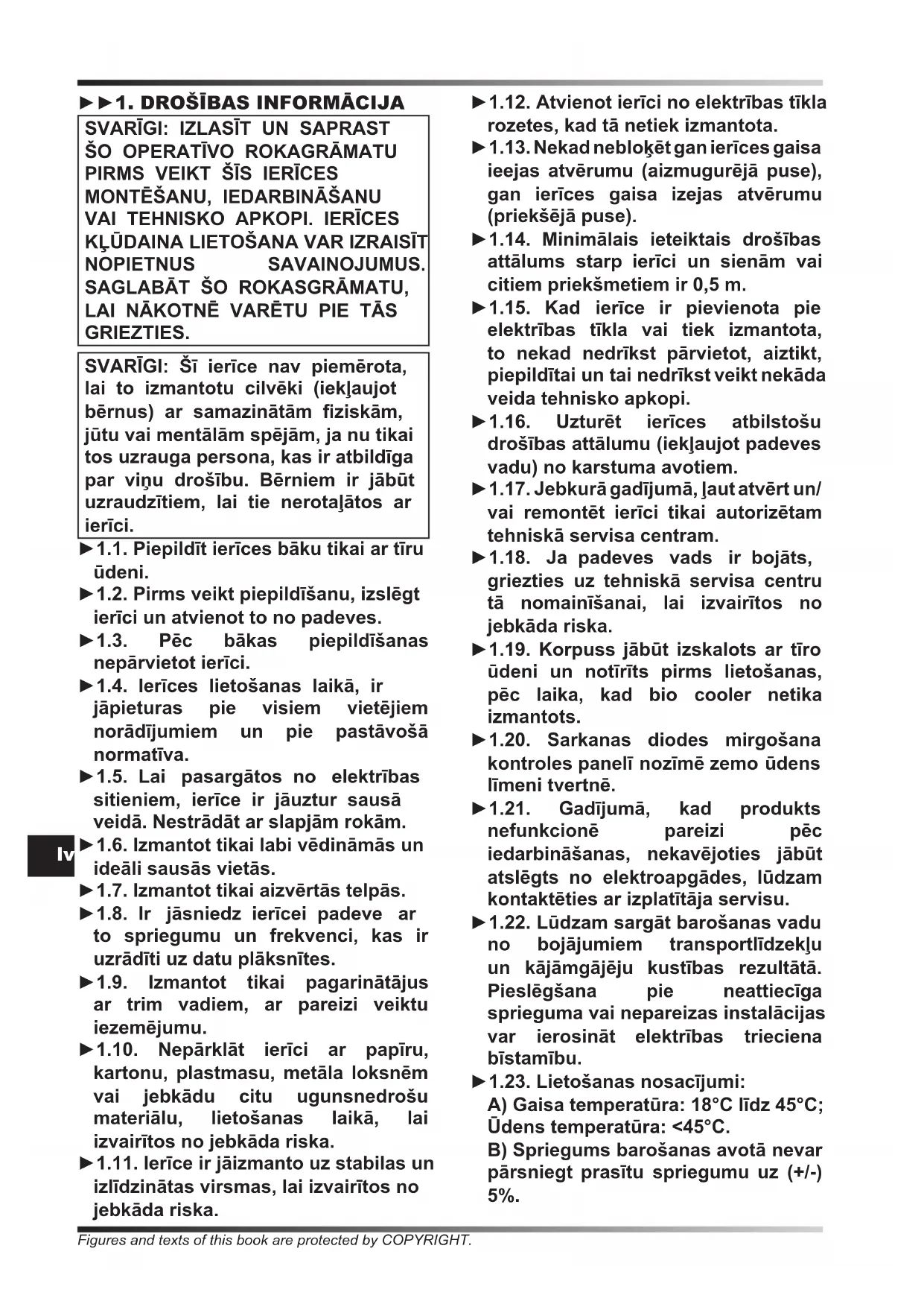 KĻŪDAINA LIETOŠANA VAR IZRAISĪT NOPIETNUS SAVAINOJUMUS. SAGLABĀT ŠO ROKASGRĀMATU, LAI NĀKOTNĒ VARĒTU PIE TĀS GRIEZTIES. SVARĪGI: Šī ierīce nav piemērota, lai to izmantotu cilvēki (iekļaujot bērnus) ar samazinātām ziskām, jūtu vai mentālām spējām, ja nu tikai tos uzrauga persona, kas ir atbildīga par viņu drošību. Bērniem ir jābūt uzraudzītiem, lai tie nerotaļātos ar ierīci. ►1.1. Piepildīt ierīces bāku tikai ar tīru ūdeni. ►1.2. Pirms veikt piepildīšanu, izslēgt ierīci un atvienot to no padeves. ►1.3. Pēc bākas piepildīšanas nepārvietot ierīci. ►1.4. Ierīces lietošanas laikā, ir jāpieturas pie visiem vietējiem norādījumiem un pie pastāvošā normatīva. ►1.5. Lai pasargātos no elektrības sitieniem, ierīce ir jāuztur sausā veidā. Nestrādāt ar slapjām rokām. ►1.6. Izmantot tikai labi vēdināmās un ideāli sausās vietās. ►1.7. Izmantot tikai aizvērtās telpās. ►1.8. Ir jāsniedz ierīcei padeve ar to spriegumu un frekvenci, kas ir uzrādīti uz datu plāksnītes. ►1.9. Izmantot tikai pagarinātājus ar trim vadiem, ar pareizi veiktu iezemējumu. ►1.10. Nepārklāt ierīci ar papīru, kartonu, plastmasu, metāla loksnēm vai jebkādu citu ugunsnedrošu materiālu, lietošanas laikā, lai izvairītos no jebkāda riska. ►1.11. Ierīce ir jāizmanto uz stabilas un izlīdzinātas virsmas, lai izvairītos no jebkāda riska. ►1.12. Atvienot ierīci no elektrības tīkla rozetes, kad tā netiek izmantota. ►1.13. Nekad nebloķēt gan ierīces gaisa ieejas atvērumu (aizmugurējā puse), gan ierīces gaisa izejas atvērumu (priekšējā puse). ►1.14. Minimālais ieteiktais drošības attālums starp ierīci un sienām vai citiem priekšmetiem ir 0,5 m. ►1.15. Kad ierīce ir pievienota pie elektrības tīkla vai tiek izmantota, to nekad nedrīkst pārvietot, aiztikt, piepildītai un tai nedrīkst veikt nekāda veida tehnisko apkopi. ►1.16. Uzturēt ierīces atbilstošu drošības attālumu (iekļaujot padeves vadu) no karstuma avotiem. ►1.17. Jebkurā gadījumā, ļaut atvērt un/ vai remontēt ierīci tikai autorizētam tehniskā servisa centram. ►1.18. Ja padeves vads ir bojāts, griezties uz tehniskā servisa centru tā nomainīšanai, lai izvairītos no jebkāda riska. ►1.19. Korpuss jābūt izskalots ar tīro ūdeni un notīrīts pirms lietošanas, pēc laika, kad bio cooler netika izmantots. ►1.20. Sarkanas diodes mirgošana kontroles panelī nozīmē zemo ūdens līmeni tvertnē. ►1.21. Gadījumā, kad produkts nefunkcionē pareizi pēc iedarbināšanas, nekavējoties jābūt atslēgts no elektroapgādes, lūdzam kontaktēties ar izplatītāja servisu. ►1.22. Lūdzam sargāt barošanas vadu no bojājumiem transportlīdzekļu un kājāmgājēju kustības rezultātā. Pieslēgšana pie neattiecīga sprieguma vai nepareizas instalācijas var ierosināt elektrības trieciena bīstamību. ►1.23. Lietošanas nosacījumi: A) Gaisa temperatūra: 18°C līdz 45°C; Ūdens temperatūra: <45°C. B) Spriegums barošanas avotā nevar pārsniegt prasītu spriegumu uz (+/-) 5%. Figures and texts of this book are protected by COPYRIGHT.lv C) Gaisa ieplūde jābūt brīva no putekļiem, piesārņojumiem, ja nepieciešami, izmantojiet papildu tīrīšanu.
