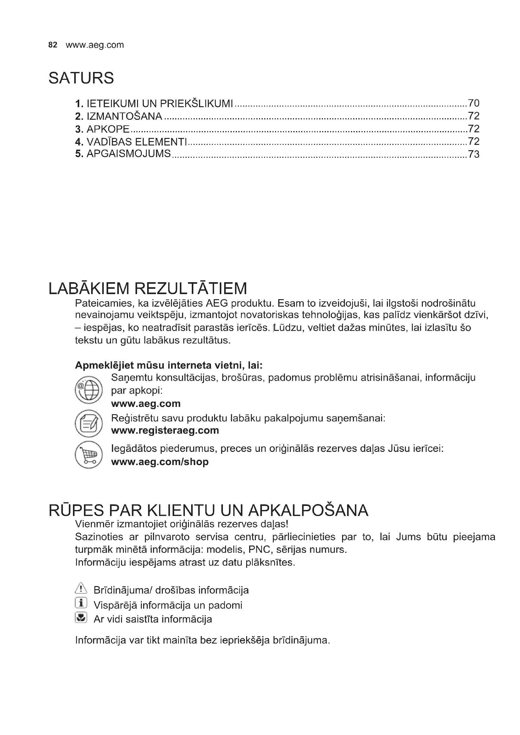 Pateicamies, ka izvēlējāties AEG produktu. Esam to izveidojuši, lai ilgstoši nodrošinātu nevainojamu veiktspēju, izmantojot novatoriskas tehnoloģijas, kas palīdz vienkāršot dzīvi, – iespējas, ko neatradīsit parastās ierīcēs. Lūdzu, veltiet dažas minūtes, lai izlasītu šo tekstu un gūtu labākus rezultātus. Apmeklējiet mūsu interneta vietni, lai: Saņemtu konsultācijas, brošūras, padomus problēmu atrisināšanai, informāciju par apkopi: www.aeg.com Reģistrētu savu produktu labāku pakalpojumu saņemšanai: www.registeraeg.com Iegādātos piederumus, preces un oriģinālās rezerves daļas Jūsu ierīcei: www.aeg.com/shop RŪPES PAR KLIENTU UN APKALPOŠANA Vienmēr izmantojiet oriģinālās rezerves daļas! Sazinoties ar pilnvaroto servisa centru, pārliecinieties par to, lai Jums būtu pieejama turpmāk minētā informācija: modelis, PNC, sērijas numurs. Informāciju iespējams atrast uz datu plāksnītes. Brīdinājuma/ drošības informācija Vispārējā informācija un padomi Ar vidi saistīta informācija Informācija var tikt mainīta bez iepriekšēja brīdinājuma.83 LATVIAN
