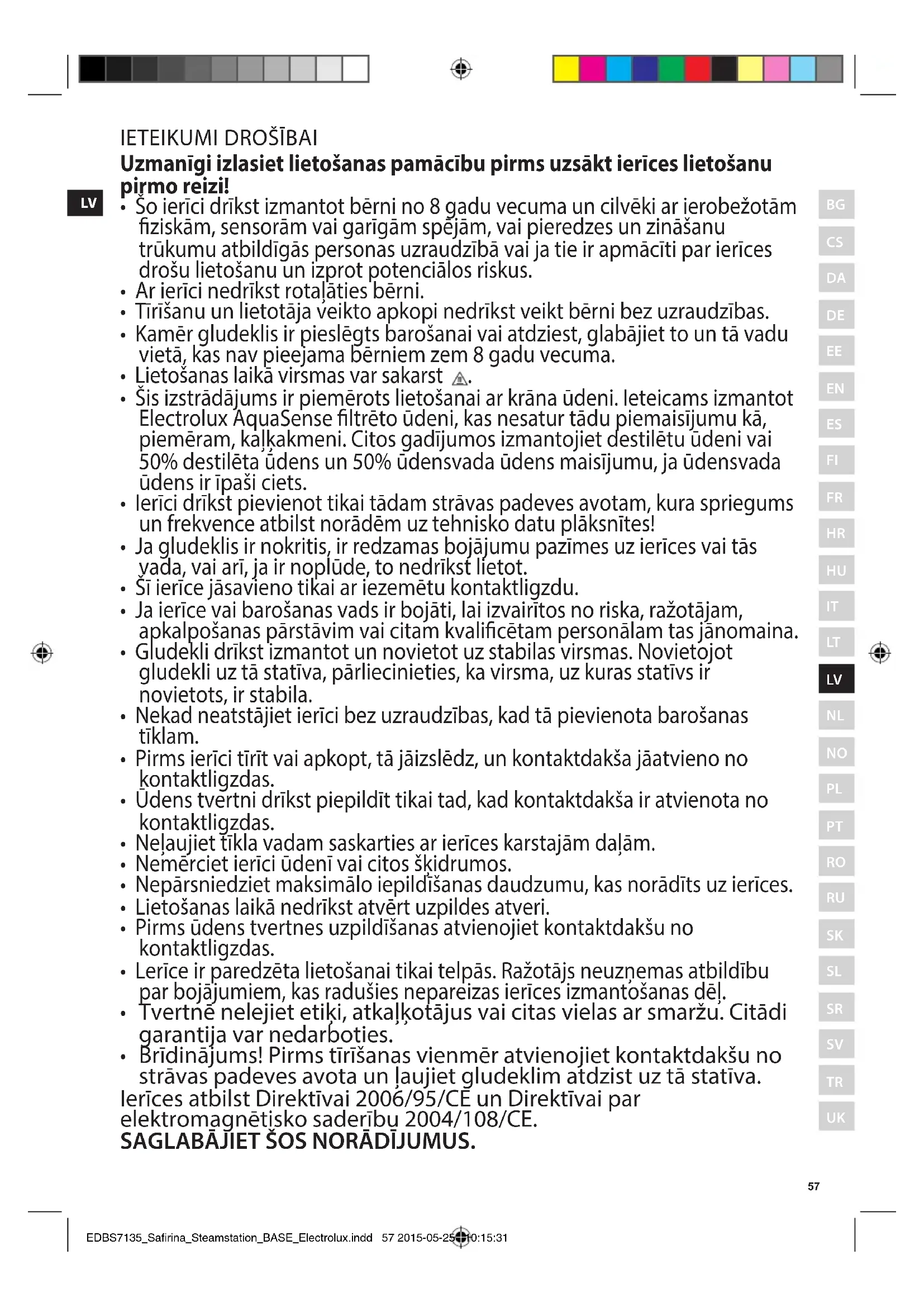 Brīdinājums! Pirms tīrīšanas vienmēr atvienojiet kontaktdakšu no strāvas padeves avota un ļaujiet gludeklim atdzist uz tā statīva. Ierīces atbilst Direktīvai 2006/95/CE un Direktīvai par elektromagnētisko saderību 2004/108/CE. SAGLABĀJIET ŠOS NORĀDĪJUMUS.