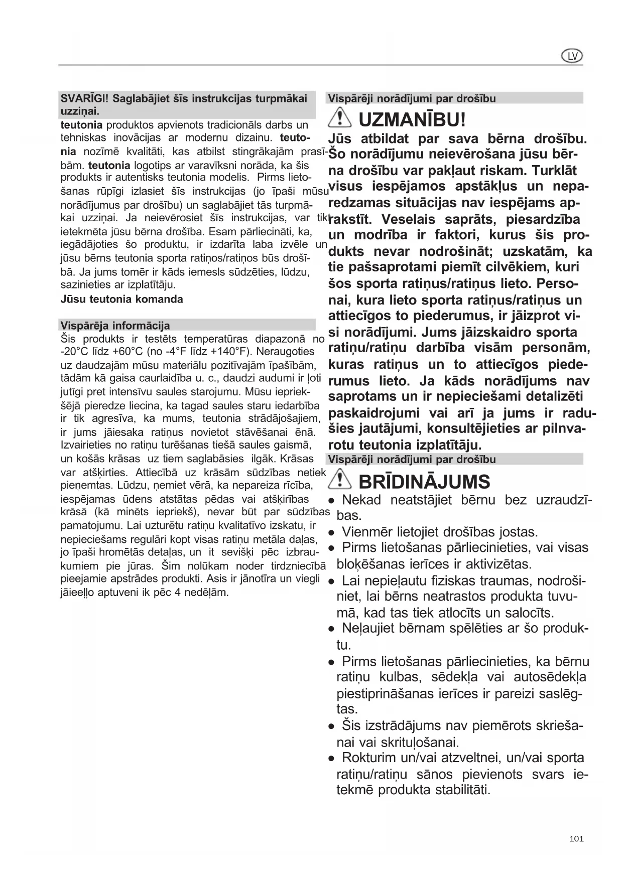 gus priekšmetus vienmēr likt iepirkumu groza centrā. ● Atlokot un salokot šasiju, ievērojiet piesar- dzību, lai neiespiestu ne savas, ne citu rokas. ● Nodrošiniet, lai fiksatori neatvienotos, kamēr nesat sporta ratiņus/ratiņus pāri šķēršļiem (piem., pa pakāpieniem). ● Regulējot sporta ratiņus/ratiņus, nodro- šiniet, lai bērns nevarētu piekļūt kustīga- jām daļām. ● Sporta ratiņus/ratiņus var sabojāt vai sa- lauzt, tos pārslogojot, nepareizi lokot un atlokot vai lietojot neapstiprinātus piede- rumus. ● Kāju balsts nav piemērots smagu nesa- mo vai otra bērna pārvadāšanai. ● Pirms sporta ratiņu/ratiņu lietošanas pir- mo reizi: lūdzu, noņemiet uzlīmes vai eti- ķetes, kas NEATTIECAS uz instrukcijām vai norādījumiem par drošību. ● Nekad nelietojiet kāju balstu vai aizsarg- stieni, lai celtu vai nestu sporta ratiņus/ ratiņus. ● Zīdaiņiem līdz 6 mēnešu vecumam at- zveltni iesakām lietot tikai tās zemākajā pozīcijā. ● Ja apvēršat pārsegu un ievietojat Vario Plus vai Soft Carry Cot, noteikti lietojiet komplektā esošo kulbas spilvenu. Lū- dzu, ievērojiet norādījumus, kas uzdru- kāti tieši uz spilvena. ● Vienmēr izceliet bērnu no sēdekļa, pirms noņemat sēdekli no šasijas. Svarīgi papildu norādījumi par drošību ● Nekad nelietojiet piederumus vai rezer- ves daļas, ko nav ražojis vai atzinis par labām teutonia. teutonia negarantē šī produkta drošumu gadījumā, ja tiek lie- toti piederumi un rezerves daļas, ko nav ražojis vai apstiprinājis teutonia. Šādu piederumu un rezerves daļu lietošanas gadījumā garantija uzreiz tiek anulēta. ● Jebkāds smagums, kas pievienots roktu- rim un/vai muguras atbalsta aizmugurei un/vai vieglo ratiņu/bērna ratiņu malām, ietekmēs ratiņu stabilitāti. ● Šie ratiņi ir paredzēti tikai vienam bērnam. ● Sēdeklīti vai pārnēsājamo kulbu nedrīkst izmantot automašīnā. ● Saliekamo ratiņu sēdeklītis ir paredzēts bērnam no dzimšanas līdz 15 kg svara sasniegšanai. Pārnēsājamās kulbas, ra- tiņus un sporta ratiņus drīkst lietot tikai bērna pārvietošanai; tie neaizstāj gultiņu vai šūpuli. ● Vienmēr novietojiet sporta ratiņus/ratiņus stāvēšanai bērniem nepieejamā vietā un neļaujiet bērniem šajos ratiņos vai ar tiem spēlēties. ● Lūdzu, nekad nenovietojiet sporta rati- ņus/ratiņus stāvēšanai, vispirms neieslē- dzot bremzes. Pārliecinieties, vai brem- zes ir pareizi fiksētas. ● Bremzes jāieslēdz vienmēr, kad sēdināt bērnu sporta ratiņos/ratiņos vai ceļat ārā no tiem. ● Vienmēr izvairieties no ratiņu novietoša- nas stāvēšanai nogāzēs. ● Izmantojot sabiedrisko transportu, ievē- rojiet īpašu piesardzību, lai nodrošinātu to, ka sporta ratiņi/ratiņi ir novietoti stabili un stingri. ● Pa pakāpieniem augšup un lejup sporta ratiņi/ratiņi ir jāripina lēni un uzmanīgi. ● Nekad nelieciet nekādus priekšmetus uz lokāmā pārsega. ● Iepirkumu tīklā var likt, maksimums, 5 kg (11 lbs) smagus pirkumus. Lūdzam sma-103
