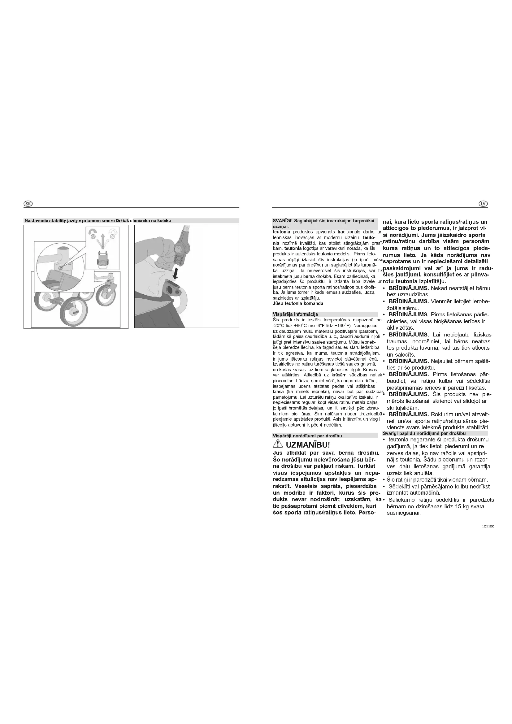 štandardnú súpravu na opravy bicyklov, alebo sprej na prerazené pneumatiky (používa sa napríklad u hor- ských bicyklov, mopedov a pod.). Pri odstraňovaní pneumatiky používajte dve páky, ktoré sú vždy súčasťou kvalitných súprav na opravy bicyklov. V prípade potreby nám koleso pošlite prostredníctvom predajcu. Špeciálne funkcie variantov modelov Modely s deceleračnou brzdou: Deceleračnú brzdu je možné ovládať prostred- níctvom brzdovej páčky na držadle. Akciu pri brzdení je možné presne nastaviť po- mocou nastavovacej skrutky na brzdovej páčke. UPOZORNENIE: Brzda slúži len na spomalenie kolies, nie na ich zablokovanie. Varovanie: V prípade novej objednávky zadných kolies skontroluje, či je dodávateľ informovaný o decelerač- nej brzde, pretože brzda vyžaduje špeciálnu brzdovú platničku. Ak sa použije nesprávna brzdová platnička, brzda nebude fungovať! Údržba: – V dôsledku používania sa brzdové doštičky môžu opotrebovať a je potrebné vykonávať údržbu brzdy. Nastavenie brzdy na brzdovej páčke je možné vy- konať po povolení poistnej matice a odskrutkovaní nastavovacej skrutky. – Ak sa účinok brzdenia na ľavej a pravej strane lí- ši, prevráťte kočík na mäkkom povrchu a nastavte skrutku pod krytom brzdy pri kolesách. – Skrutku je možné zaskrutkovávať a vyskrutkovávať pomocou 8-milimetrového nastavovacieho kľúča. Odskrutkovaním skrutky sa účinok brzdenia zosilňu- je. Nastavenie je potrebné upraviť tak, aby sa účinok brzdenia prejavoval na oboch kolesách rovnako.101100 Nastavenie stability jazdy v priamom smere Držiak slnečníka na kočíku SVARĪGI! Saglabājiet šīs instrukcijas turpmākai uzziņai. teutonia produktos apvienots tradicionāls darbs un tehniskas inovācijas ar modernu dizainu. teuto- nia nozīmē kvalitāti, kas atbilst stingrākajām prasī- bām. teutonia logotips ar varavīksni norāda, ka šis produkts ir autentisks teutonia modelis. Pirms lieto- šanas rūpīgi izlasiet šīs instrukcijas (jo īpaši mūsu norādījumus par drošību) un saglabājiet tās turpmā- kai uzziņai. Ja neievērosiet šīs instrukcijas, var tikt ietekmēta jūsu bērna drošība. Esam pārliecināti, ka, iegādājoties šo produktu, ir izdarīta laba izvēle un jūsu bērns teutonia sporta ratiņos/ratiņos būs drošī- bā. Ja jums tomēr ir kāds iemesls sūdzēties, lūdzu, sazinieties ar izplatītāju. Jūsu teutonia komanda Vispārēja informācija Šis produkts ir testēts temperatūras diapazonā no -20°C līdz +60°C (no -4°F līdz +140°F). Neraugoties uz daudzajām mūsu materiālu pozitīvajām īpašībām, tādām kā gaisa caurlaidība u. c., daudzi audumi ir ļoti jutīgi pret intensīvu saules starojumu. Mūsu iepriek- šējā pieredze liecina, ka tagad saules staru iedarbība ir tik agresīva, ka mums, teutonia strādājošajiem, ir jums jāiesaka ratiņus novietot stāvēšanai ēnā. Izvairieties no ratiņu turēšanas tiešā saules gaismā, un košās krāsas uz tiem saglabāsies ilgāk. Krāsas var atšķirties. Attiecībā uz krāsām sūdzības netiek pieņemtas. Lūdzu, ņemiet vērā, ka nepareiza rīcība, iespējamas ūdens atstātas pēdas vai atšķirības krāsā (kā minēts iepriekš), nevar būt par sūdzības pamatojumu. Lai uzturētu ratiņu kvalitatīvo izskatu, ir nepieciešams regulāri kopt visas ratiņu metāla daļas, jo īpaši hromētās detaļas, un it sevišķi pēc izbrau- kumiem pie jūras. Šim nolūkam noder tirdzniecībā pieejamie apstrādes produkti. Asis ir jānotīra un viegli jāieeļļo aptuveni ik pēc 4 nedēļām. Vispārēji norādījumi par drošību UZMANĪBU! Jūs atbildat par sava bērna drošību. Šo norādījumu neievērošana jūsu bēr- na drošību var pakļaut riskam. Turklāt visus iespējamos apstākļus un nepa- redzamas situācijas nav iespējams ap- rakstīt. Veselais saprāts, piesardzība un modrība ir faktori, kurus šis pro- dukts nevar nodrošināt; uzskatām, ka tie pašsaprotami piemīt cilvēkiem, kuri šos sporta ratiņus/ratiņus lieto. Perso- nai, kura lieto sporta ratiņus/ratiņus un attiecīgos to piederumus, ir jāizprot vi- si norādījumi. Jums jāizskaidro sporta ratiņu/ratiņu darbība visām personām, kuras ratiņus un to attiecīgos piede- rumus lieto. Ja kāds norādījums nav saprotams un ir nepieciešami detalizēti paskaidrojumi vai arī ja jums ir radu- šies jautājumi, konsultējieties ar pilnva- rotu teutonia izplatītāju.
