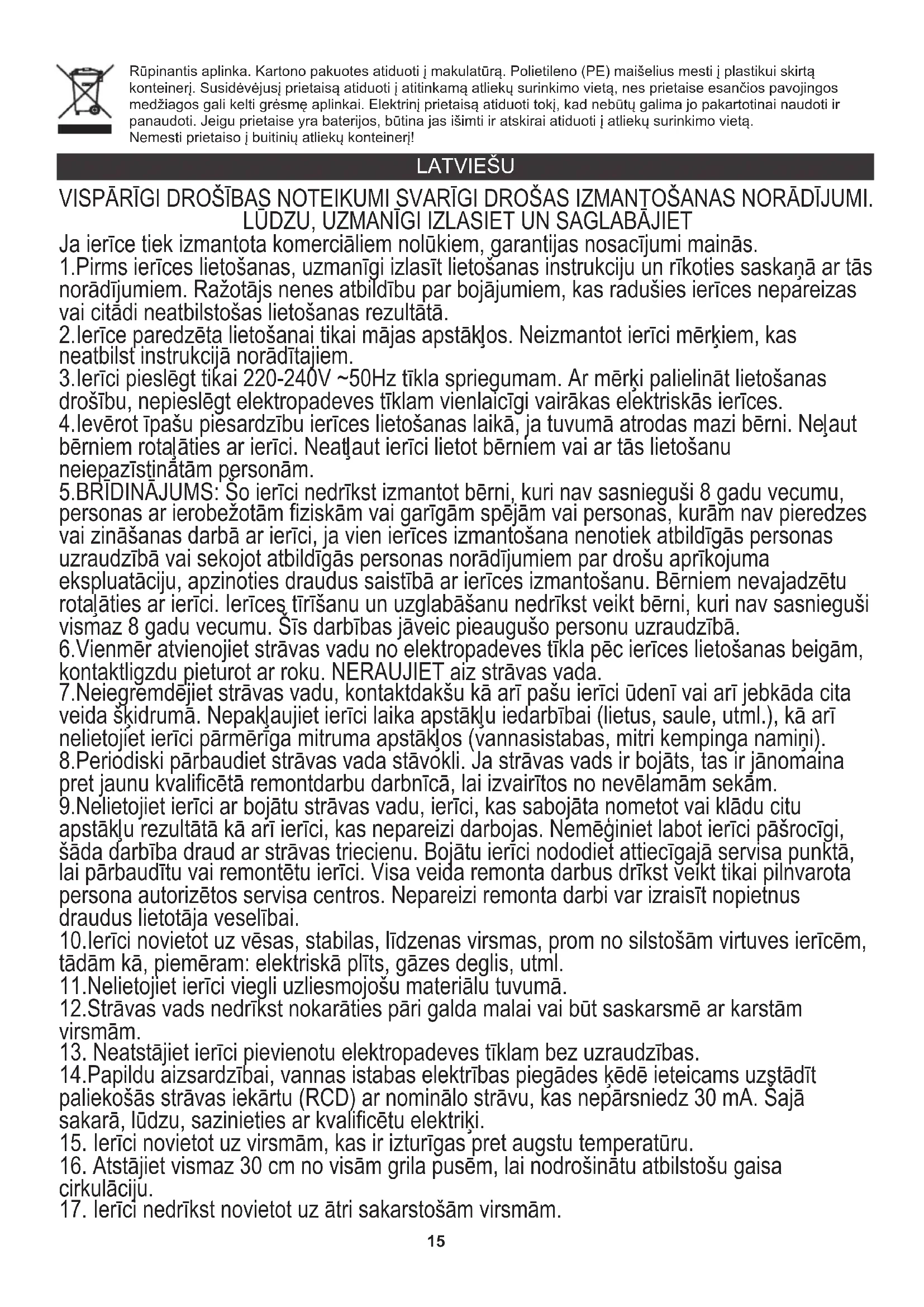 Apkārtējās vides aizsardzība. Kartona iepakojumu, lūdzu, nododiet otreizējai pārstrādei. Polietilēna maisiņus (PE) izmest plastmasas izstrādājumiem paredzētajos konteineros. Lietotās elektropreces nododiet attiecīgajos pieņemšanas punktos. Ierīcē satur bīstamas sastāvdaļas, kas var izraisīt draudus apkārtējai videi. Elektroierīce jānodod tā, lai ierobežotu tās atkārtotu izmantošanu. Ja ierīcē atrodas baterijas, izņemiet tās un nododiet pieņemšanas punktā atsevišķi. Produktu neizmest sadzīves atkritumu konteinerā! EESTI