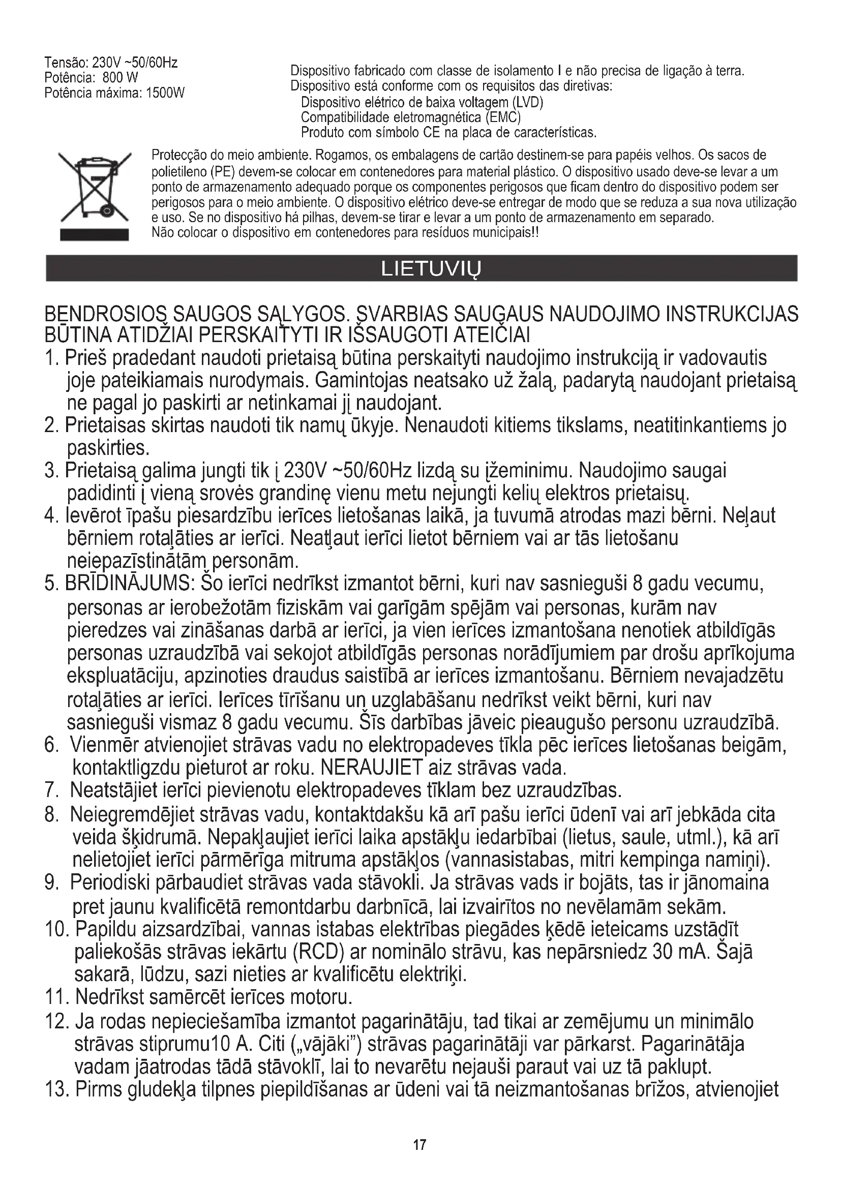 strāvas stiprumu10 A. Citi („vājāki”) strāvas pagarinātāji var pārkarst. Pagarinātāja vadam jāatrodas tādā stāvoklī, lai to nevarētu nejauši paraut vai uz tā paklupt. BENDROSIOS SAUGOS SĄLYGOS. SVARBIAS SAUGAUS NAUDOJIMO INSTRUKCIJAS BŪTINA ATIDŽIAI PERSKAITYTI IR IŠSAUGOTI ATEIČIAI Potência: 800 W Tensão: 230V ~50/60Hz