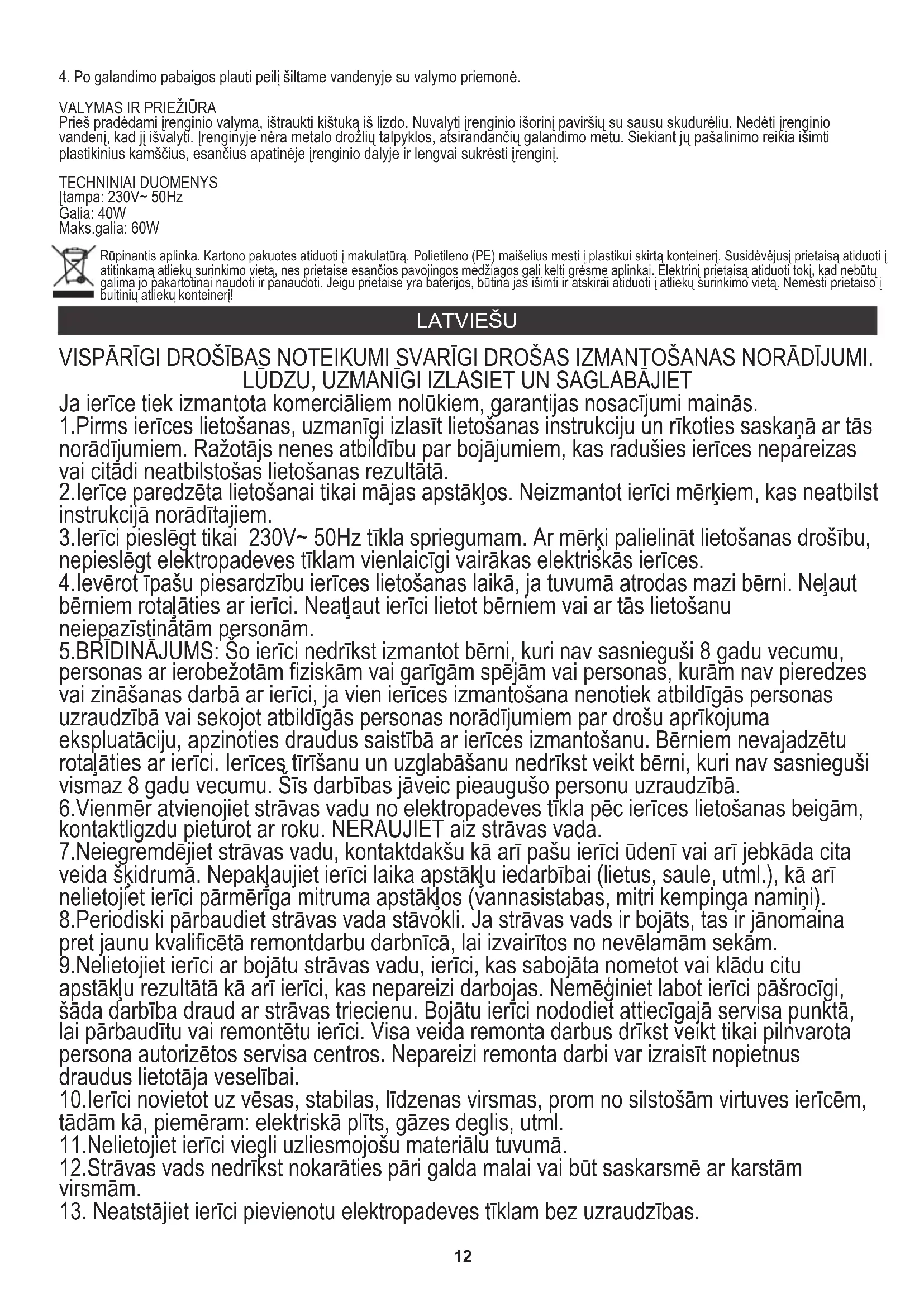 TECHNINIAI DUOMENYS Įtampa: 230V~ 50Hz Galia: 40W Maks.galia: 60W VISPĀRĪGI DROŠĪBAS NOTEIKUMI SVARĪGI DROŠAS IZMANTOŠANAS NORĀDĪJUMI. LŪDZU, UZMANĪGI IZLASIET UN SAGLABĀJIET Ja ierīce tiek izmantota komerciāliem nolūkiem, garantijas nosacījumi mainās. 1.Pirms ierīces lietošanas, uzmanīgi izlasīt lietošanas instrukciju un rīkoties saskaņā ar tās norādījumiem. Ražotājs nenes atbildību par bojājumiem, kas radušies ierīces nepareizas vai citādi neatbilstošas lietošanas rezultātā. 2.Ierīce paredzēta lietošanai tikai mājas apstākļos. Neizmantot ierīci mērķiem, kas neatbilst instrukcijā norādītajiem. 3.Ierīci pieslēgt tikai 230V~ 50Hz tīkla spriegumam. Ar mērķi palielināt lietošanas drošību, nepieslēgt elektropadeves tīklam vienlaicīgi vairākas elektriskās ierīces. 4.Ievērot īpašu piesardzību ierīces lietošanas laikā, ja tuvumā atrodas mazi bērni. Neļaut bērniem rotaļāties ar ierīci. Neatļaut ierīci lietot bērniem vai ar tās lietošanu neiepazīstinātām personām. 5.BRĪDINĀJUMS: Šo ierīci nedrīkst izmantot bērni, kuri nav sasnieguši 8 gadu vecumu, personas ar ierobežotām fiziskām vai garīgām spējām vai personas, kurām nav pieredzes vai zināšanas darbā ar ierīci, ja vien ierīces izmantošana nenotiek atbildīgās personas uzraudzībā vai sekojot atbildīgās personas norādījumiem par drošu aprīkojuma ekspluatāciju, apzinoties draudus saistībā ar ierīces izmantošanu. Bērniem nevajadzētu rotaļāties ar ierīci. Ierīces tīrīšanu un uzglabāšanu nedrīkst veikt bērni, kuri nav sasnieguši vismaz 8 gadu vecumu. Šīs darbības jāveic pieaugušo personu uzraudzībā. 7.Neiegremdējiet strāvas vadu, kontaktdakšu kā arī pašu ierīci ūdenī vai arī jebkāda cita veida šķidrumā. Nepakļaujiet ierīci laika apstākļu iedarbībai (lietus, saule, utml.), kā arī nelietojiet ierīci pārmērīga mitruma apstākļos (vannasistabas, mitri kempinga namiņi). 8.Periodiski pārbaudiet strāvas vada stāvokli. Ja strāvas vads ir bojāts, tas ir jānomaina pret jaunu kvalificētā remontdarbu darbnīcā, lai izvairītos no nevēlamām sekām. 9.Nelietojiet ierīci ar bojātu strāvas vadu, ierīci, kas sabojāta nometot vai klādu citu apstākļu rezultātā kā arī ierīci, kas nepareizi darbojas. Nemēģiniet labot ierīci pāšrocīgi, šāda darbība draud ar strāvas triecienu. Bojātu ierīci nododiet attiecīgajā servisa punktā, lai pārbaudītu vai remontētu ierīci. Visa veida remonta darbus drīkst veikt tikai pilnvarota persona autorizētos servisa centros. Nepareizi remonta darbi var izraisīt nopietnus draudus lietotāja veselībai. 10.Ierīci novietot uz vēsas, stabilas, līdzenas virsmas, prom no silstošām virtuves ierīcēm, tādām kā, piemēram: elektriskā plīts, gāzes deglis, utml. 11.Nelietojiet ierīci viegli uzliesmojošu materiālu tuvumā. 12.Strāvas vads nedrīkst nokarāties pāri galda malai vai būt saskarsmē ar karstām virsmām.