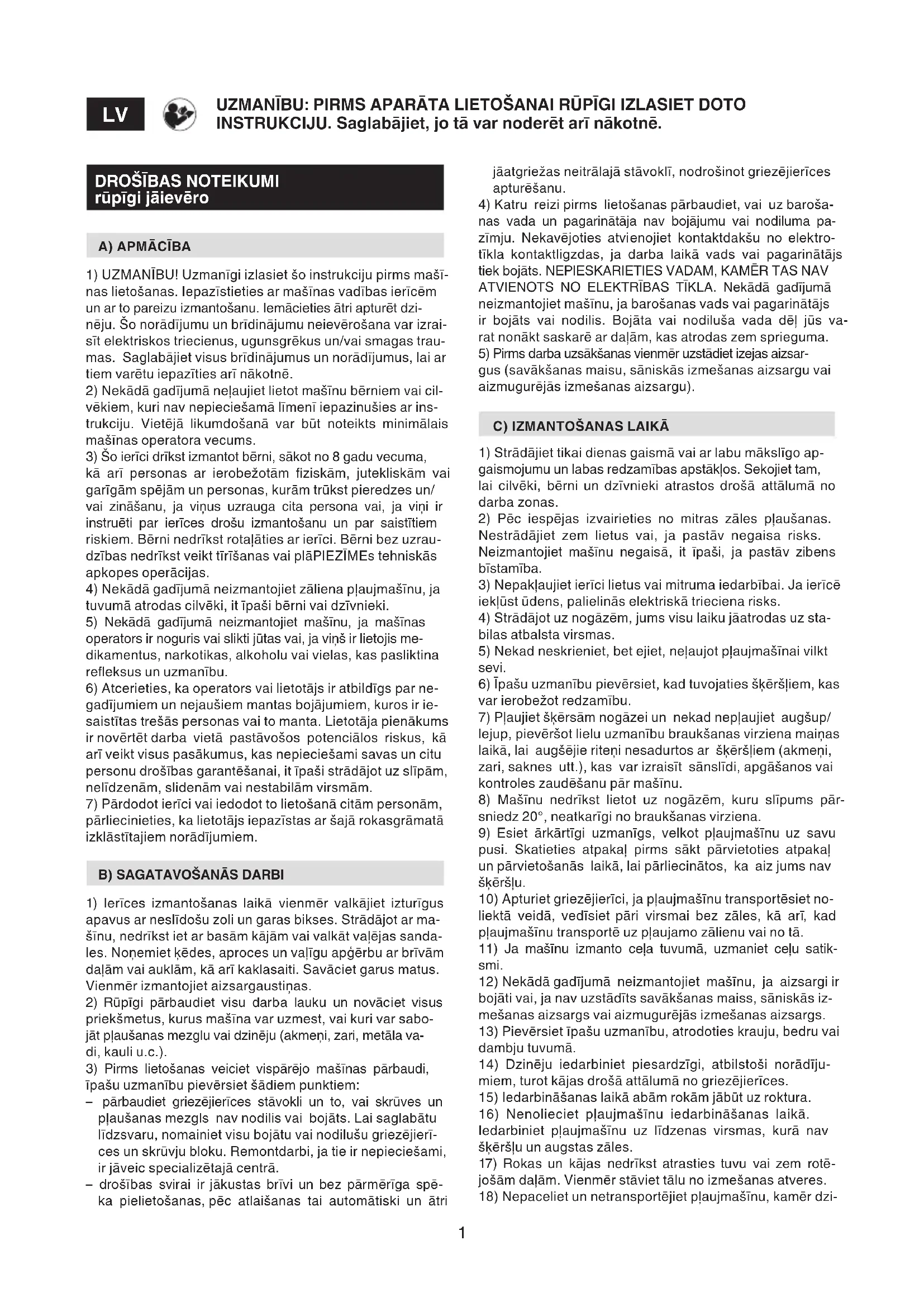 Termiskās aizsardzības ieslēgšanās dzinēja pārkaršanas dēļ. Apturiet mašīnu un atvienojiet barošanas vadu. Vienmēr pārbaudiet vai gaisa ieņēmējos nav zāles atlieku. Ja jums radušās jebkādas neskaidrības vai problēmas, sazinieties ar tuvāko servisa centru vai vietu, kur iegādājā- ties izstrādājumu.1 БЕЗБЕДНОСНИ МЕРКИ до коишто треба строго да се придржувате A) ОБУКА