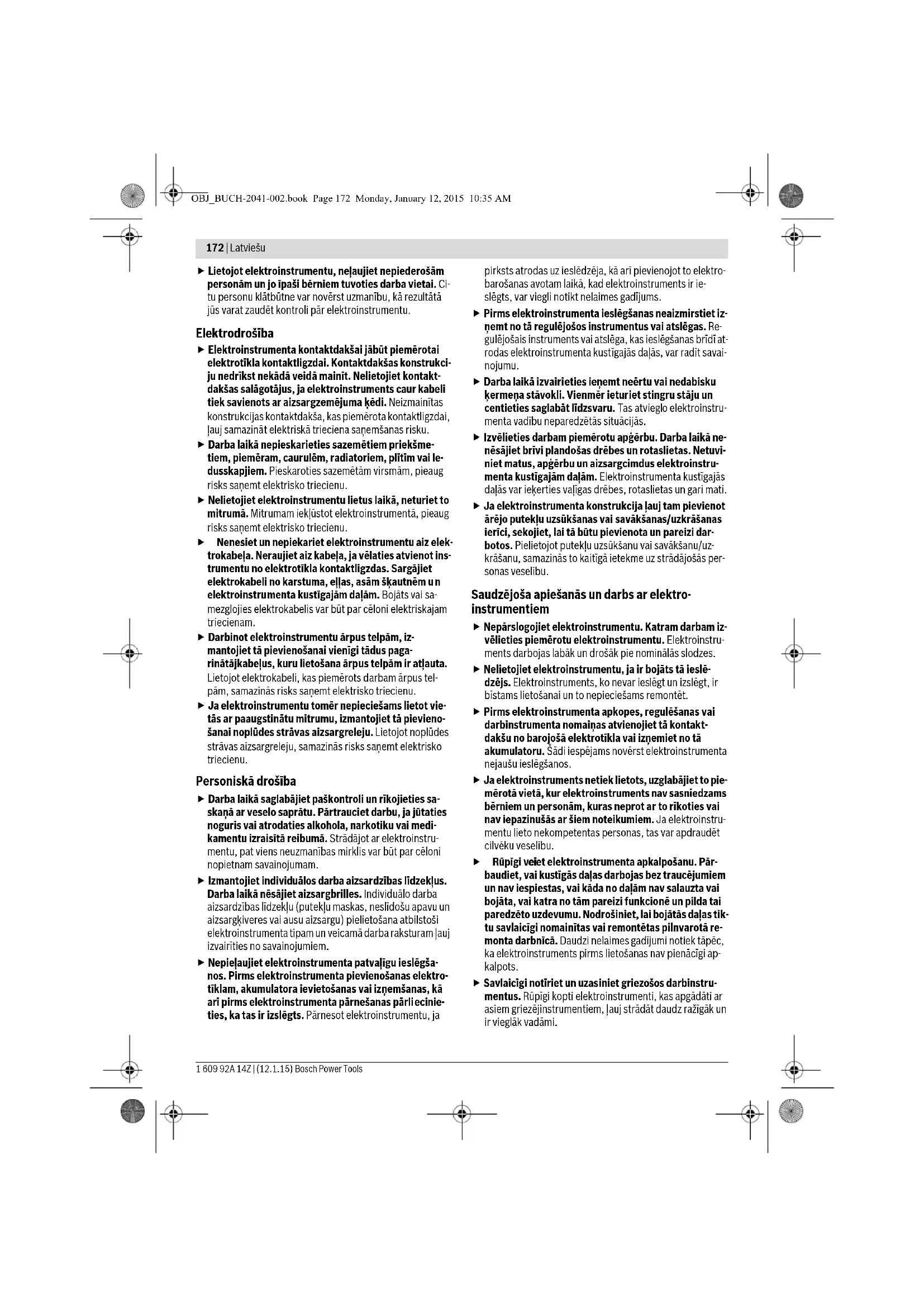 elektroinstru menta kustīgajām daļām. Bojāts vai sa- mezglojies elektrokabelis var būt par cēloni elektriskajam triecienam. Darbinot elektroinstrumentu ārpus telpām, iz- mantojiet tā pievienošanai vienīgi tādus paga- rinātājkabeļus, kuru lietošana ārpus telpām ir atļauta. Lietojot elektrokabeli, kas piemērots darbam ārpus tel- pām, samazinās risks saņemt elektrisko triecienu. Ja elektroinstrumentu tomēr nepieciešams lietot vie- tās ar paaugstinātu mitrumu, izmantojiet tā pievieno- šanai noplūdes strāvas aizsargreleju. Lietojot noplūdes strāvas aizsargreleju, samazinās risks saņemt elektrisko triecienu. Personiskā drošība Darba laikā saglabājiet paškontroli un rīkojieties sa- skaņā ar veselo saprātu. Pārtrauciet darbu, ja jūtaties noguris vai atrodaties alkohola, narkotiku vai medi- kamentu izraisītā reibumā. Strādājot ar elektroinstru- mentu, pat viens neuzmanības mirklis var būt par cēloni nopietnam savainojumam. Izmantojiet individuālos darba aizsardzības līdzekļus. Darba laikā nēsājiet aizsargbrilles. Individuālo darba aizsardzības līdzekļu (putekļu maskas, neslīdošu apavu un aizsargķiveres vai ausu aizsargu) pielietošana atbilstoši elektroinstrumenta tipam un veicamā darba raksturam ļauj izvairīties no savainojumiem. Nepieļaujiet elektroinstrumenta patvaļīgu ieslēgša- nos. Pirms elektroinstrumenta pievienošanas elektro- tīklam, akumulatora ievietošanas vai izņemšanas, kā arī pirms elektroinstrumenta pārnešanas pārli ecinie- ties, ka ta s ir izslēgts. Pārnesot elektroinstrumentu, ja pirksts atrodas uz ieslēdzēja, kā arī pievienojot to elektro- barošanas avotam laikā, kad elektroinstruments ir ie- slēgts, var viegli notikt nelaimes gadījums. Pirms elektroinstrumenta ieslēgšanas neaizmirstiet iz- ņemt no tā regulējošos instrumentus vai atslēgas. Re- gulējošais instruments vai atslēga, kas ieslēgšanas brīdī at- rodas elektroinstrumenta kustīgajās daļās, var radīt savai- nojumu. Darba laikā izvairieties ieņemt neērtu vai nedabisku ķermeņa stāvokli. Vienmēr ieturiet stingru stāju un centieties saglabāt līdzsvaru. Tas atvieglo elektroinstru- menta vadību neparedzētās situācijās. Izvēlieties darbam piemērotu apģērbu. Darba laikā ne- nēsājiet brīvi plando šas drēb es un rotaslietas. Netuvi- niet matus, apģērbu un aizsargcimdus elektroinstru- menta kustīgajām daļām. Elektroinstrumenta kustīgajās daļās var ieķerties vaļīgas drēbes, rotaslietas un gari mati. Ja elektroinstrumenta konstrukcija ļauj tam pievienot ārējo putekļu uzsūkšanas vai savākšanas/uzkrāšanas ierīci, sekojiet, lai tā būtu pievienota un pareizi dar- botos. Pielietojot putekļu uzsūkšanu vai savākšanu/uz- krāšanu, samazinās to kaitīgā ietekme uz strādājošās per- sonas veselību. Saudzējoša apiešanās un darbs ar elektro- instrumentiem Nepārslogojiet elektroinstrumentu. Katram darbam iz- vēlieties piemērotu elektroinstrumentu. Elektroinstru- ments darbojas labāk un drošāk pie nominālās slodzes. Nelietojiet elektroinstrumentu, ja ir bojāts tā ieslē- dzējs. Elektroinstruments, ko nevar ieslēgt un izslēgt, ir bīstams lietošanai un to nepieciešams remontēt. Pirms elektroinstrumenta apkopes, regulēšanas vai darbinstrumenta nomaiņas atvienojiet tā kontakt- dakšu no barojošā elektrotīkla vai izņemiet no tā akumulatoru. Šādi iespējams novērst elektroinstrumenta nejaušu ieslēgšanos. Ja elektroinstruments netiek lietots, uzglabājiet to pie- mērotā vietā, kur elektroinstruments nav sasniedzams bērniem un personām, kuras neprot ar to rīkoties vai nav iepazinušās ar šiem noteikumiem. Ja elektroinstru- mentu lieto nekompetentas personas, tas var apdraudēt cilvēku veselību. Rūpīgi vei ciet elektroinstrumenta apkalpošanu. Pār- baudiet, vai kus tīgās daļas darbojas bez traucējumiem un nav iespiestas, vai kāda no daļām nav salauzta vai bojāta, vai katra no tām pareizi funkcionē un pilda tai paredzēto uzdevumu. Nodrošiniet, lai bojātās daļas tik- tu savlaicīgi nomainītas vai remontētas pilnvarotā re- monta darbnīcā. Daudzi nelaimes gadījumi notiek tāpēc, ka elektroinstruments pirms lietošanas nav pienācīgi ap- kalpots. Savlaicīgi notīriet un uzasiniet griezošos darbinstru- mentus. Rūpīgi kopti elektroinstrumenti, kas apgādāti ar asiem griezējinstrumentiem, ļauj strādāt daudz ražīgāk un ir vieglāk vadāmi. OBJ_BUCH-2041-002.book Page 172 Monday, January 12, 2015 10:35 AMLatviešu | 173 Bosch Power Tools 1 609 92A 14Z | (12.1.15) Lietojiet vienīgi tādus elektroinstrumentus, papild- piederumus, darbinstrumentus utt., kas atbilst šeit sniegtajiem norādījumiem, ņemot vērā arī konkrētos darba apstākļus un pielietojuma īpatnības. Elektro- instrumentu lietošana citiem mērķiem, nekā tiem, kuriem to ir paredzējusi ražotājfirma, ir bīstama un var novest pie neparedzamām sekām. Saudzējoša apiešanās un darbs ar akumulatora elektroinstrumentiem Akumulatora uzlādei lietojiet tikai tādu uzlādes ierīci, ko ir ieteikusi elektroinstrumenta ražotājfirma. Katra uzlādes ierīce ir paredzēta tikai noteikta tipa akumulato- ram, un mēģinājums to lietot cita tipa akumulatoru uzlādei var novest pie uzlādes ierīces un/vai akumulatora aiz- degšanās. Pievienojiet elektroinstrumentam tikai tādu akumula- toru, ko ir ieteikusi ražotājfirma. Cita tipa akumulatoru lietošana var būt par cēloni savainojumam vai novest pie elektroinstrumenta un/vai akumulatora aizdegšanās. Laikā, kad akumulators netiek lietots, nepieļaujiet, lai tā kontakti saskartos ar saspraudēm, monētām, atslē- gām, naglām, skrūvēm vai citiem nelieliem metāla priekšmetiem, kas varētu izraisīt īsslēgumu. Īsslēgums starp akumulatora kontaktiem var radīt apdegumus un būt par cēl oni ugunsgrēkam