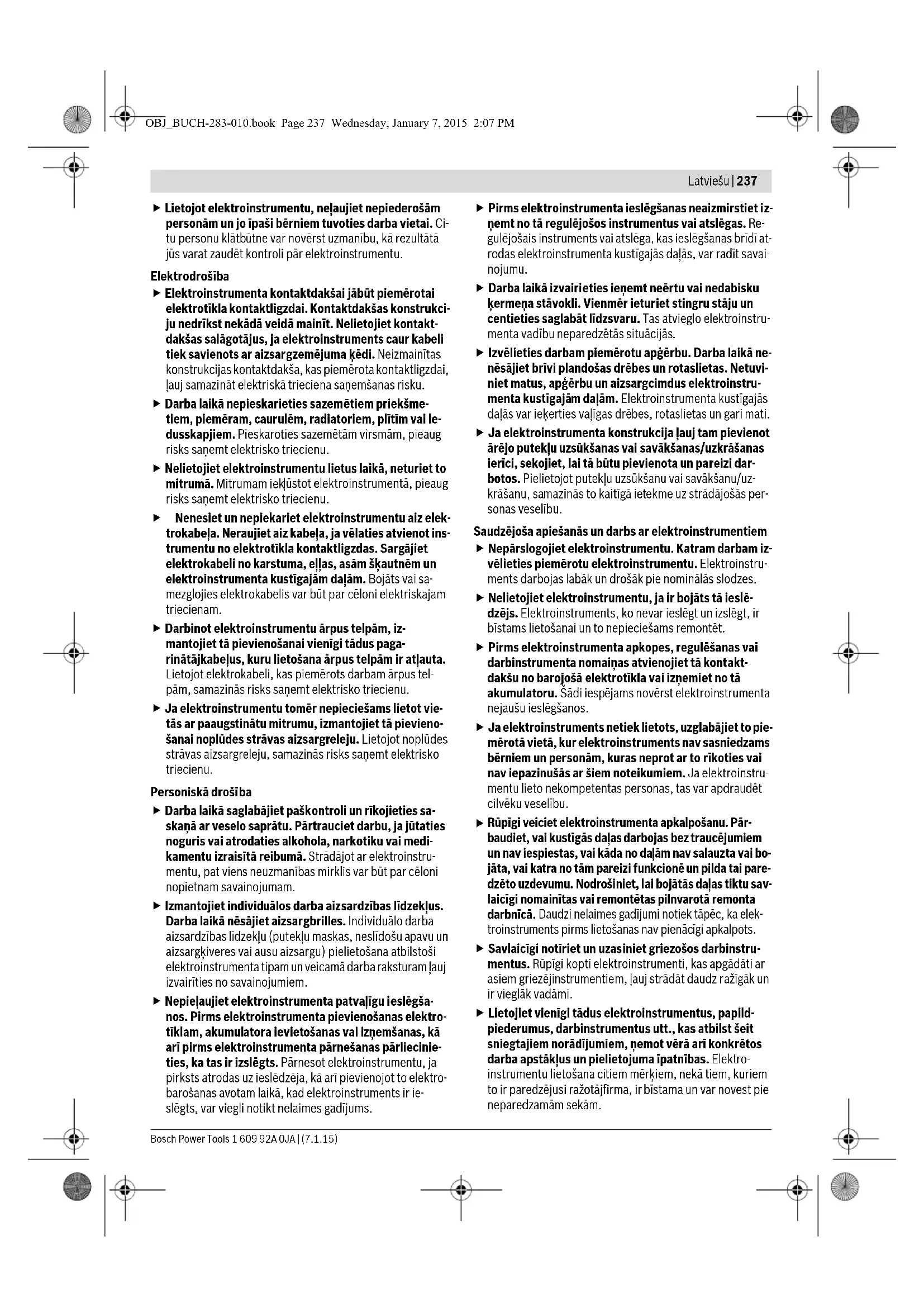 Rūpīgi veiciet elektroinstrumenta apkalpošanu. Pār- baudiet, vai kustīgās daļas darbojas bez traucējumiem un nav iespiestas, vai kāda no daļām nav salauzta vai bo- jāta, vai katra no tām pareizi funkcionē un pilda tai pare- dzēto uzdevumu. Nodrošiniet, lai bojātās daļas tiktu sav- laicīgi nomainītas vai remontētas pilnvarotā remonta darbnīcā. Daudzi nelaimes gadījumi notiek tāpēc, ka elek- troinstruments pirms lietošanas nav pienācīgi apkalpots. Savlaicīgi notīriet un uzasiniet griezošos darbinstru- mentus. Rūpīgi kopti elektroinstrumenti, kas apgādāti ar asiem griezējinstrumentiem, ļauj strādāt daudz ražīgāk un ir vieglāk vadāmi. Lietojiet vienīgi tādus elektroinstrumentus, papild- piederumus, darbinstrumentus utt., kas atbilst šeit sniegtajiem norādījumiem, ņemot vērā arī konkrētos darba apstākļus un pielietojuma īpatnības. Elektro- instrumentu lietošana citiem mērķiem, nekā tiem, kuriem to ir paredzējusi ražotājfirma, ir bīstama un var novest pie neparedzamām sekām. OBJ_BUCH-283-010.book Page 237 Wednesday, January 7, 2015 2:07 PM238 | Latviešu 1 609 92A 0JA | (7.1.15) Bosch Power Tools Saudzējoša apiešanās un darbs ar akumulatora elektro- instrumentiem Akumulatora uzlādei lietojiet tikai tādu uzlādes ierīci, ko ir ieteikusi elektroinstrumenta ražotājfirma. Katra uzlādes ierīce ir paredzēta tikai noteikta tipa akumulato- ram, un mēģinājums to lietot cita tipa akumulatoru uzlādei var novest pie uzlādes ierīces un/vai akumulatora aiz- degšanās. Pievienojiet elektroinstrumentam tikai tādu akumula- toru, ko ir ieteikusi ražotājfirma. Cita tipa akumulatoru lietošana var būt par cēloni savainojumam vai novest pie elektroinstrumenta un/vai akumulatora aizdegšanās. Laikā, kad akumulators netiek lietots, nepieļaujiet, lai tā kontakti saskartos ar saspraudēm, monētām, atslē- gām, naglām, skrūvēm vai citiem nelieliem metāla priekšmetiem, kas varētu izraisīt īsslēgumu. Īsslēgums starp akumulatora kontaktiem var radīt apdegumus un būt par cēloni ugunsgrēkam. Nepareizi lietojot akumulatoru, no t ā var izplūst šķid- rais elektrolīts. Nepieļaujiet elektrolīta nonākšanu sa- skarē ar ādu. Ja tas tomēr ir nejauši noticis, noskalojiet elektrolītu ar ūdeni. Ja elektrolīts nonāk acīs, nekavē- joties griezieties pie ārsta. No akumulatora izplūdušais elektrolīts var izsaukt ādas iekaisumu vai pat apdegumu. Apkalpošana Nodrošiniet, lai elektroinstrumenta remontu veiktu kvalificēts personāls, nomaiņai izmantojot oriģinālās rezerves daļas un piederumus. Tikai tā iespējams panākt un saglabāt vajadzīgo darba drošības līmeni. Drošības noteikumi perforatoriem Lietojiet līdzekļus dzirdes orgānu aizsardzībai. Trokšņa iedarbība var radīt paliekošus dzirdes traucējumus. Izmantojiet papildrokturi, ja tas tiek piegādāts kopā ar elektroinstrumentu. Kontroles zaudēšana pār instrumen- tu var būt par cēloni savainojumiem. Veicot darbu, kura laikā darbinstruments var skart slēptus elektriskos vadus, turiet instrumentu tikai aiz izolētajām virsmām. Darbinstrumentam skarot sprie- gumnesošus vadus, spriegums nonāk arī uz instrumenta metāla daļām un var būt par cēloni elektriskajam triecie- nam. Lietojiet piemērotu metālmeklētāju slēpto pievadlīniju atklāšanai vai arī griezieties pēc palīdzības vietējā ko- munālās saimniecības iestā dē. Kontakta rezultātā ar elektrotīkla līniju, var izcelties ugunsgrēks un strādājošā persona var saņemt elektrisko triecienu. Gāzes vada bojā- jums var izraisīt sprādzienu. Kontakta rezultātā ar ūdens- vada cauruli, var tikt bojātas materiālās vērtības. Darba laikā stingri turiet elektroinstrumentu ar abām rokām un centieties ieturēt drošu stāju. Elektroinstru- mentu ir drošāk vadīt ar abām rokām. Nostipriniet apstrādājamo priekšmetu. Iestiprinot ap- strādājamo priekšmetu skrūvspīlēs vai citā stiprinājuma ie- rīcē, strādāt ir drošāk, nekā tad, ja tas tiek turēts ar rokām. Pirms elektroinstrumenta novietošanas nogaidiet, līdz tas pilnīgi apstājas. Kustībā esošs darbinstruments var ie- strēgt, izsaucot kontroles zaudēšanu pār elektroinstru- mentu. Neatveriet akumulatoru. Tas var radīt īsslēgumu. Sargājiet akumulatoru no karstuma, piemēram, no ilgstošas atrašanās saules staros vai uguns tuvu- mā, k ā arī no ūdens un mitruma. Tas var izraisīt sprādzienu. Bojājuma vai nepareizas lietošanas rezultātā akumula- tors var izdalīt kaitīgus izgarojumus. Šādā gadījumā iz- vēdiniet telpu un, ja jūtaties slikti, griezieties pie ārsta. Izgarojumi var izraisīt elpošanas ceļu kairinājumu. Lietojiet akumulatoru tikai kopā ar Bosch elektroins- trumentu. Tikai tā akumulators ir pasargāts no bīstamām pārslodzēm. Asi priekšmeti, piemēram, nagla vai skrūvgriezis, kā arī ārēja spēka iedarbība var sabojāt akumulatoru. Tas var radīt iekšēju īsslēgumu, kā rezultātā akumulators var aizdegties, dūmot, eksplodēt vai pārkarst. Izstrādājuma un tā darbības apraksts Uzmanīgi izlasiet visus drošības noteiku- mus. Šeit sniegto drošības noteikumu un norā- dījumu neievērošana var izraisīt aizdegšanos un būt par cēloni elektriskajam triecienam vai nopietnam savainojumam. Lūdzam atvērt atlokāmo lappusi ar elektroinstrumenta attēlu un turēt to atvērtu visu laiku, kamēr tiek lasīta lietošanas pa- mācība. Pielietojums Elektroinstruments ir paredzēts betona, ķieģeļu un akmens triecienurbšanai, kā arī viegliem atskaldīšanas darbiem ar kal- tu. Tas ir piemērots arī koka, metāla, keramikas un plastma- sas beztriecienu urbšanai. Elektroinstrumenti ar elektronisko gaitas regulēšanu un griešanas virziena pārslēgšanu ir lietoja- mi arī skrūvēšanai. Šajā elektroinstrumentā iebūvētā apgaismošanas spuldze ir paredzēta darba vietas izgaismošanai, bet ne apgaism
