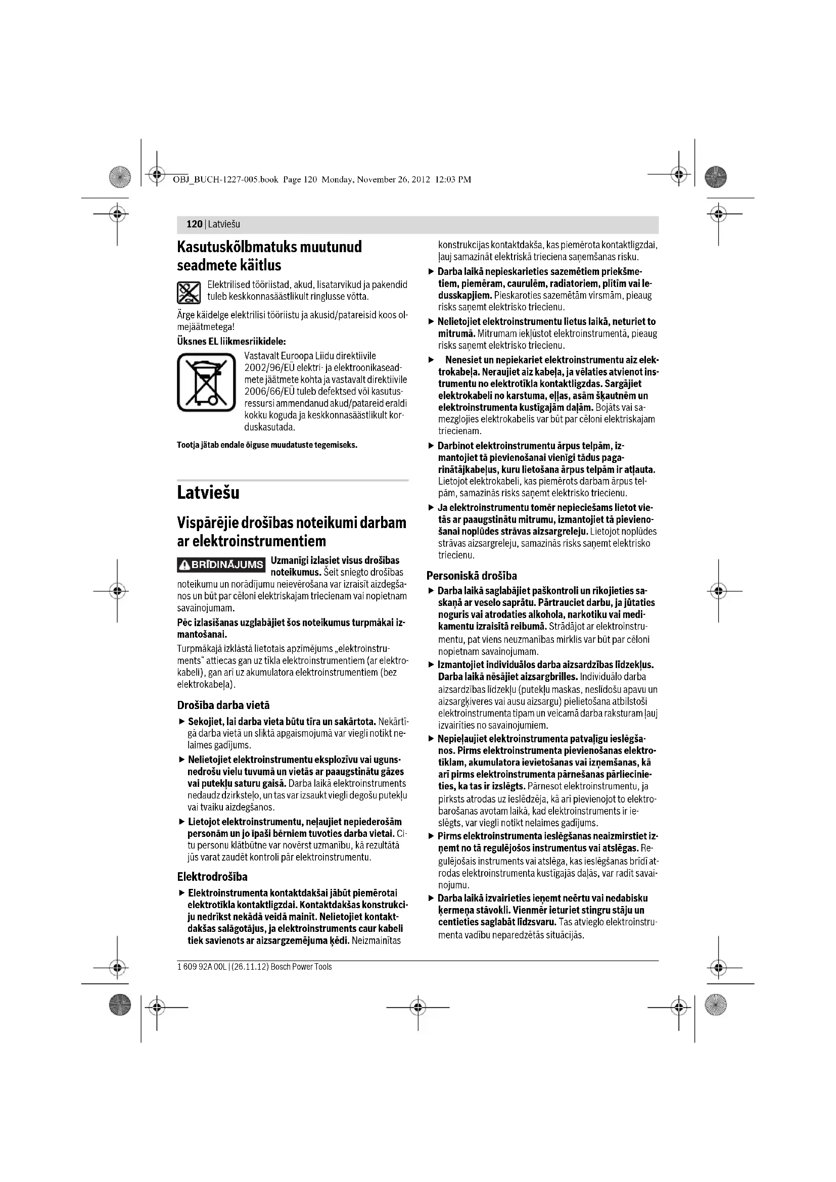Lisatarviku valik – 147 OBJ_BUCH-1227-005.book Page 119 Monday, November 26, 2012 12:03 PM120 | Latviešu 1 609 92A 00L | (26.11.12) Bosch Power Tools Kasutuskõlbmatuks muutunud seadmete käitlus Elektrilised tööriistad, akud, lisatarvikud ja pakendid tuleb keskkonnasäästlikult ringlusse võtta. Ärge käidelge elektrilisi tööriistu ja akusid/patareisid koos ol- mejäätmetega! Üksnes EL liikmesriikidele: Vastavalt Euroopa Liidu direktiivile 2002/96/EÜ elektri- ja elektroonikasead- mete jäätmete kohta ja vastavalt direktiivile 2006/66/EÜ tuleb defektsed või kasutus- ressursi ammendanud akud/patareid eraldi kokku koguda ja keskkonnasäästlikult kor- duskasutada. Tootja jätab endale õiguse muudatuste tegemiseks. Latviešu Vispārējie drošības noteikumi darbam ar elektroinstrumentiem Uzmanīgi izlasiet visus drošības noteikumus. Šeit sniegto drošības noteikumu un norādījumu neievērošana var izraisīt aizdegša- nos un būt par cēloni elektriskajam triecienam vai nopietnam savainojumam. Pēc izlasīšanas uzglabājiet šos noteikumus turpmākai iz- mantošanai. Turpmākajā izklāstā lietotais apzīmējums „elektroinstru- ments“ attiecas gan uz tīkla elektroinstrumentiem (ar elektro- kabeli), gan arī uz akumulatora elektroinstrumentiem (bez elektrokabeļa). Drošība darba vietā Sekojiet, lai darba vieta būtu tīra un sakārtota. Nekārtī- gā darba vietā un sliktā apgaismojumā var viegli notikt ne- laimes gadījums. Nelietojiet elektroinstrumentu eksplozīvu vai uguns- nedrošu vielu tuvumā un vietās ar paaugstinātu gāzes vai putekļu saturu gaisā. Darba laikā elektroinstruments nedaudz dzirksteļo, un tas var izsaukt viegli degošu putekļu vai tvaiku aizdegšanos. Lietojot elektroinstrumentu, neļaujiet nepiederošām personām un jo īpaši bērniem tuvoties darba vietai. Ci- tu personu klātbūtne var novērst uzmanību, kā rezultātā jūs varat zaudēt kontroli pār elektroinstrumentu. Elektrodrošība Elektroinstrumenta kontaktdakšai jābūt piemērotai elektrotīkla kontaktligzdai. Kontaktdakšas konstrukci- ju nedrīkst nekādā veidā mainīt. Nelietojiet kontakt- dakšas salāgotājus, ja elektroinstruments caur kabeli tiek savienots ar aizsargzemējuma ķēdi. Neizmainītas konstrukcijas kontaktdakša, kas piemērota kontaktligzdai, ļauj samazināt elektriskā trieciena saņemšanas risku. Darba laikā nepieskarieties sazemētiem priekšme- tiem, piemēram, caurulēm, radiatoriem, plītīm vai le- dusskapjiem. Pieskaroties sazemētām virsmām, pieaug risks saņemt elektrisko triecienu. Nelietojiet elektroinstrumentu lietus laikā, neturiet to mitrumā. Mitrumam iekļūstot elektroinstrumentā, pieaug risks saņemt elektrisko triecienu. Nenesiet un nepiekariet elektroinstrumentu aiz elek- trokabeļa. Neraujiet aiz kabeļa, ja vēlaties atvienot ins- trumentu no elektrotīkla kontaktligzdas. Sargājiet elektrokabeli no karstuma, eļļas, asām šķautnēm un elektroinstrumenta kustīgajām daļām. Bojāts vai sa- mezglojies elektrokabelis var būt par cēloni elektriskajam triecienam. Darbinot elektroinstrumentu ārpus telpām, iz- mantojiet tā pievienošanai vienīgi tādus paga- rinātājkabeļus, kuru lietošana ārpus telpām ir atļauta. Lietojot elektrokabeli, kas piemērots darbam ārpus tel- pām, samazinās risks saņemt elektrisko triecienu. Ja elektroinstrumentu tomēr nepieciešams lietot vie- tās ar paaugstinātu mitrumu, izmantojiet tā pievieno- šanai noplūdes strāvas aizsargreleju. Lietojot noplūdes strāvas aizsargreleju, samazinās risks saņemt elektrisko triecienu. Personiskā drošība Darba laikā saglabājiet paškontroli un rīkojieties sa- skaņā ar veselo saprātu. Pārtrauciet darbu, ja jūtaties noguris vai atrodaties alkohola, narkotiku vai medi- kamentu izraisītā reibumā. Strādājot ar elektroinstru- mentu, pat viens neuzmanības mirklis var būt par cēloni nopietnam savainojumam. Izmantojiet individuālos darba aizsardzības līdzekļus. Darba laikā nēsājiet aizsargbrilles. Individuālo darba aizsardzības līdzekļu (putekļu maskas, neslīdošu apavu un aizsargķiveres vai ausu aizsargu) pielietošana atbilstoši elektroinstrumenta tipam un veicamā darba raksturam ļauj izvairīties no savainojumiem. Nepieļaujiet elektroinstrumenta patvaļīgu ieslēgša- nos. Pirms elektroinstrumenta pievienošanas elektro- tīklam, akumulatora ievietošanas vai izņemšanas, kā arī pirms elektroinstrumenta pārnešanas p ārliecinie- ties, ka tas ir izslēgts. Pārnesot elektroinstrumentu, ja pirksts atrodas uz ieslēdzēja, kā arī pievienojot to elektro- barošanas avotam laikā, kad elektroinstruments ir ie- slēgts, var viegli notikt nelaimes gadījums. Pirms elektroinstrumenta ieslēgšanas neaizmirstiet iz- ņemt no tā regulējošos instrumentus vai atslēgas. Re- gulējošais instruments vai atslēga, kas ieslēgšanas brīdī at- rodas elektroinstrumenta kustīgajās daļās, var radīt savai- nojumu. Darba laikā izvairieties ieņemt neērtu vai nedabisku ķermeņa stāvokli. Vienmēr ieturiet stingru stāju un centieties saglabāt līdzsvaru. Tas atvieglo elektroinstru- menta vadību neparedzētās situācijās. BRIDINAJUMS OBJ_BUCH-1227-005.book Page 120 Monday, November 26, 2012 12:03 PMLatviešu | 121 Bosch Power Tools 1 609 92A 00L | (26.11.12) Izvēlieties darbam piemērotu apģērbu. Darba laikā ne- nēsājiet brīvi plandošas drēbes un rotaslietas. Netuvi- niet matus, apģērbu un aizsargcimdus elektroinstru- menta kustīgajām daļām. Elektroinstrumenta kustīgajās daļās var ieķerties vaļīgas drēbes, rotaslietas un gari mati. Ja elektroinstrumenta konstrukcija ļauj tam pievienot ārējo putekļu uzsūkšanas vai savākšanas/uzkrāšanas ierīci, sekojiet, lai tā būtu pievienota un pareizi dar- botos. Pielietojot putekļu uzsūkšanu vai savākšanu/uz- krāšanu, samazinās to kaitīgā ietekme uz strādājošās per- sonas veselību. Saudzējoša apiešan