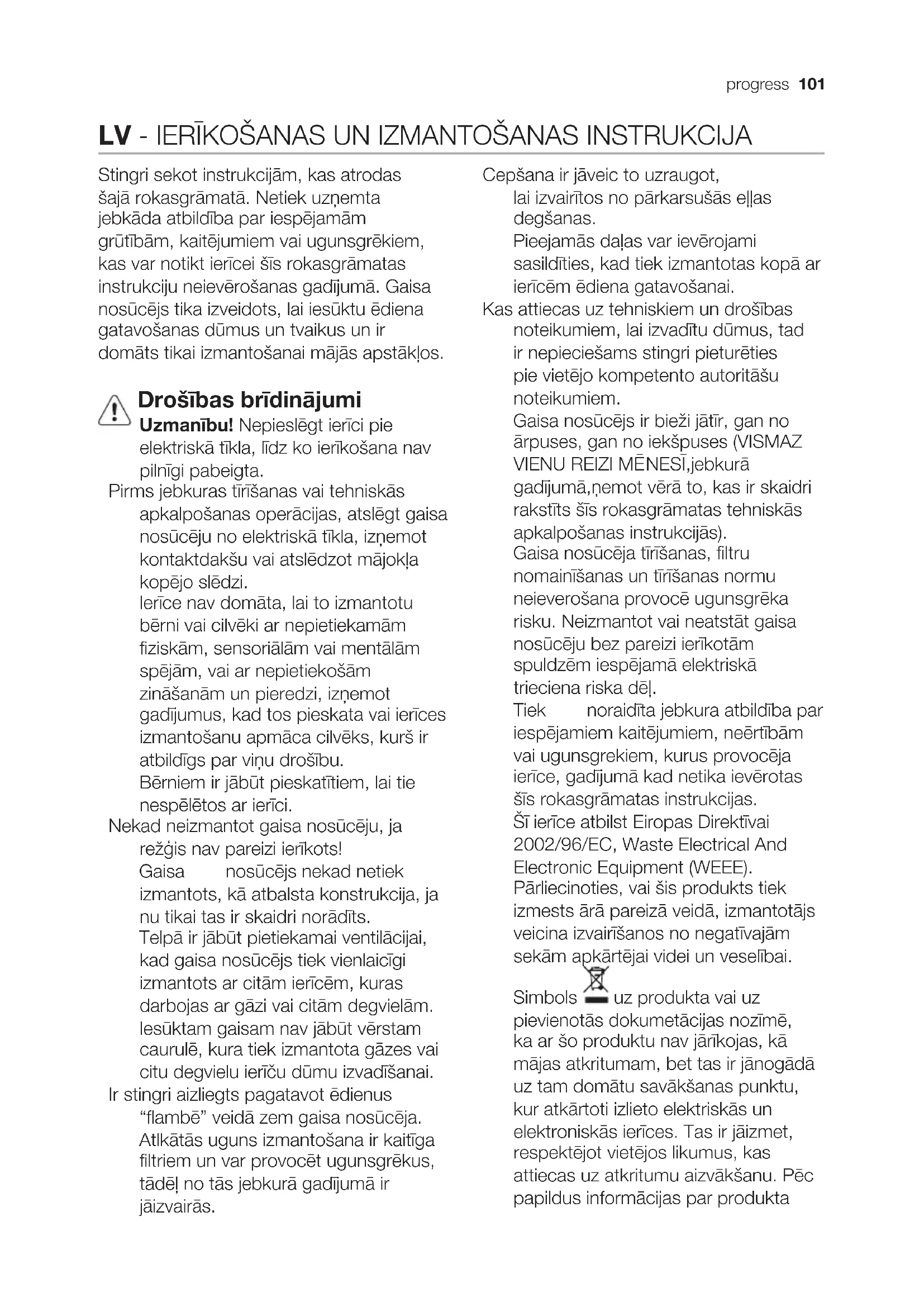 Көмірлі фильтрдің қанығуы ұзақ пайдалану мерзімінің қысқа немесе ұзақ өтуіне байланысты болады, ол ас үйдің түрі мен майды ұстайтын фильтрді ұстанылған мерзімділік тазалаумен алдын ала анықталады. Қандай жағдай болса да, картриджді кем дегенде 4 айда бір рет ауыстырыңыз. Көмірлі фильтрді жууға болмайды жəне де регенерецияға жарамсыз. Лампаны ауыстыру 18 сурет Аспапты электр жүйесінен өшіріңіз Ескерту! Лампаны ұстаудан бұрын, олар суығандығына көз жеткізіңіз. 12В -20Вт максималді - G4 тек галогендік лампаларды ғана қолданыңыз. Лампалардға қолыңызды тигізбеңіз.progress 101 LV - IERĪKOŠANAS UN IZMANTOŠANAS INSTRUKCIJA Stingri sekot instrukcijām, kas atrodas šajā rokasgrāmatā. Netiek uzņemta jebkāda atbildība par iespējamām grūtībām, kaitējumiem vai ugunsgrēkiem, kas var notikt ierīcei šīs rokasgrāmatas instrukciju neievērošanas gadījumā. Gaisa nosūcējs tika izveidots, lai iesūktu ēdiena gatavošanas dūmus un tvaikus un ir domāts tikai izmantošanai mājās apstākļos. Drošības brīdinājumi Uzmanību! Nepieslēgt ierīci pie elektriskā tīkla, līdz ko ierīkošana nav pilnīgi pabeigta. Pirms jebkuras tīrīšanas vai tehniskās apkalpošanas operācijas, atslēgt gaisa nosūcēju no elektriskā tīkla, izņemot kontaktdakšu vai atslēdzot mājokļa kopējo slēdzi. Ierīce nav domāta, lai to izmantotu bērni vai cilvēki ar nepietiekamām fiziskām, sensoriālām vai mentālām spējām, vai ar nepietiekošām zināšanām un pieredzi, izņemot gadījumus, kad tos pieskata vai ierīces izmantošanu apmāca cilvēks, kurš ir atbildīgs par viņu drošību. Bērniem ir jābūt pieskatītiem, lai tie nespēlētos ar ierīci. Nekad neizmantot gaisa nosūcēju, ja režģis nav pareizi ierīkots! Gaisa nosūcējs nekad netiek izmantots, kā atbalsta konstrukcija, ja nu tikai tas ir skaidri norādīts. Telpā ir jābūt pietiekamai ventilācijai, kad gaisa nosūcējs tiek vienlaicīgi izmantots ar citām ierīcēm, kuras darbojas ar gāzi vai citām degvielām. Iesūktam gaisam nav jābūt vērstam caurulē, kura tiek izmantota gāzes vai citu degvielu ierīču dūmu izvadīšanai. Ir stingri aizliegts pagatavot ēdienus “flambē” veidā zem gaisa nosūcēja. Atlkātās uguns izmantošana ir kaitīga filtriem un var provocēt ugunsgrēkus, tādēļ no tās jebkurā gadījumā ir jāizvairās. Cepšana ir jāveic to uzraugot, lai izvairītos no pārkarsušās eļļas degšanas. Pieejamās daļas var ievērojami sasildīties, kad tiek izmantotas kopā ar ierīcēm ēdiena gatavošanai. Kas attiecas uz tehniskiem un drošības noteikumiem, lai izvadītu dūmus, tad ir nepieciešams stingri pieturēties pie vietējo kompetento autoritāšu noteikumiem. Gaisa nosūcējs ir bieži jātīr, gan no ārpuses, gan no iekšpuses (VISMAZ