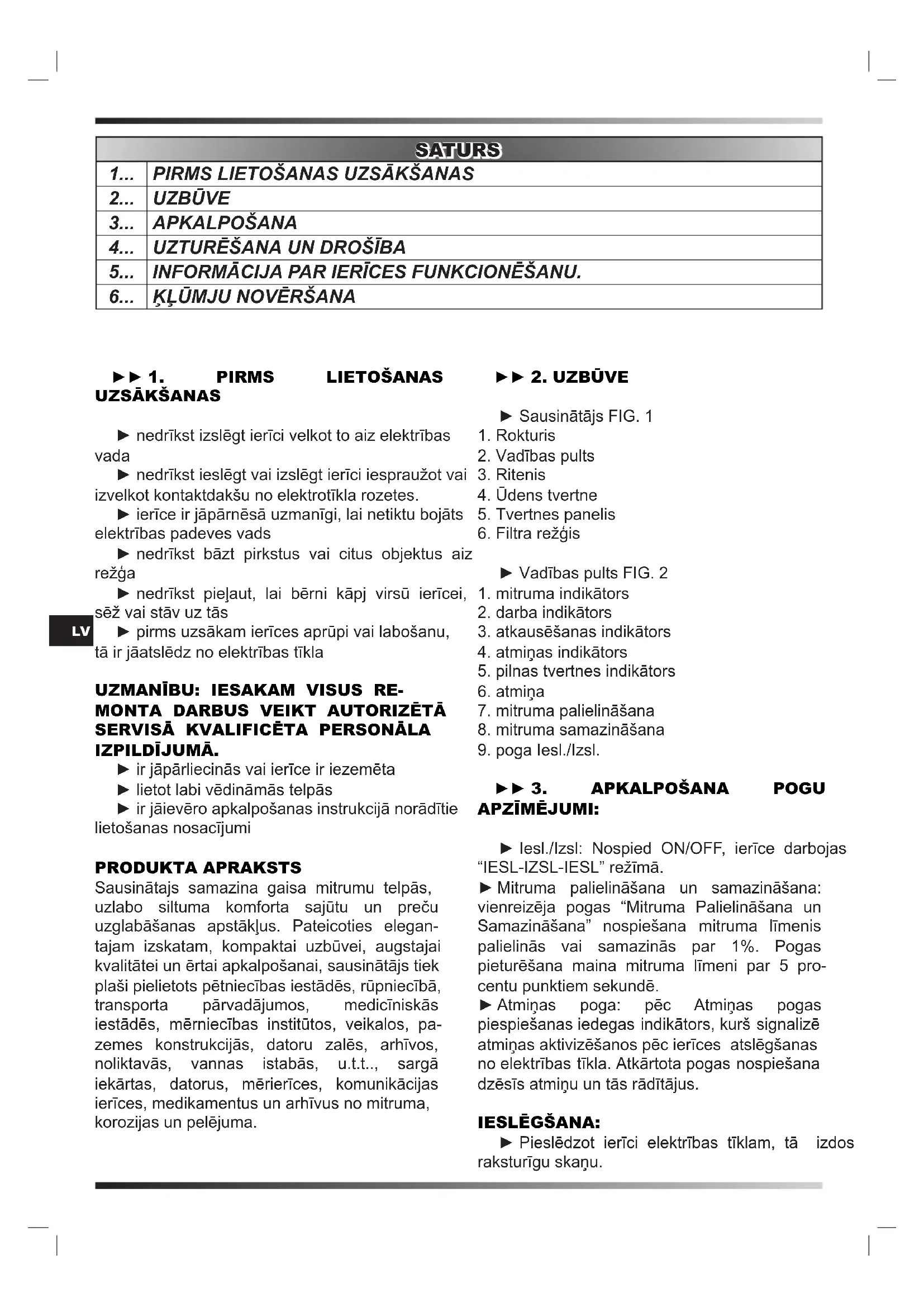 ► Piespied pogu “IESL./IZSL.”, ieslēgsies ierīces darbības indikātors un uzstādītā mitruma līmeņa indikātors. Uzrādītie sākuma parametri ir 60%, bet pēc 3 sekundēm indikātors parāda faktisko mitruma līmeni. ► Piespiest pogu mitruma līmeņa samazināšanai vai palielināšanai atkarībā no vēlmes. Ja uzstādītais mitruma līmenis ir 3% zemāks par faktisko, ierīce uzsāks darboties; ja uzstādītais mitruma līmenis ir 3% augstāks par faktisko, ierīce pārtrauks darbību. ► Ja uzstādītais mitruma līmenis ir zemāks par 30%, ierīce darbosies nepārtrauktā režīmā, bet indikātors izgaismos simbolu “CO”. IZSLēGŠANA: ► Piespied pogu “Iesl/Izsl” ierīces darbības laikā. Ierīce izbeigs darbību un indikatori nodzisīs. PIEZīMES: ► Ja uzstādītais mitruma līmenis ir augstāks nekā faktiskais mitruma līmenis ierīce neuzsāks darbību. ► Ja tilpne ir pārpildīta ieslēgsies tilpnes pārpildīšanas indikātors. Tajā pašā laikā automātiski izslēgsies kompresors un ventilātors, bet ierīce izdos skaņu signālu ik pēc 5 minūtēm līdz tilpnes iztukšošanas brīdim. Pēc tilpnes iztukšošanas ierīce atkal uzsākts darbību. ► Sausināšanas laikā ventilātora dzinējam un kompresoram ir jāstrādā vismaz 3 minūtes pēc ierīces iedarbināšanas. Aizliegts vēlreiz iedarbināt kompresoru 3 minūšu laikā kopš tā izslēgšanas brīža. ► Darba laikā zemā temperatūrā ierīce au- tomātiski pārbauda sistēmas temperatūru at- kausēšanas vajadzībām. Pēc atkausēšanas procesa beigšanas iedegas atkausēšanas in- dikātors, ieslēdzas ventilātors, bet kompresors izslēdzas automātiski. ► Pēc atmiņas pogas nospiešanas, vadāmierīce reģistrēs mitruma līmeni kāds ir pēc ierīces izslēgšanas. Pēc ieslēgšanas ierīce darbo- sies tādā pašā režimā, kādā tā darbojās pirms izslēgšanas. ► Mitruma indikātors izgaismo mitruma līmeni no 30% līdz 90%. ► Gadījumā, ja ierīce netiek lietota ilgāku laiku, kontaktdakša ir jāizņem no elektrotīkla rozetes. ILGSTOŠA NOTECE: ► Izņemt tilpni, atvērt noteces vārstu tilpnes apakšdaļā, pieslēgt cauruļvadam, iemontēt tilpni atpakaļ un izvadīt cauruļvadu caur ierīces apakšdaļu. ► 4. UZTURēŠANA UN DROŠībA ► FIG. 3 Nelietot pagarinātājus vai adapterus. Var izraisīt ugunsgrēku, apstarošanu vai elektrošoku. ► FIG. 4 Ierīci nedrīkst novietot krāsns vai sildītāju tuvumā. Ierīce var sadegt vai izkust. ► FIG. 5 Ierīce ir jāsargā no tiešu saules staru , vēja vai lietus iedarbības. (paredzēta lietošanai slēgtās telpās) ► FIG. 6 Kļūmju gadījumā (piem. smaku izdalīšanās vai sadegšana), ierīce ir jāizslēdz un jāatslēdz no elektropadeves. Var izraisīt ugunsgrēku, elektrošoku vai citus negadījumus. ► FIG. 7 Ierīci nedrīkst darbināt ķīmisko vielu un ķīmisko produktu uzglabāšanas vietās. Var izraisīt bojājumus un vielu noplūdi. ► FIG. 8 Ilgstošas nelietošanas gadījumā ierīce ir jāatslēdz no elektropadeves. ► FIG. 9 Pirms tīrīšanas vai kopšanas darbiem, ierīce ir jāizslēdz un jāatslēdz no elektropadeves. Neizslēgšana var izraisīt elektrošoku. ► FIG. 10 Nepārtrauktas noteces režīmā ir jāpielieto drena. Ja apkārtējās vides temperatūra ir tuva sasalšanas punktam, nepārtrauktas noteces režīms nav ieteicams. ► FIG. 11 Lietotājs nedrīkst paša spēkiem labot vai atslēgt ierīces. Var izraisīt ugunsgrēku vai elektrošoku. ► FIG. 12 Novieto ierīci uz stabilas virsmas. Ja tā apgāzīsies ūdens izlīs radot bojājumus. Šādi bojājumi var radīt elektrošoku.► FIG. 13 Filtra nodrošinājums. Ja ierīce tiek izslēgta uz ilgāku laiku ltrs ir jāuzglabā plastmasas maisiņā. ► FIG. 14 Nedrīkst lietot ierīci ūdens avota tuvumā. Ierīces apliešana ar ūdeni var radīt bojājumus, kuri var izraisīt elektrošoku. ► FIG. 15 Ierīcei piemērotā elektroapgāde 220-240V/~50Hz. Cita elektrības padeves avota pielietošana var izraisīt ugunsgrēku vai elektrošoku. ► FIG. 16 Sargāt vadu no bojājumiem. Nevilkt aiz elektrības vada, nelikt smagus priekšmetus uz tā un nekarsēt. Var izraisīt ugunsgrēku vai elektrošoku. ► FIG. 17 Kontaktdakšu rūpīgi notīrīt un pareizi pieslēgt .Ja kontaktdakša nav pareizi ievietota rozetē, tā var radīt elektrošoku. ► FIG. 18 Neizmantot kontaktdakšu kā slēdzi. Var izraisīt ugunsgrēku vai elektrošoku. ► 5. INFORMĀCIJA PAR IERīCES FUNKCIONēŠANU. ► Lai izvairītos no komresora avārijas, ierīces slīpuma leņķis pārvietošanas laikā nedrīkst pārsniegt 45°. ► Ierīcei ir jādarbojas temperatūrā no 5°līdz 35°C. ► Sausināšanas laikā, strādājoša kompre- sora ģenerētā siltuma iedarbības rezultātā, temperatūra telpā var paaugstināties par 1°~3°C. Tā ir normāla parādība. ► Ja temperatūra telpā ir zemāka nekā 10°C, vienlaikus apkārtējās vides relatīvi zemā mit- ruma līmeņa ietekmē , ierīces darbināšana nav nepieciešama.. ► Gaisa ieplūdes un izplūdes atverei ir jāatrodas vismaz 10 cm attālumā no sienas. ► Ierīces lielākas darba efektivitates sasniegšanai telpā ir jāaizver logi un durvis. ► Tā kā, ltra tīrības pakāpe ievērojami ietekmē sausināsanas efektivitāti un var būt par iemeslu ierīces nepareizai funkcionēšanai, ltrs ir jātīra vismaz vienu reizi mēnesī. Ja gaiss ir īpaši piesārņots, ltrs ir jātīra vismaz reizi nedēļā, vai pat katru dienu. Lai iztīrītu ltru ir jāatskrūvē priekšējāis panelis (no ūdens tilpnes puses). Vajadzības gadījumā drīkst viegli pasist pa ltru vai arī izmantot putekļu sūcēju lielāku netīrumu tīrīšanai , ltru var mazgāt ar siltu ūdeni (kurš satur neitrālus deterģentus ≤40%), vēlāk no- susinot. ► 6. ĶļūMJU NOVēRŠANA IERīCE NEDARbOJAS ► Analīze