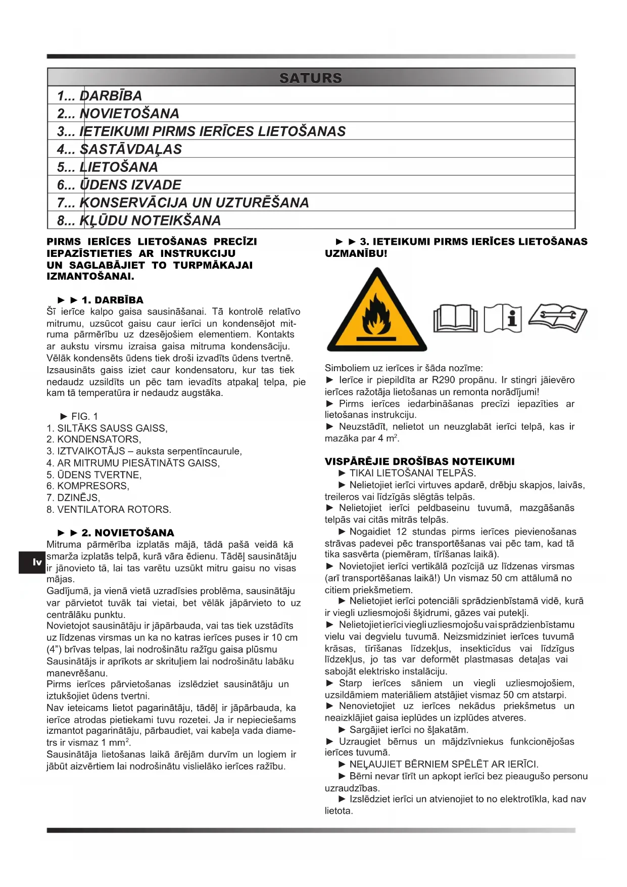 UZMANĪBU! 100*40 mm Simboliem uz ierīces ir šāda nozīme: ► Ierīce ir piepildīta ar R290 propānu. Ir stingri jāievēro ierīces ražotāja lietošanas un remonta norādījumi! ► Pirms ierīces iedarbināšanas precīzi iepazīties ar lietošanas instrukciju. ► Neuzstādīt, nelietot un neuzglabāt ierīci telpā, kas ir mazāka par 4 m