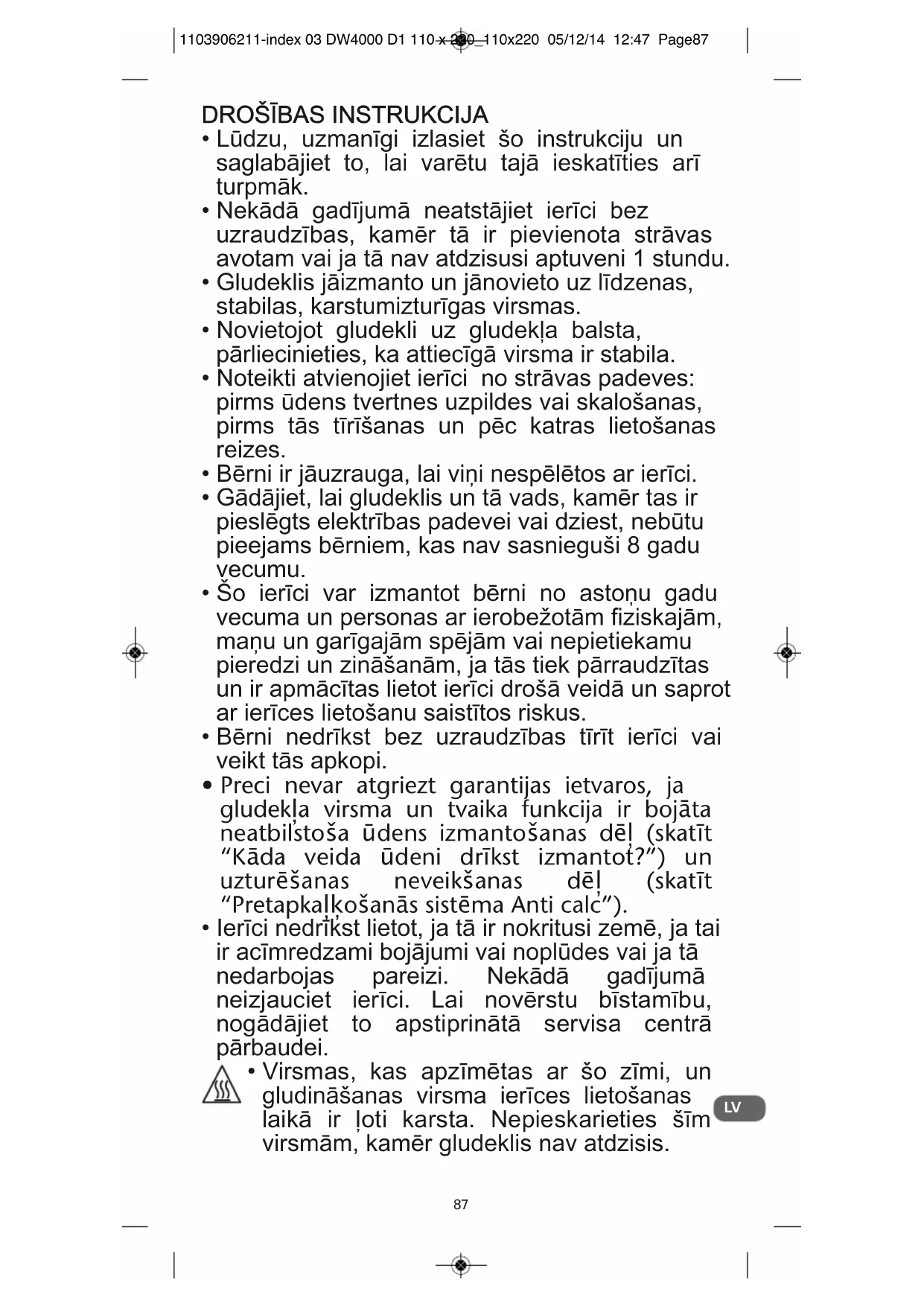 - Virsmas, kas apzīmētas ar šo zīmi, un gludināšanas virsma ierīces lietošanas laikā ir ļoti karsta. Nepieskarieties šīm virsmām, kamēr gludeklis nav atdzisis. 1103906211-index 03 DW4000 D1 110 x 220_110x220 05/12/14 12:47 Page8687
